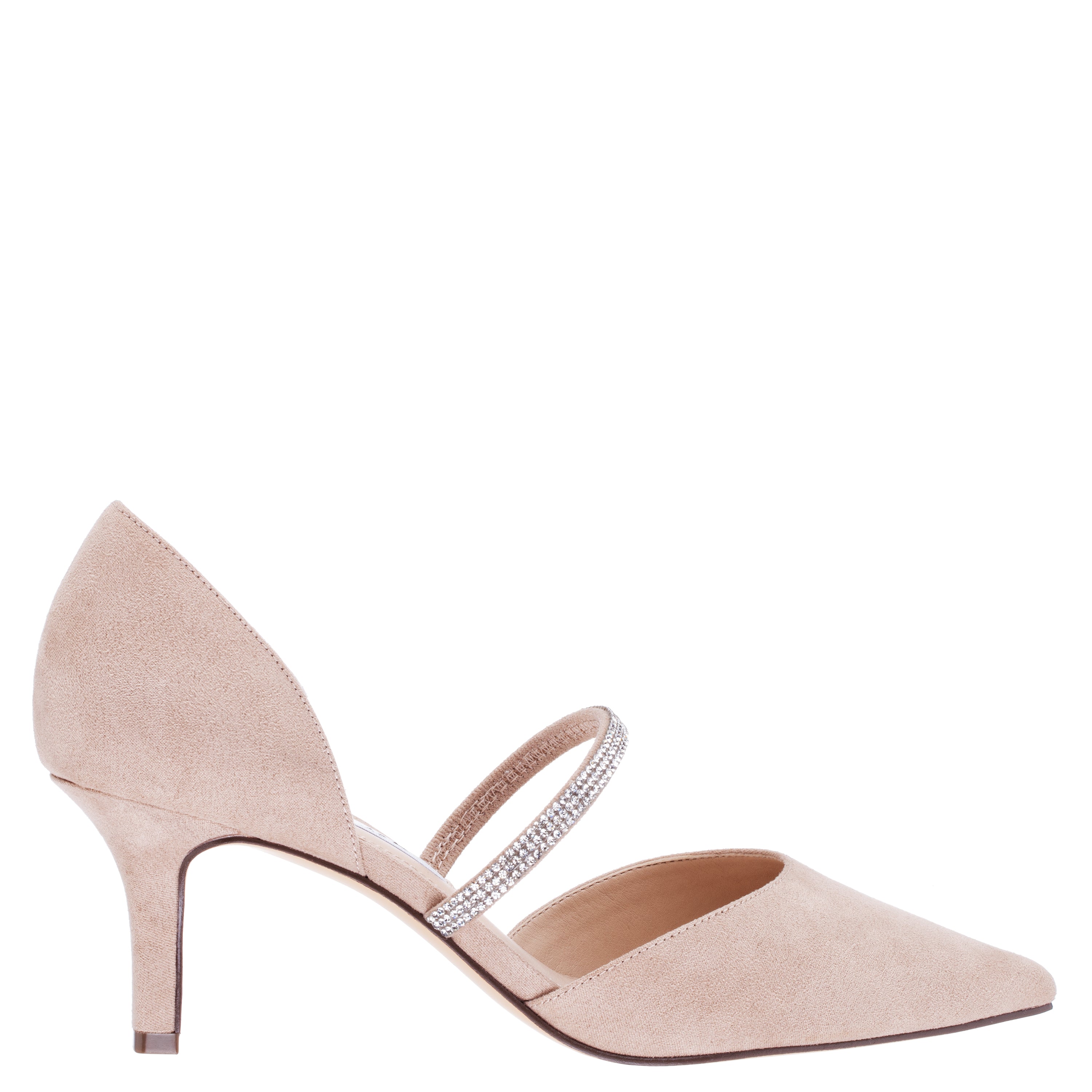 This simply "wow" pointy-toe pump is simply stunning. Brystol by Nina, a d'Orsay two-piece pump, is adorned with a crystal-covered instep strap that compliments any event outfit from trousers to gowns more glamorous. A must-have addition for any shoe wardrobe.