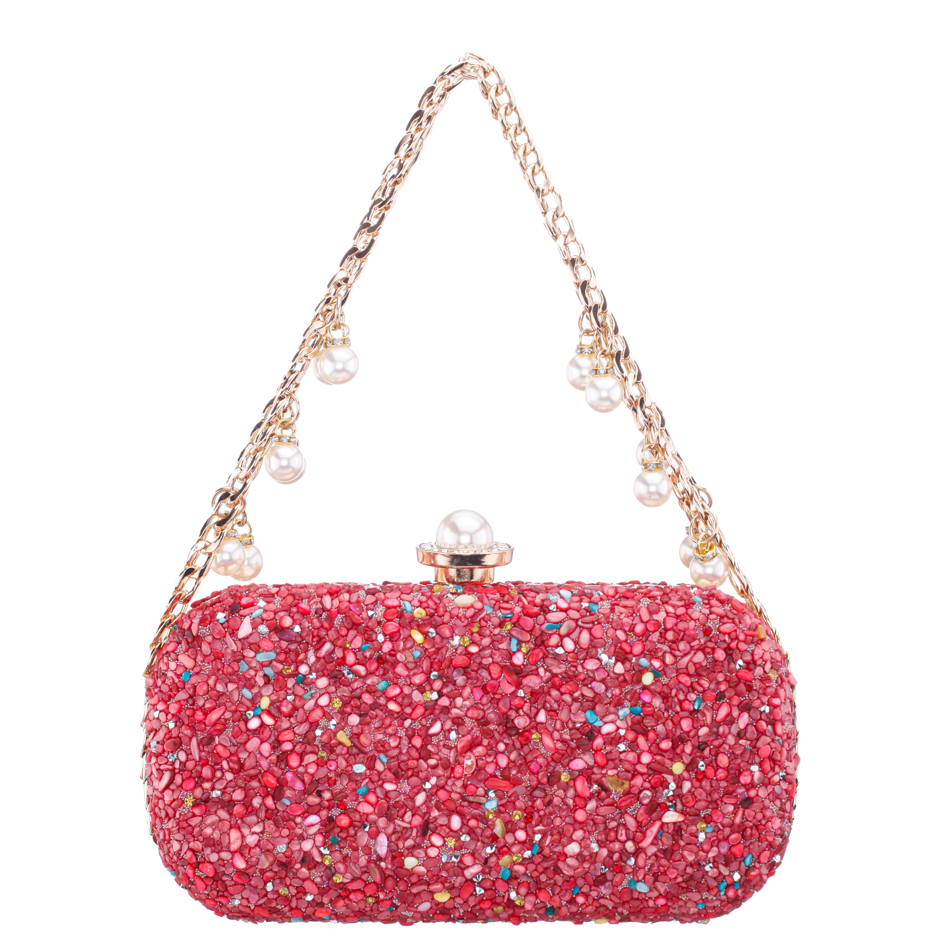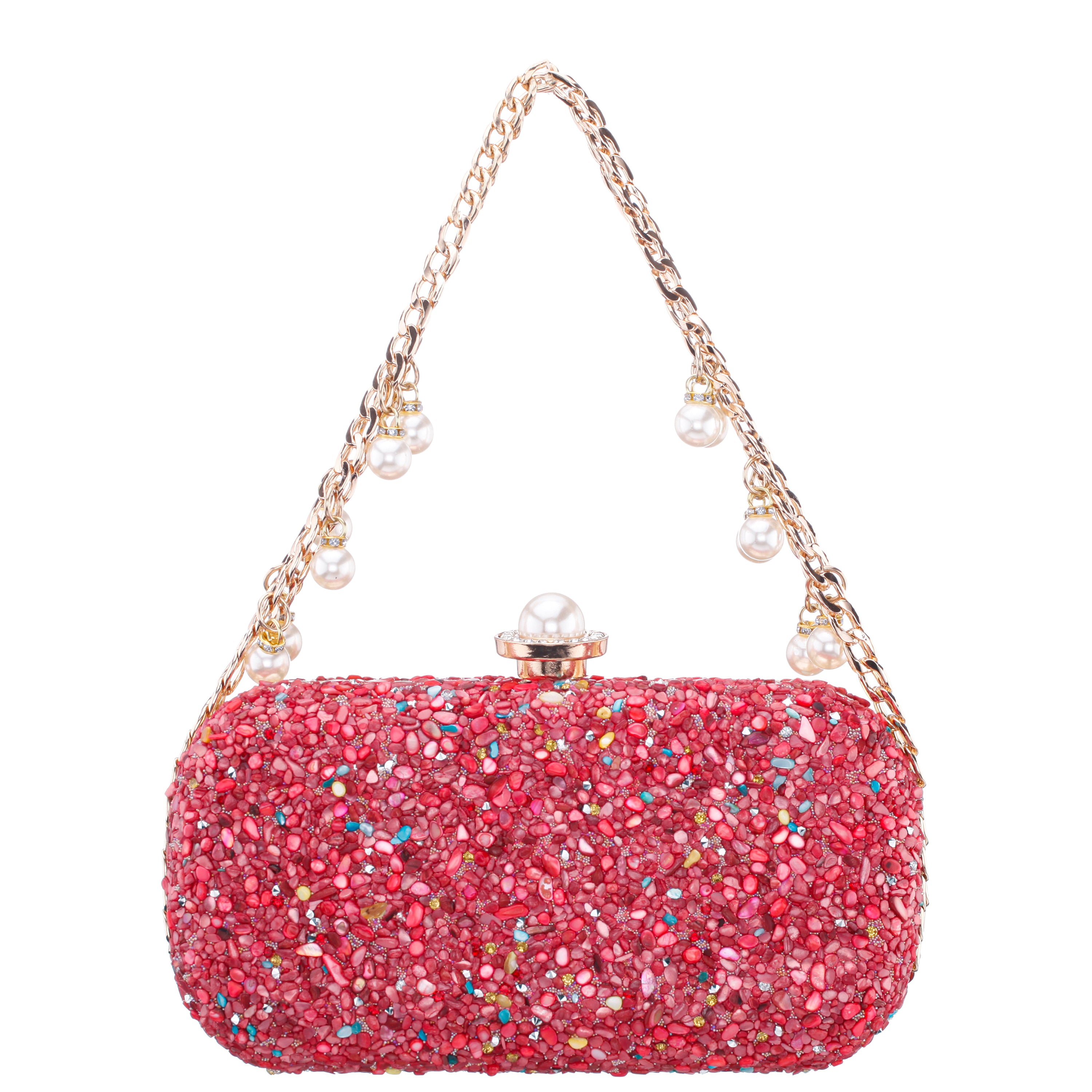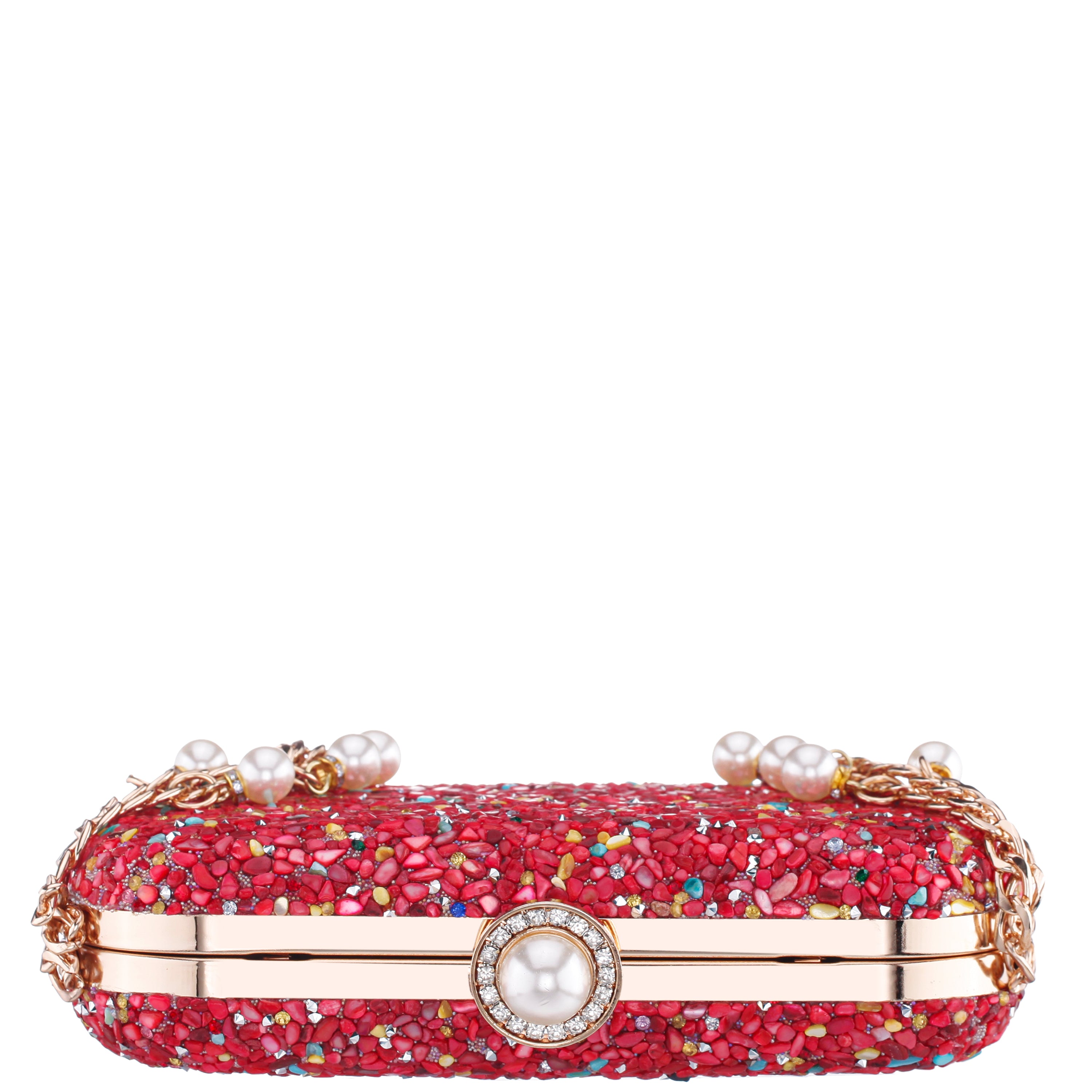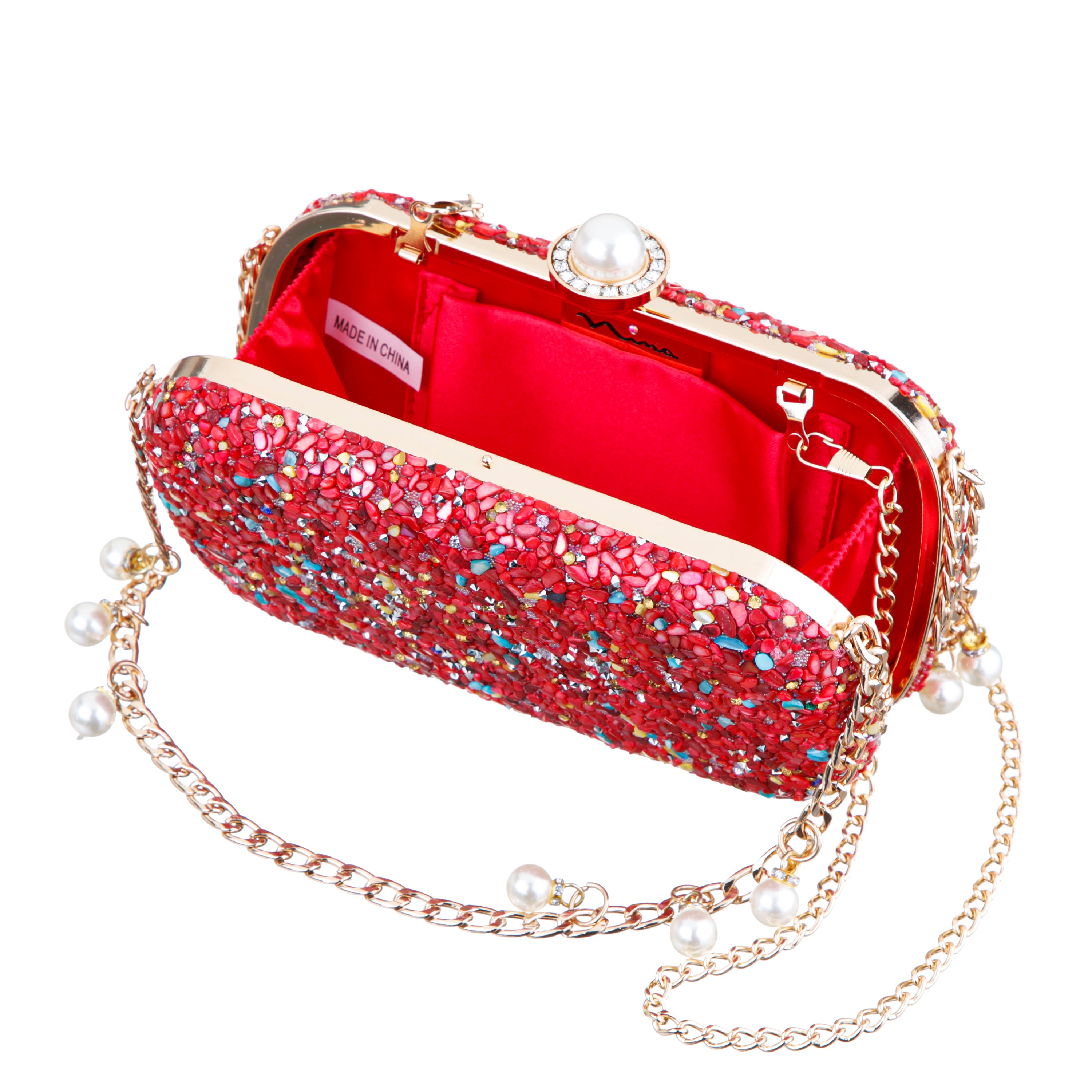 The HARMONY by Nina strikes the perfect chord between elegance and playful vibrance. This standout minaudière is encrusted with multicolor crystals, creating a dazzling mosaic that captures the light—and attention—at every angle. The sleek, compact shape is accented by a polished 5" drop-length metal handle, adding a sculptural, modern edge to its classic silhouette. A lift-lock closure secures the interior, which is lined in satin synthetic fabric and includes a back wall pocket for small essentials. Finished with a detachable 18" chain strap, the HARMONY by Nina offers both glamour and versatility for your most sparkling occasions.