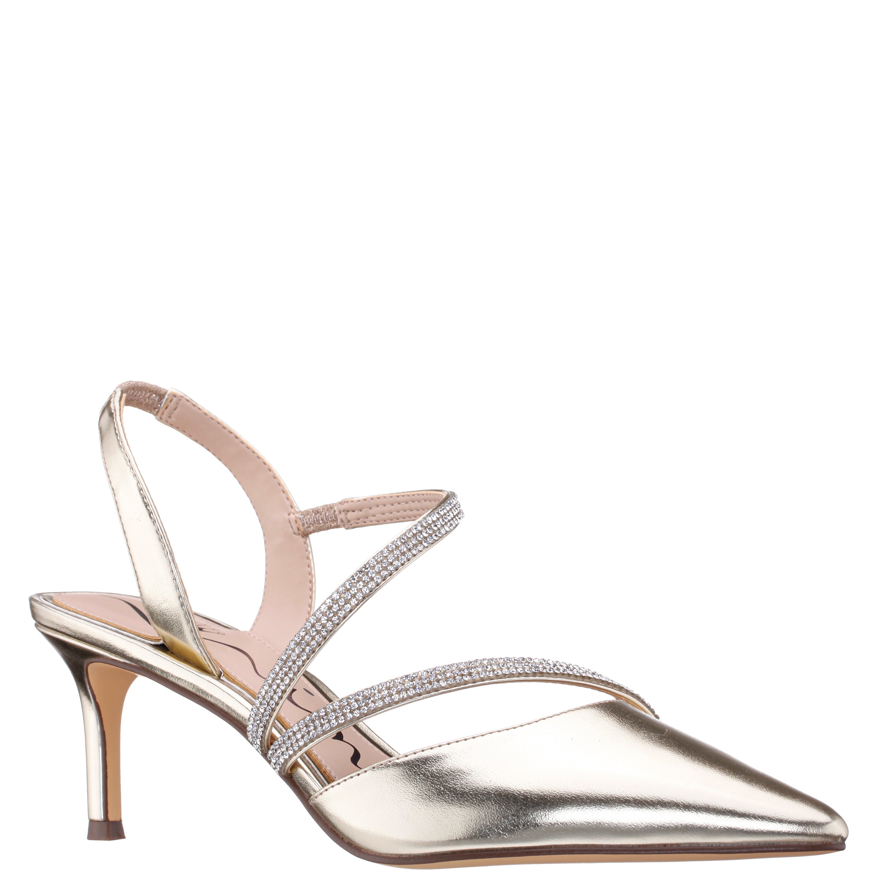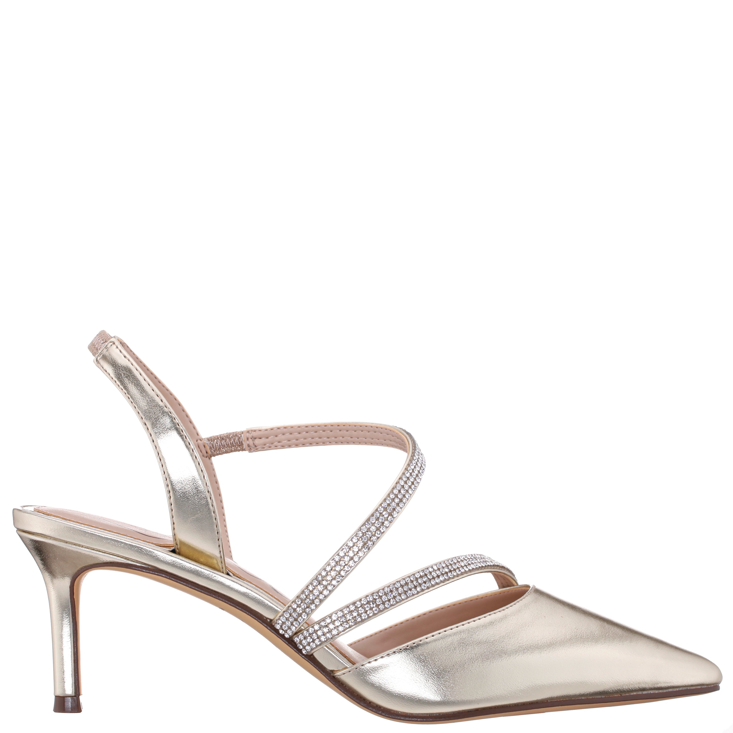 This stunning, pointy-toe classic pump is anything but classic!! Nela by Nina features dazzling asymmetrical crystal straps to illuminate your show-stopping style. Set on a mid-heel to elevate and bring comfort to your every step this pump says simplicity and fabulous in the same breath.