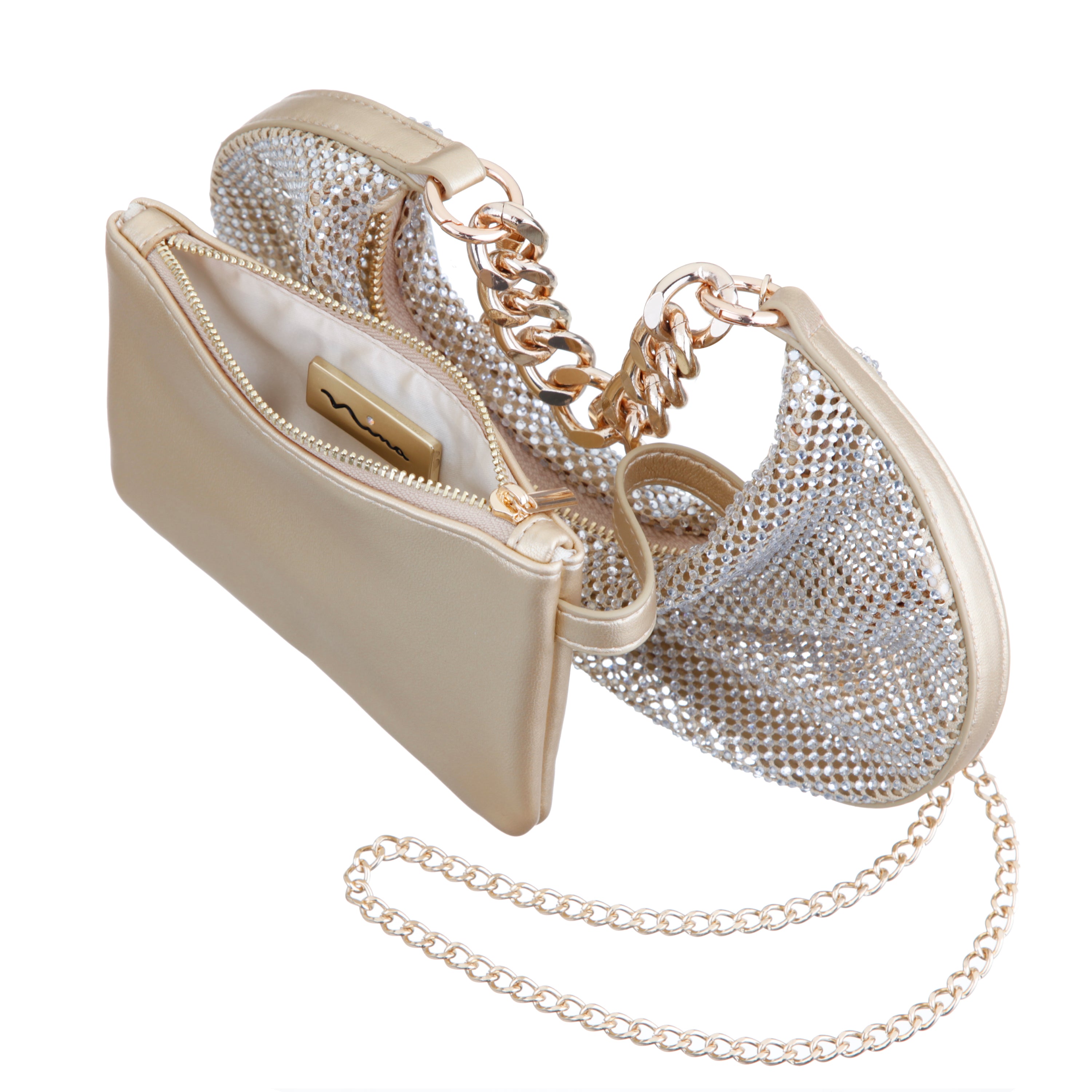 The RACQUEL by Nina is the embodiment of sleek elegance with a bold metallic twist. Featuring a 4" sculptural metal handle and a shimmering surface, this modern clutch-meets-shoulder bag adds instant edge to any ensemble. Its slim yet structured shape makes it perfect for chic evenings out, weddings, or upscale events. A zipper closure keeps your essentials secure, while the inner pouch adds discreet organization. The 24" drop-length chain strap offers a comfortable over-the-shoulder option, or carry it by the glossy metal handle for a more architectural look. Whether worn crossbody or handheld, the RACQUEL by Nina delivers contemporary glamour with effortless charm.