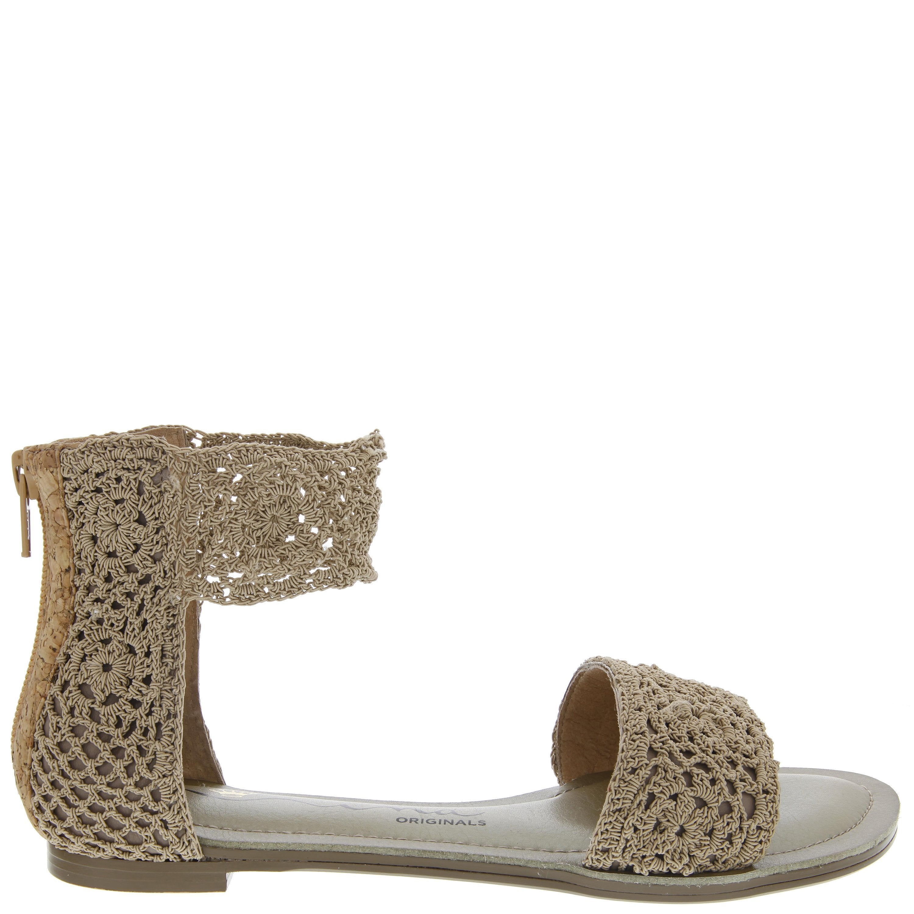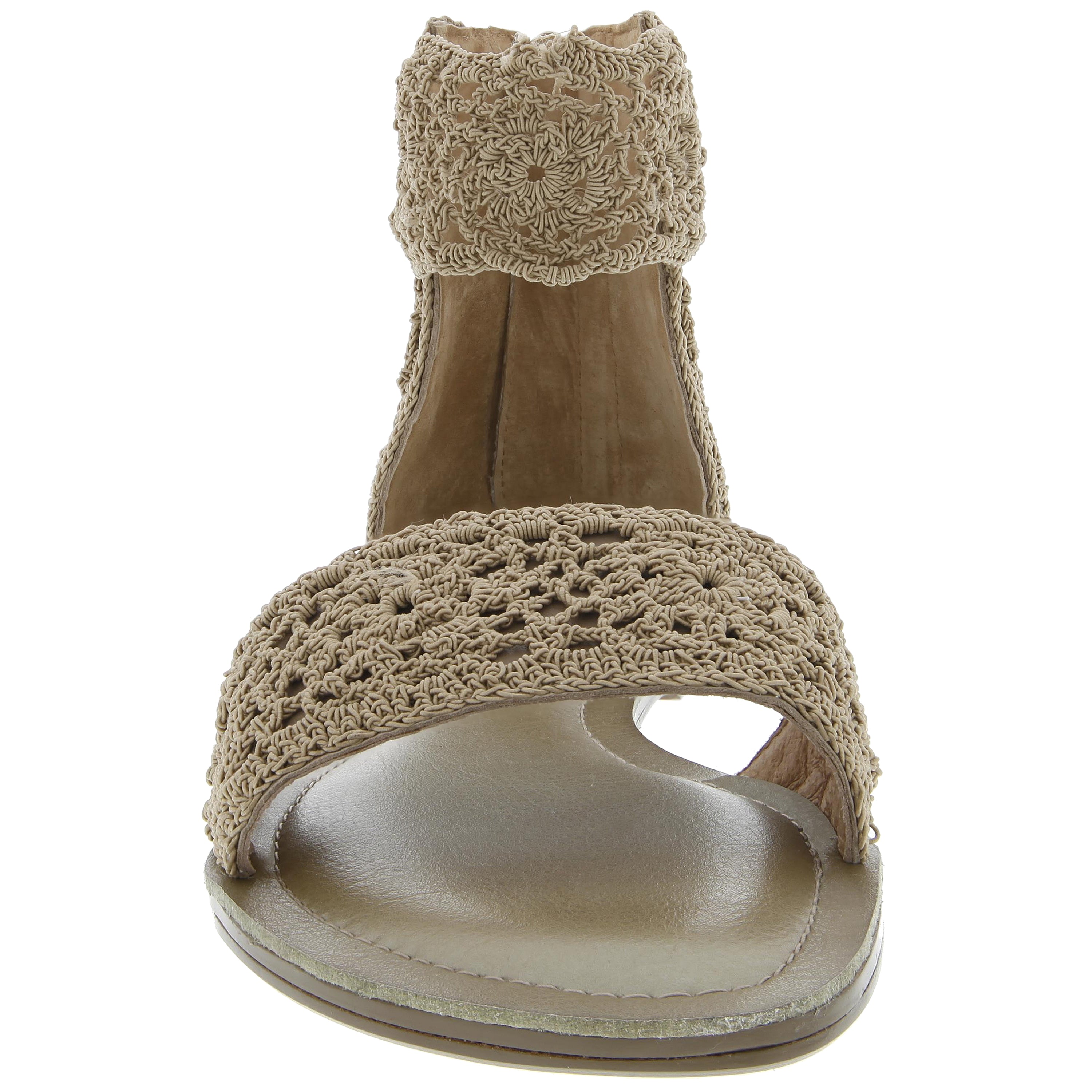 Crocheted two piece sandals with a wide stretch crochet ankle strap and back zipper stitched sock detail.
