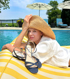 NAVY TEXTURED METALLIC DEMI-WEDGE SANDALS WITH ANKLE-STRAP