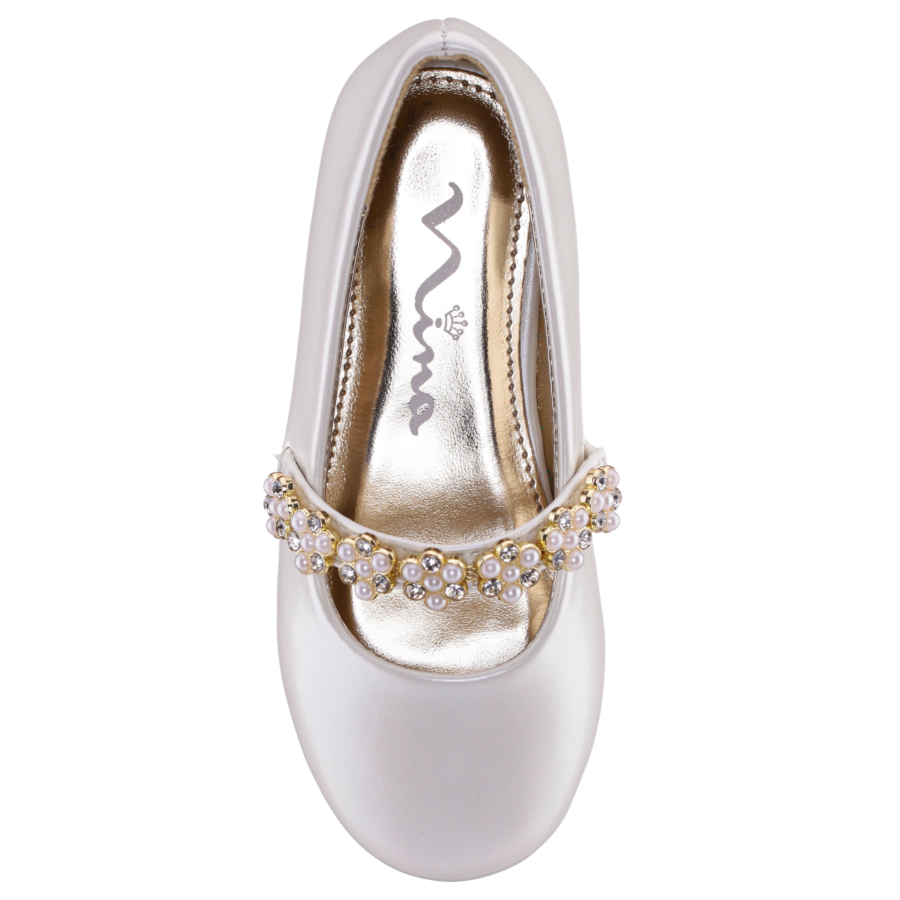 Elegant with a touch of sparkle, JOANSIE by Nina Shoes is a graceful girls ballet flat designed for polished moments and timeless style. Featuring a softly squared toe and refined embellishments with shimmering crystals and faux pearls, this dress-ready flat adds a sophisticated finish to any outfit. A hidden elastic detail ensures a comfortable, secure fit, while the cushioned memory foam insole and flexible non-slip sole keep her feeling confident and comfortable from special celebrations to everyday occasions that call for a little shine.