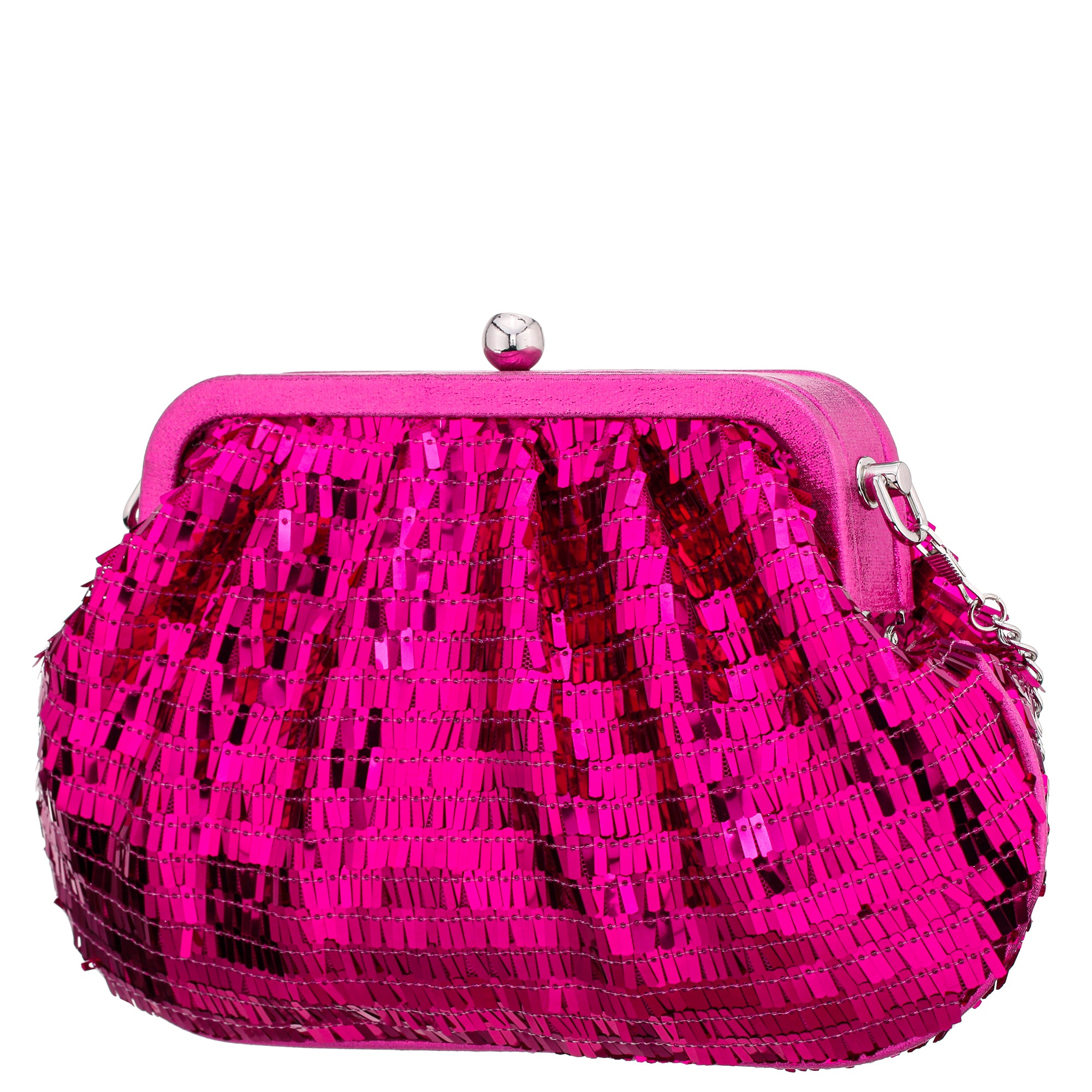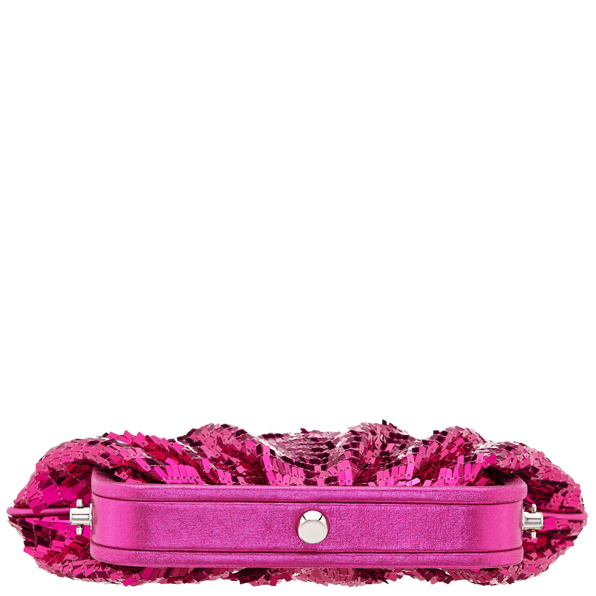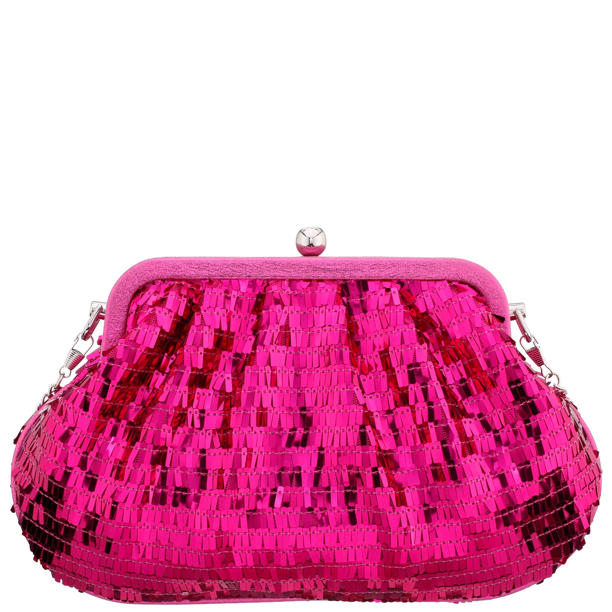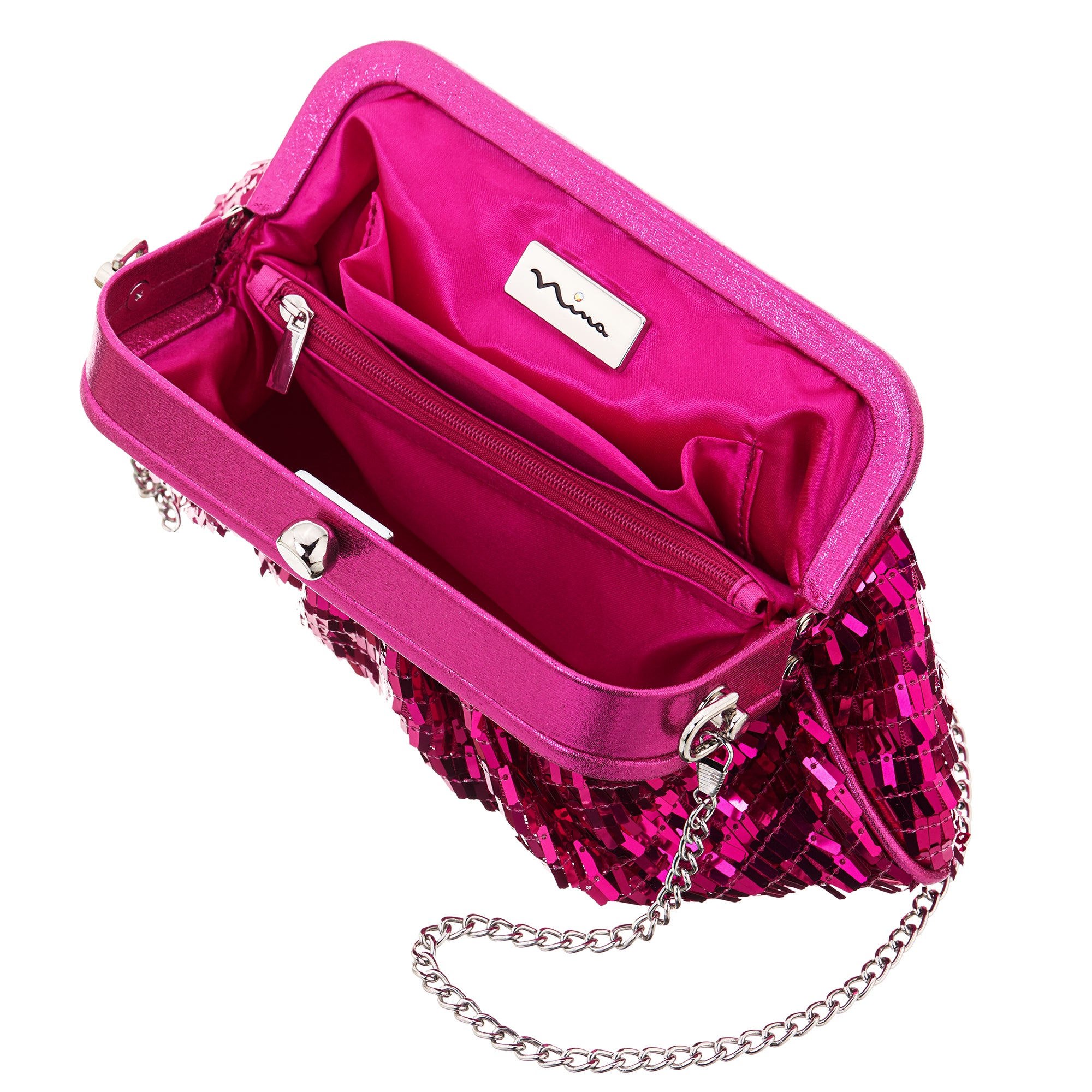 Lustrous sequins and a metallic clasp elevate an event-ready clutch fitted with a drop-in chain strap for hands-free wear.
