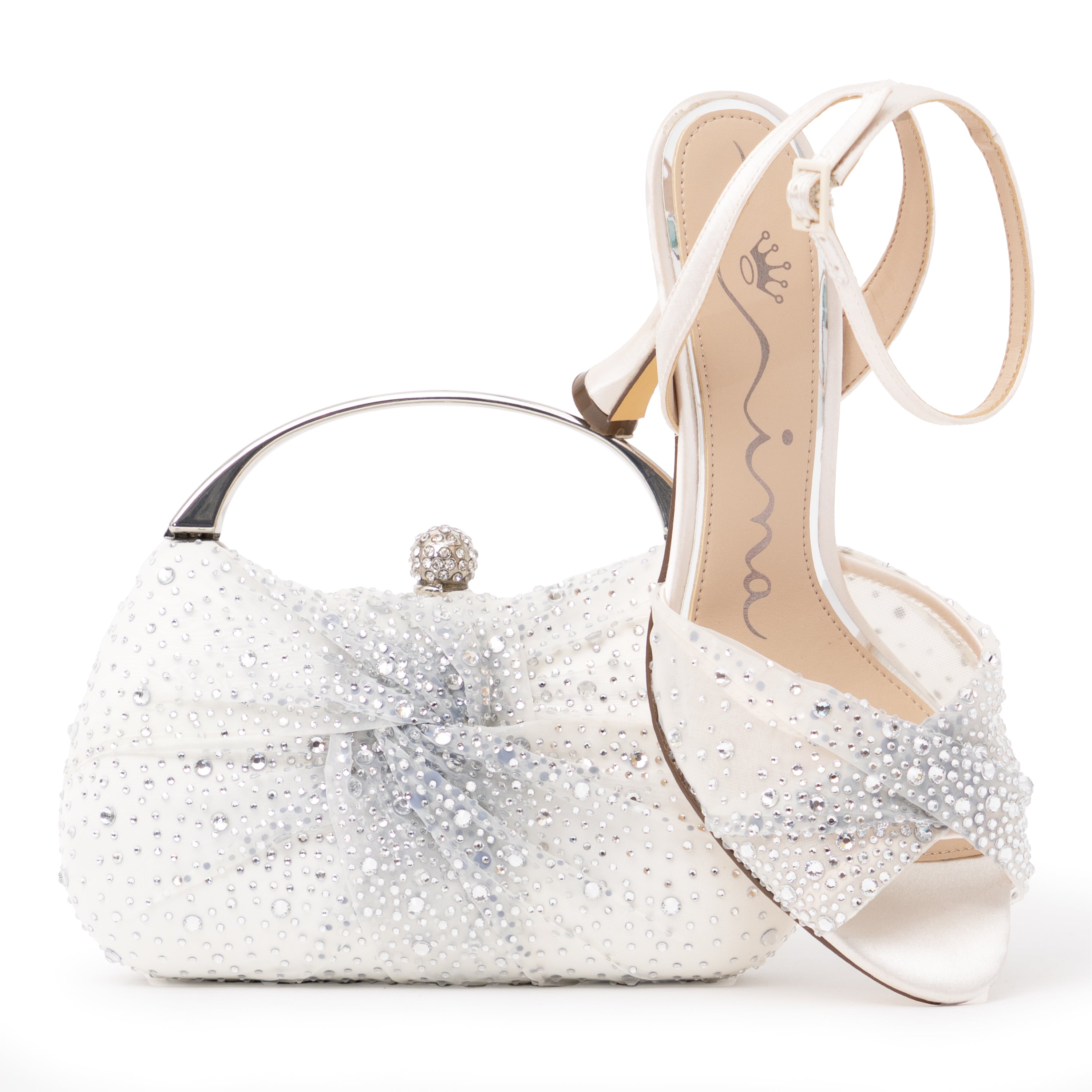 The VIDA by Nina Shoes is designed to make your evening unforgettable, adding a touch of enchantment to every step. This open-toe evening sandal is the perfect finishing touch to your most elegant looks, ensuring you feel radiant and confident at every special occasion. The softly pleated mesh, adorned with light-catching hot fix crystals, sparkles beautifully, while the mid-heel offers both poise and comfort. The delicate satin ankle strap adds a luxurious detail, providing a secure and elegant fit. Whether you're attending a wedding, gala, or formal soirée, let the VIDA complete your look with style and grace, ensuring you shine through the night.