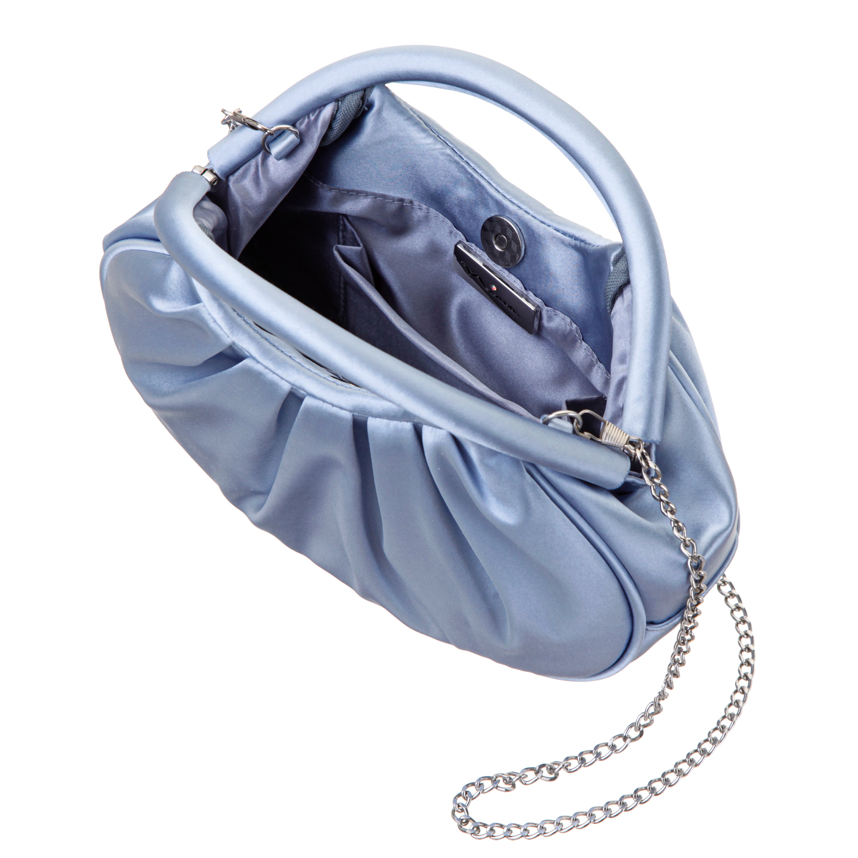 BREN is a modern and chic mini moon satchel, designed to bring a touch of effortless elegance to your evening ensemble. With its curved silhouette and sleek cut-out handle, this bag offers a contemporary twist on classic sophistication. Made from luxurious satin, its smooth, soft texture adds a refined touch to any outfit. The versatile design allows you to carry it as a top-handle bag or wear it as a shoulder bag with the 18" flat curb chain strap. Inside, a satin synthetic fabric lining and back interior wall pocket provide organization and practicality. The hidden magnetic closure maintains the bag’s sleek and seamless aesthetic while keeping your essentials secure. Whether you're attending a wedding, cocktail party, or night out, BREN by Nina is the perfect accessory for a modern, sophisticated look. For complementary styles, explore our satin shop or browse our newest arrivals.