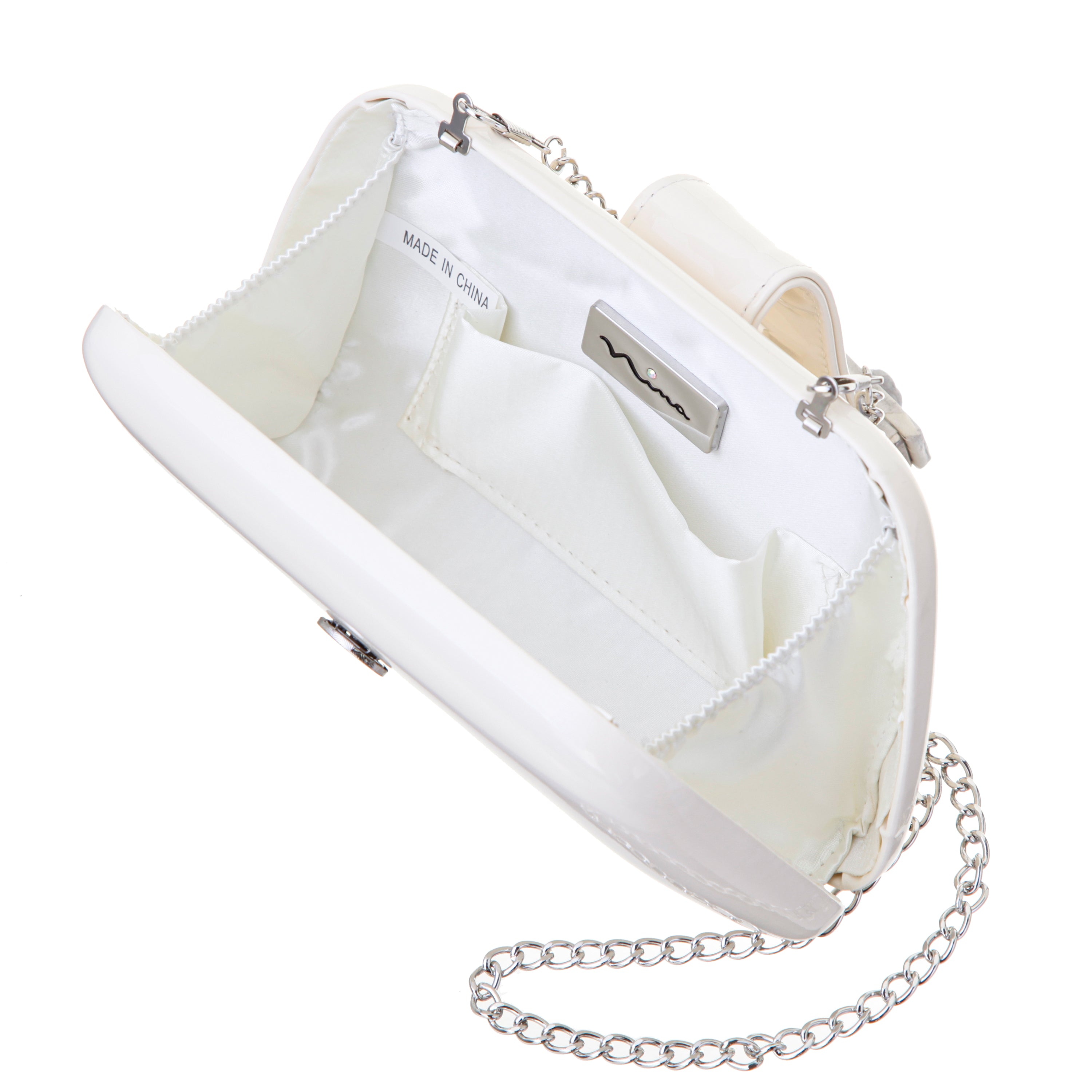 DANNI is the ultimate sleek and sophisticated minaudiere, designed to bring an element of glamour and elegance to any occasion. Featuring a large crystal-embellished tab closure, this clutch makes a bold statement while maintaining a classic and refined aesthetic. Whether you're attending a formal event, wedding, or cocktail party, this compact yet functional minaudiere is perfect for carrying your night-out essentials. The smooth satin or patent PU finish, paired with silver-tone hardware, exudes luxury, while the 18" drop-in curb chain strap offers the versatility of hands-free carrying. Inside, a satin synthetic fabric lining and back interior wall pocket provide both style and practicality. DANNI by Nina is the perfect blend of timeless sophistication and modern sparkle. For complementary styles, explore our satin shop or browse our newest arrivals.