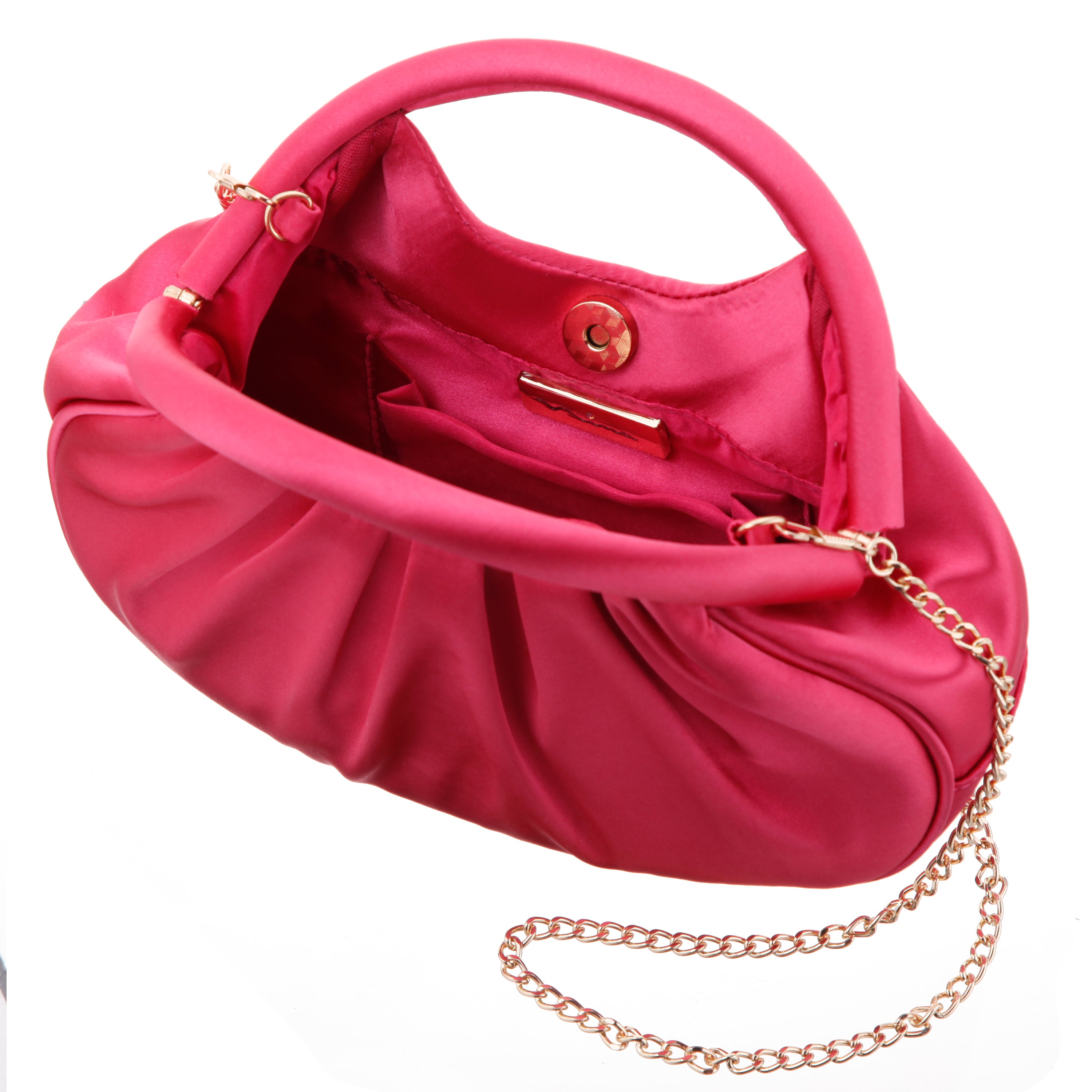 BREN is a modern and chic mini moon satchel, designed to bring a touch of effortless elegance to your evening ensemble. With its curved silhouette and sleek cut-out handle, this bag offers a contemporary twist on classic sophistication. Made from luxurious satin, its smooth, soft texture adds a refined touch to any outfit. The versatile design allows you to carry it as a top-handle bag or wear it as a shoulder bag with the 18" flat curb chain strap. Inside, a satin synthetic fabric lining and back interior wall pocket provide organization and practicality. The hidden magnetic closure maintains the bag’s sleek and seamless aesthetic while keeping your essentials secure. Whether you're attending a wedding, cocktail party, or night out, BREN by Nina is the perfect accessory for a modern, sophisticated look. For complementary styles, explore our satin shop or browse our newest arrivals.
