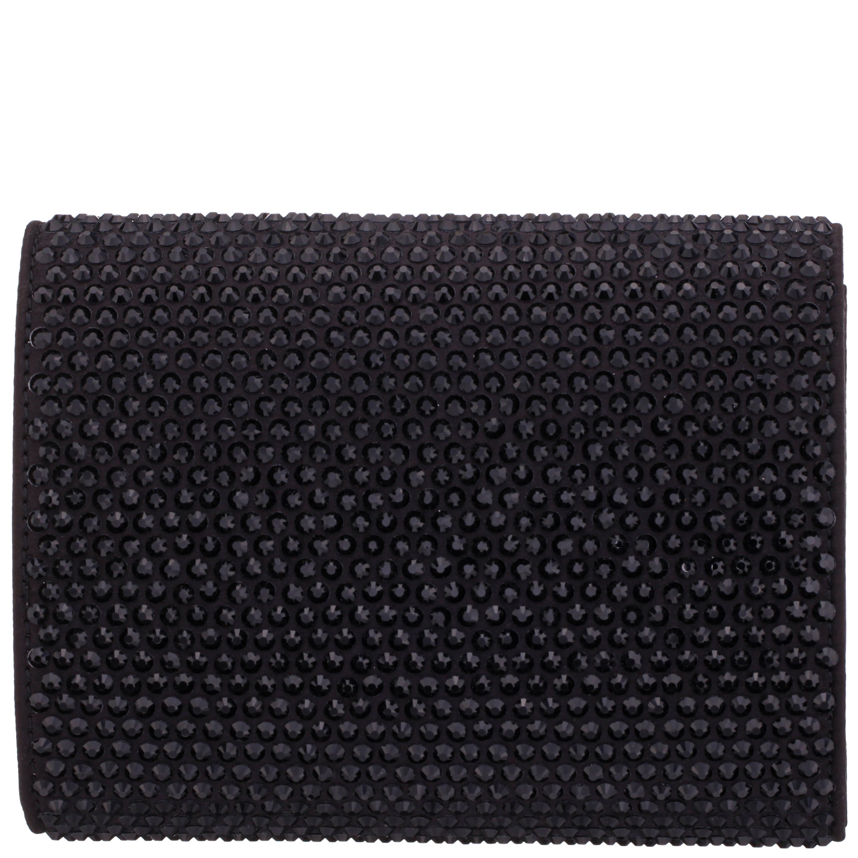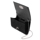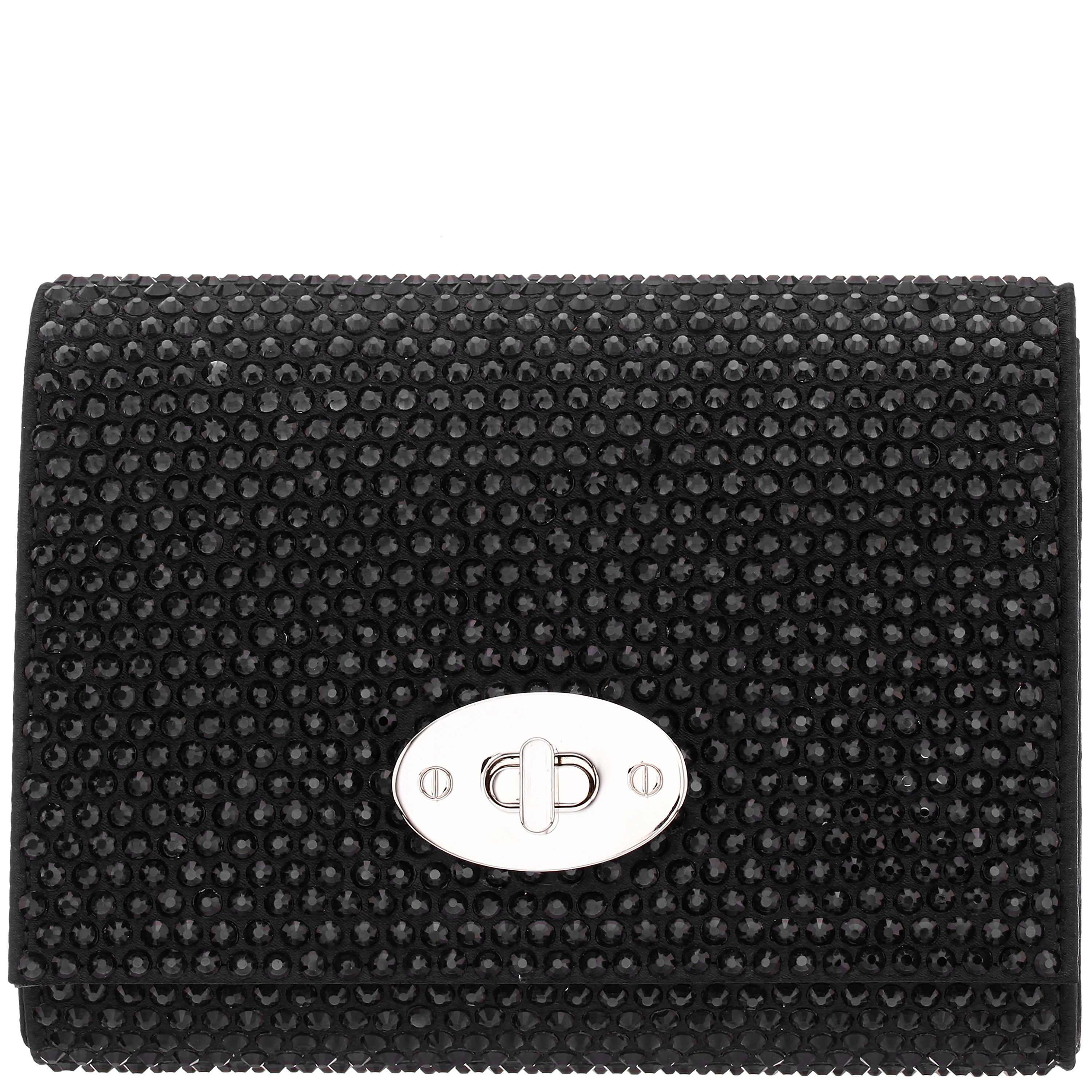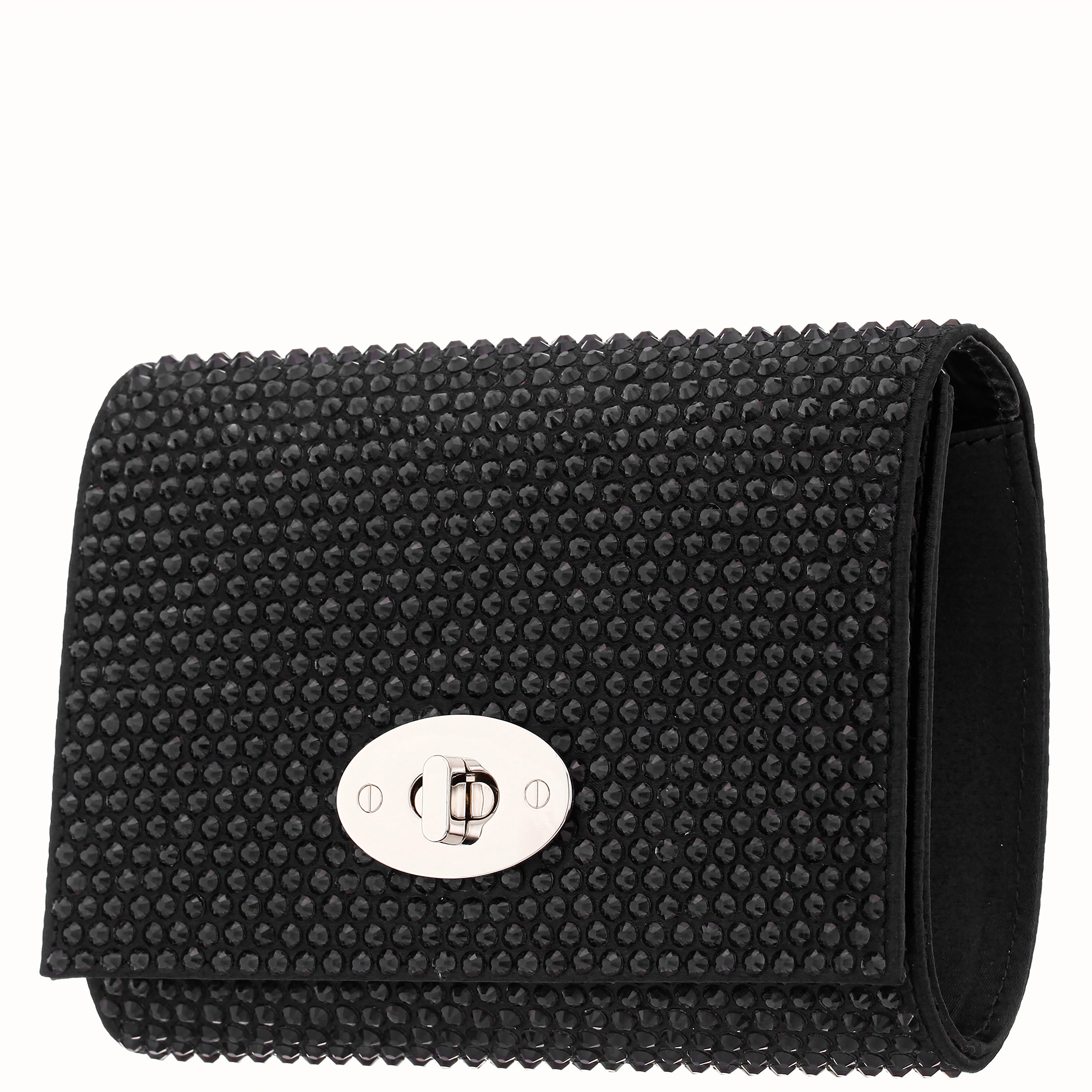 A jewel-encrusted exterior underscores the glamorous appeal of an evening-ready flap clutch with turn-lock closure, fitted with an optional chain strap for hands-free carry.