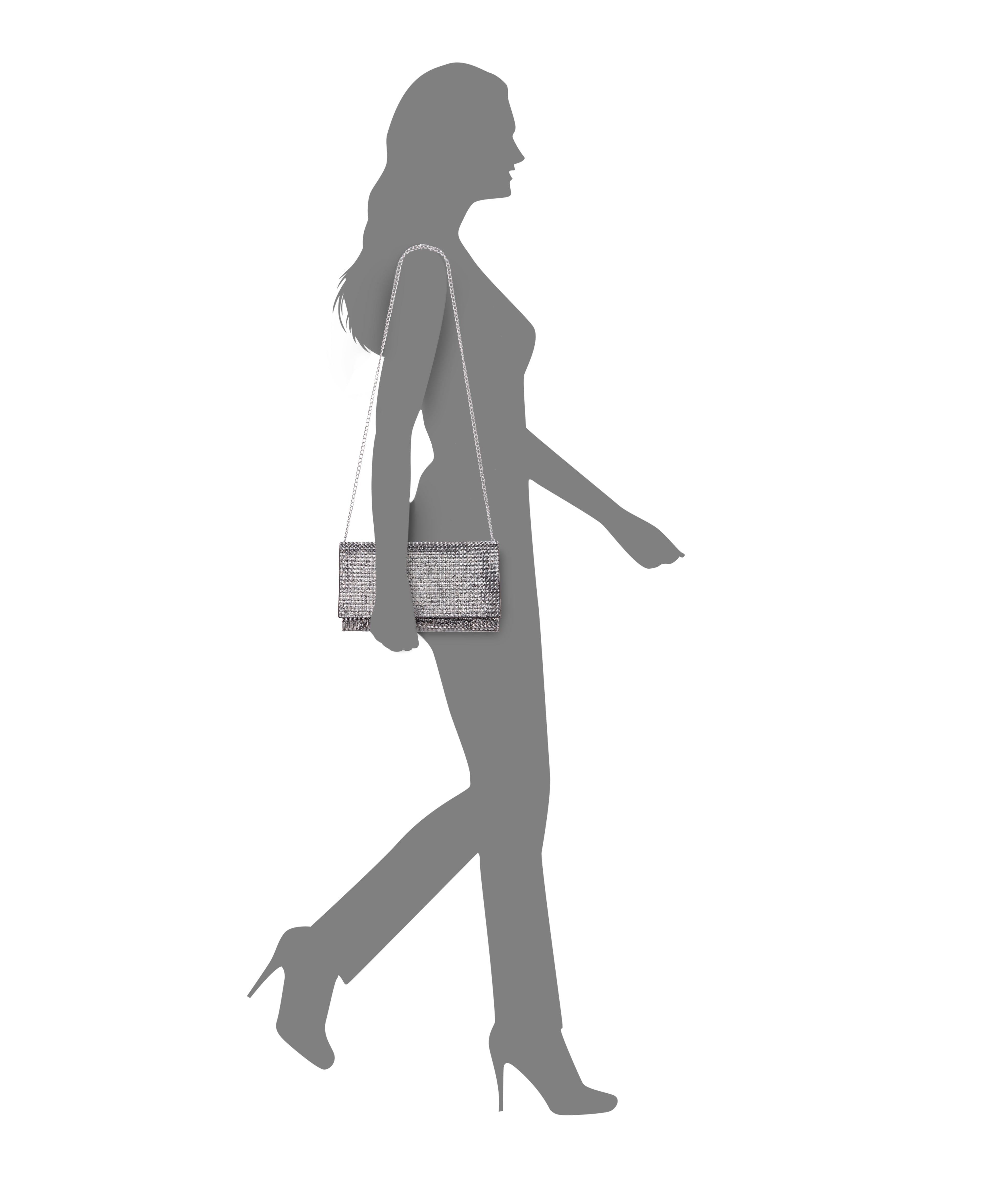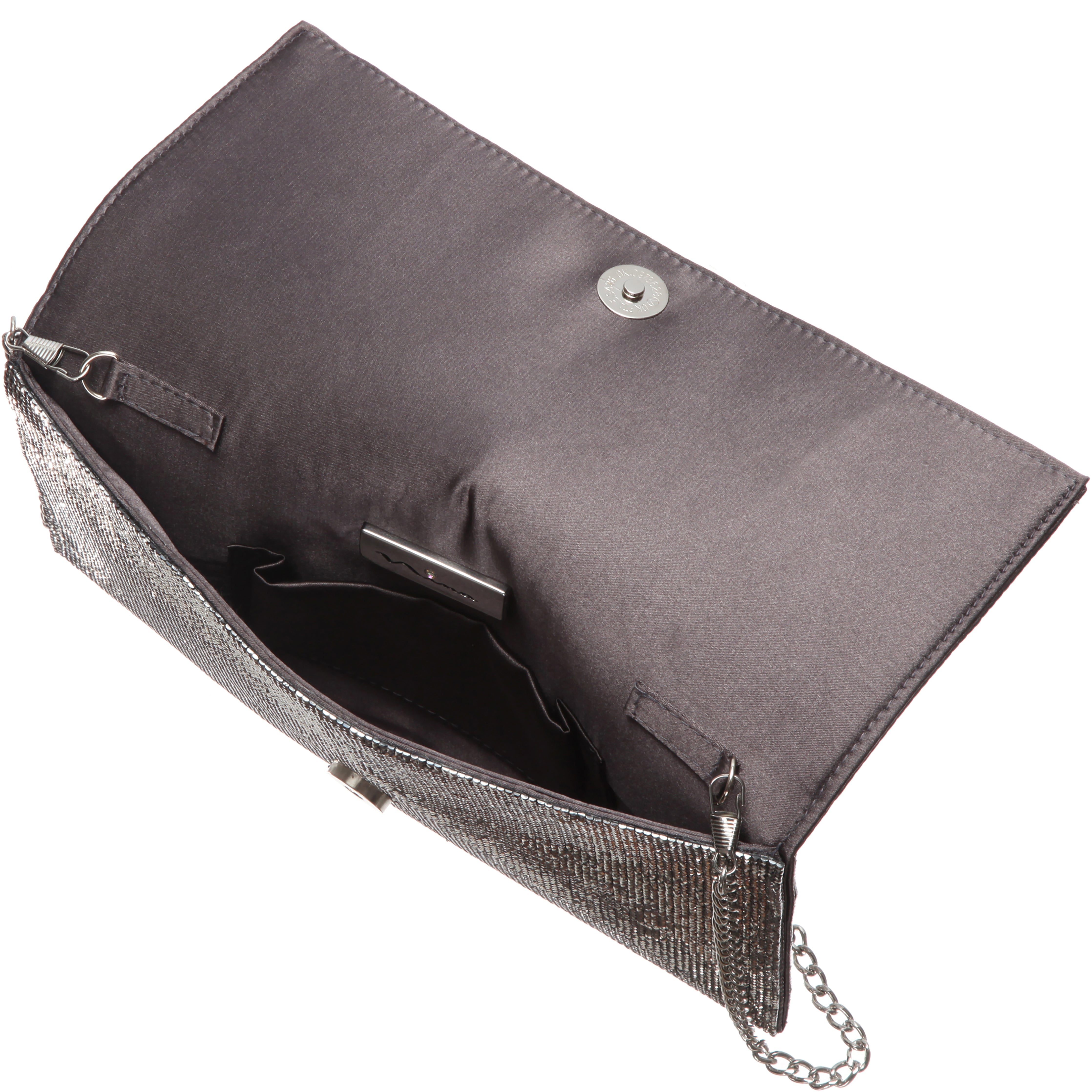 The KIMORA by Nina is the epitome of glamour, designed to make every occasion sparkle. This allover crystal-encrusted envelope clutch delivers a dazzling statement with its brilliant glass crystal embellishments, catching the light from every angle. Its sleek, structured silhouette offers a contemporary edge, while the magnetic snap closure ensures both style and security. The satin-lined interior includes a back wall pocket for effortless organization of your essentials. Carry it as a clutch for an elegant touch, or drape it over your shoulder with the 22" flat curb chain strap for a hands-free look. Whether you're attending a wedding, gala, or night out, the KIMORA ensures you shine with every step. For complementary styles, explore our satin shop or browse our newest arrivals.