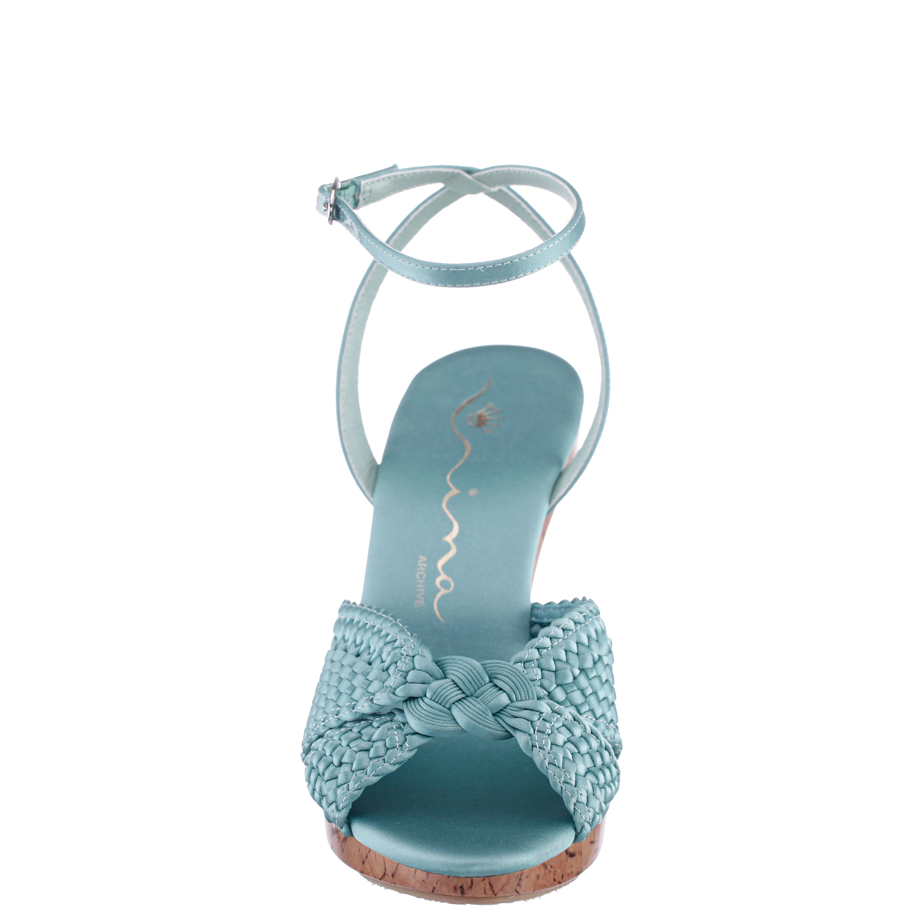 EMPIRE by Nina Shoes – Limited run!Vibrant jewel tones in handwoven satin make this ankle-strap sandal a standout. The unlined vamp and adjustable ankle strap provide a flattering and comfortable fit, while the full memory foam insole ensures all-day ease. Designed with a faux cork rocker bottom and a vintage-inspired metal heel, the EMPIRE channels retro charm with a modern twist. Just the right balance of sweet and spice, this sandal is made to shine.