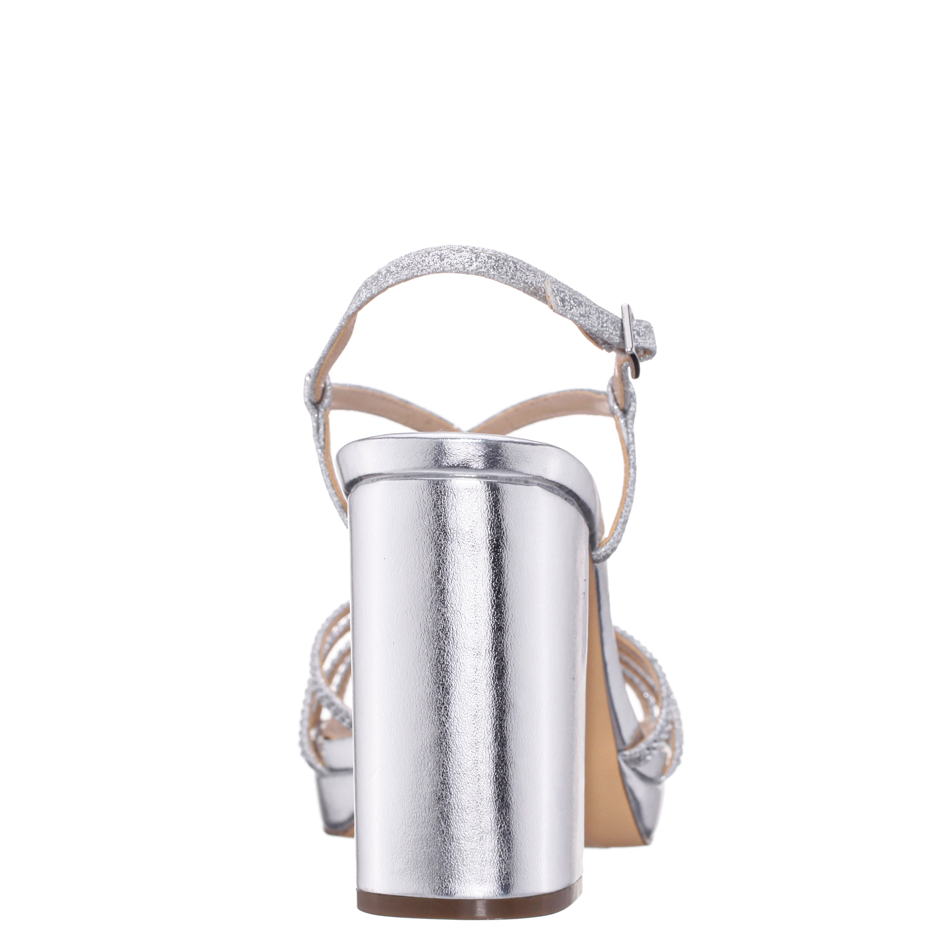 A bold metallic platform and chunky heel add scene-stealing style to Summer by Nina, whose dazzling hot-fix crystals illuminate the slender straps as they create a flattering pattern that elongates the leg. The sturdy heel and platform provides a stable, comfortable fit for when you're dressing up or dressing down.