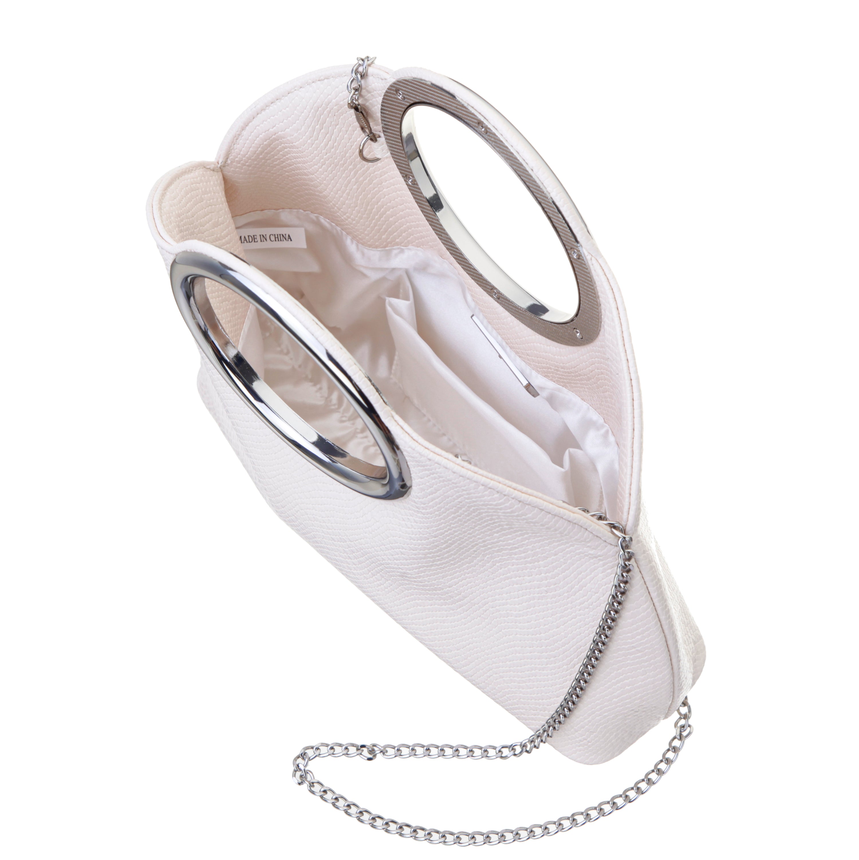 The CHER by Nina is a bold statement piece that exudes modern luxury with a touch of edgy sophistication. Designed with a curved silhouette and embossed snake-textured body, this bag is both eye-catching and versatile. The sleek metal handles, with a 4β drop length, offer a chic way to carry, while the 18β flat curb chain strap provides an elegant shoulder-carry option. Secured with a magnetic snap closure, it opens to a satin-lined interior with a back wall pocket for effortless organization. Whether paired with a glamorous evening ensemble or an upscale daytime look, the CHER is the perfect accessory to elevate any outfit. For complementary styles, explore our satin shop or browse our newest arrivals.