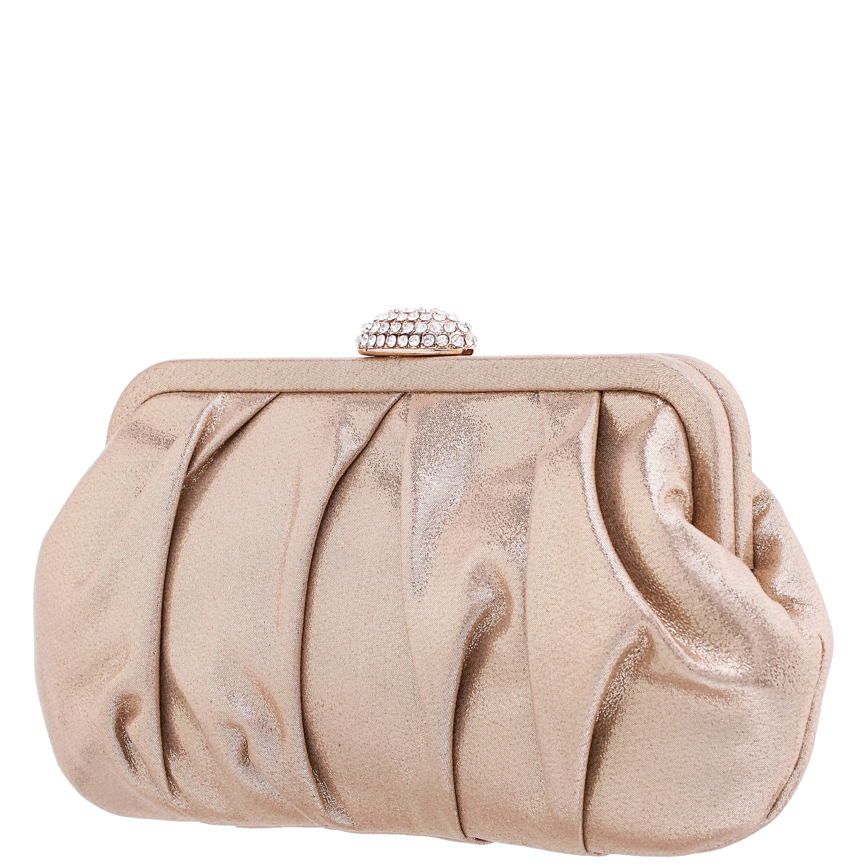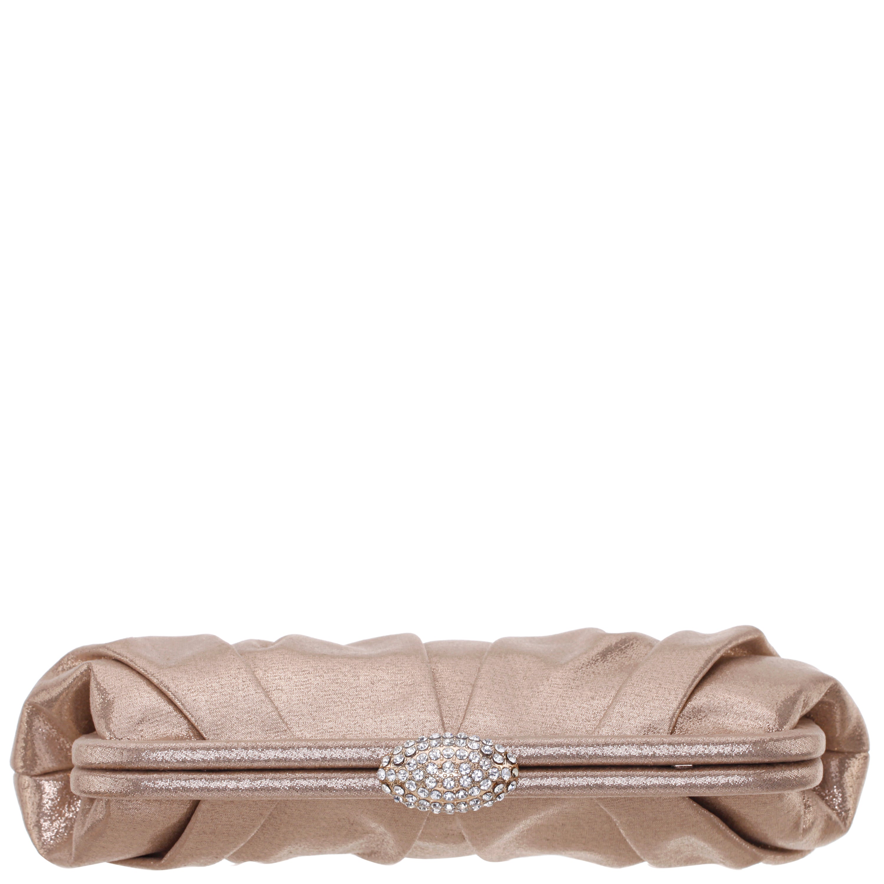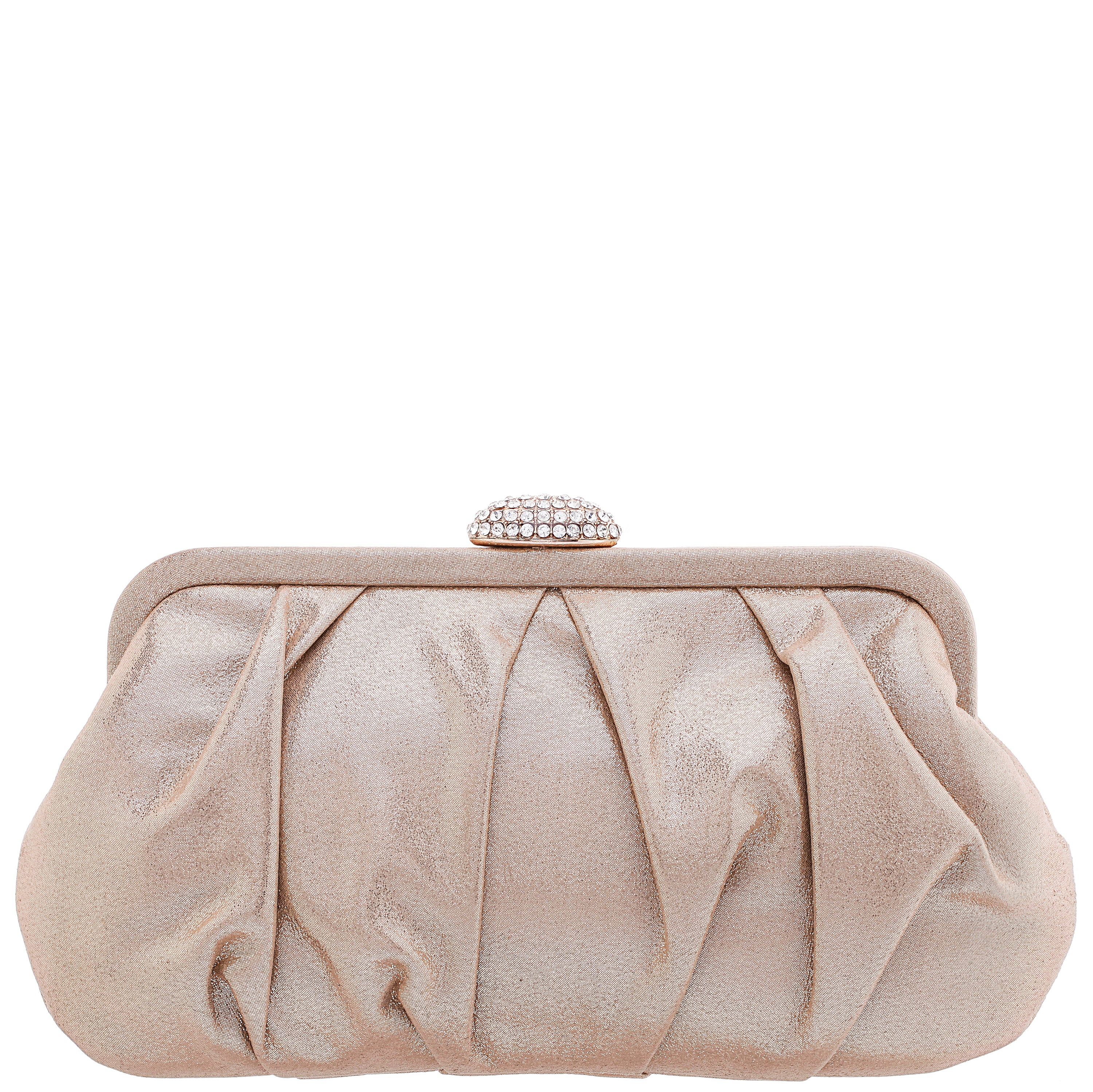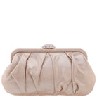 TAUPE PLEATED FRAME CLUTCH WITH CRYSTAL CLASP