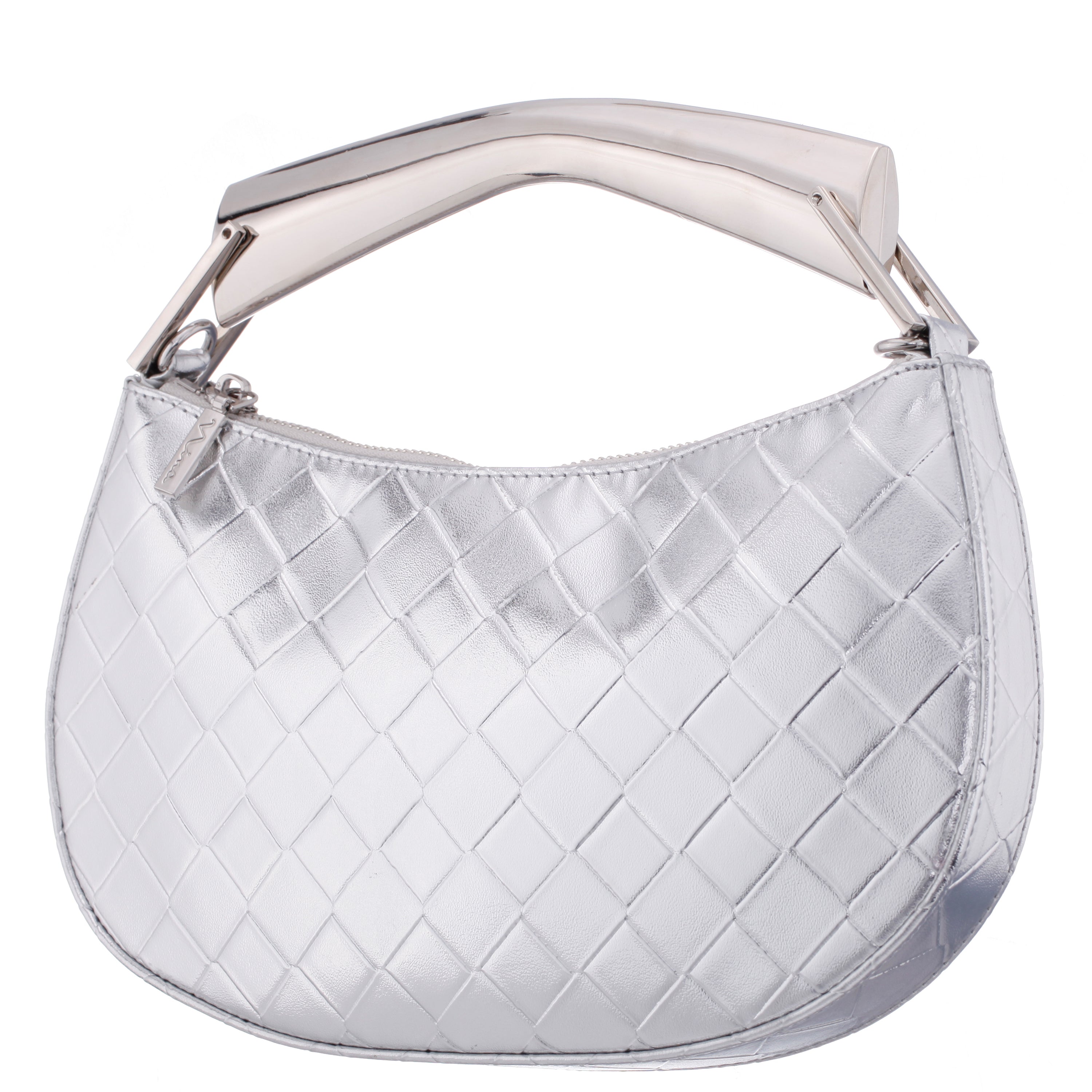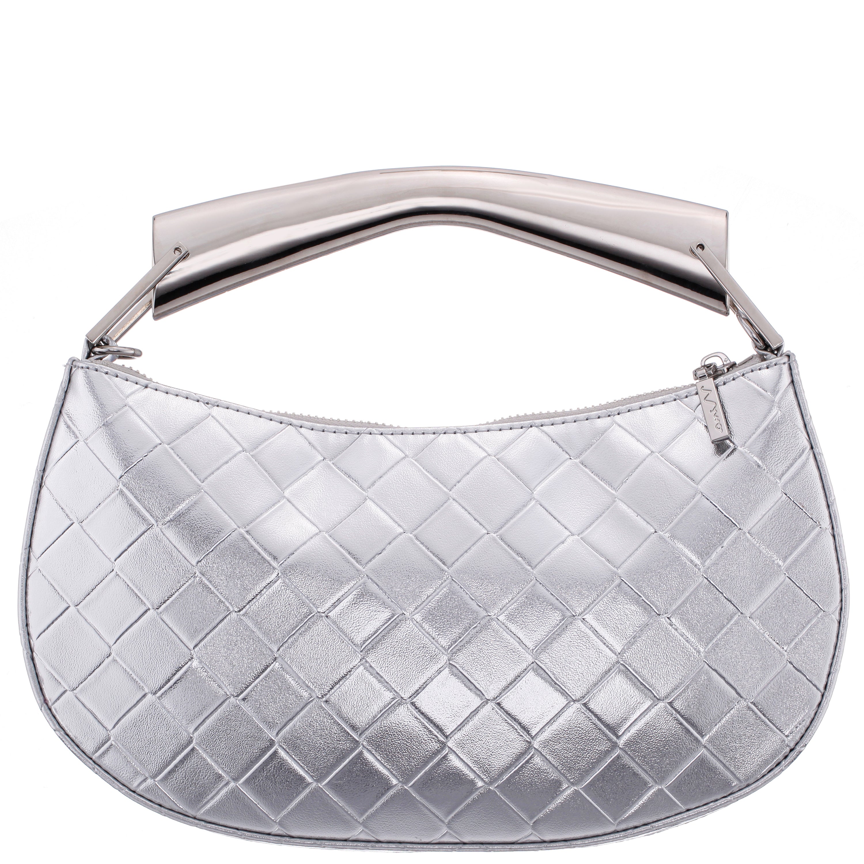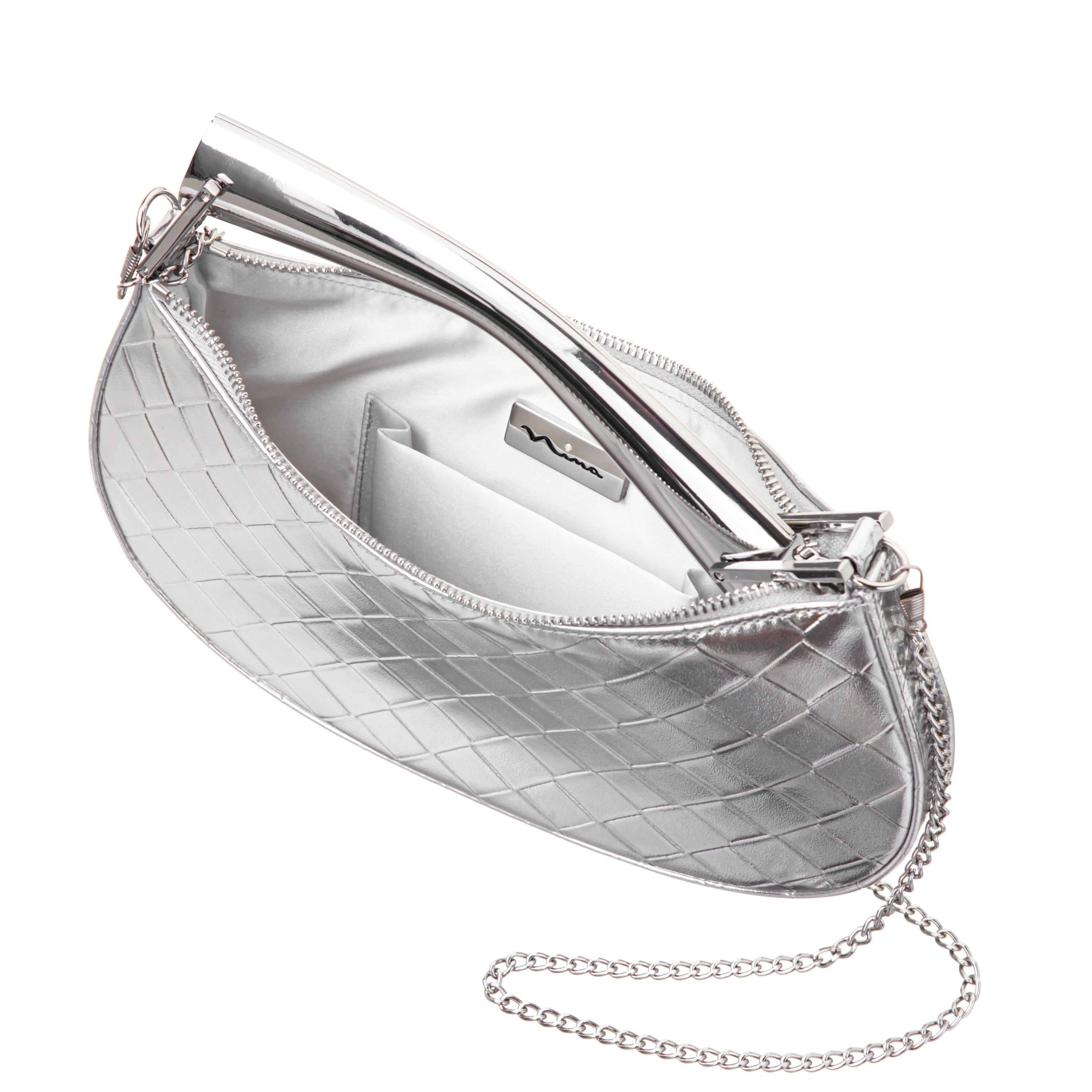 The CORY by Nina is the ultimate blend of modern elegance and artistic craftsmanship. Designed with a sleek half-moon silhouette, this stunning bag features an embossed woven texture that adds depth and dimension to its metallic faux leather body. The sculpted metal handle, with a 3" drop length, enhances its sophisticated appeal, while the 18" flat curb chain strap offers a stylish hands-free carrying option. Secured with a smooth zipper closure, the satin-lined interior includes a back wall pocket for easy organization. Perfect for evening soirées, upscale events, or adding a polished touch to your ensemble, the CORY is a true statement accessory. For complementary styles, explore our satin shop or browse our newest arrivals.