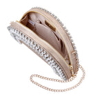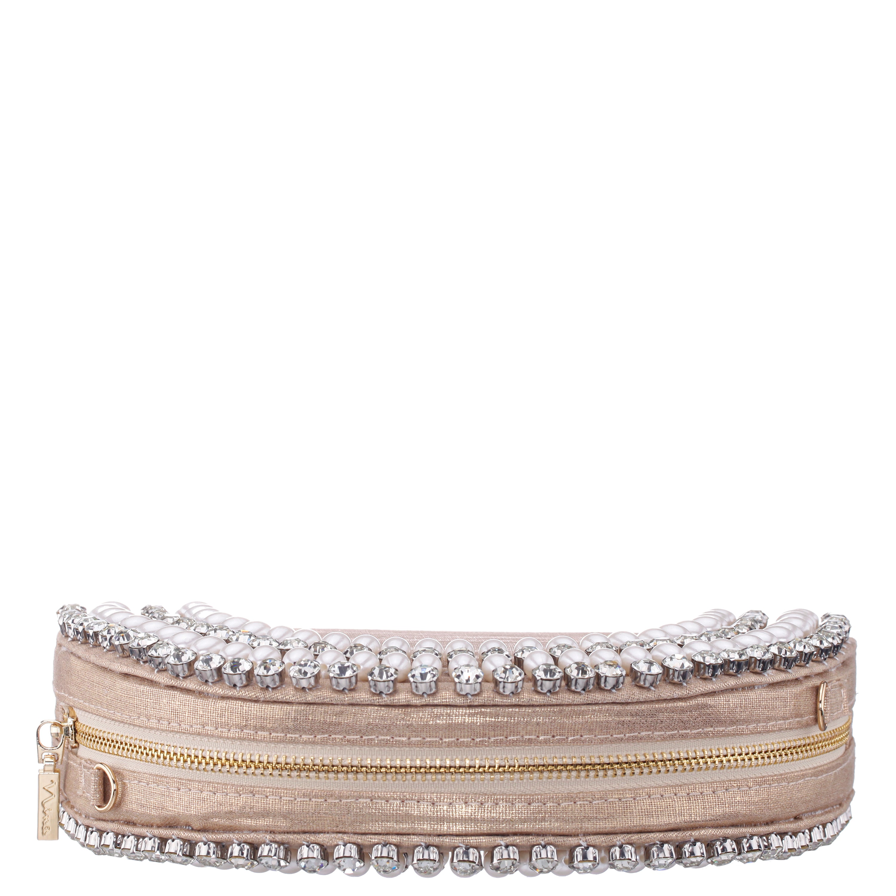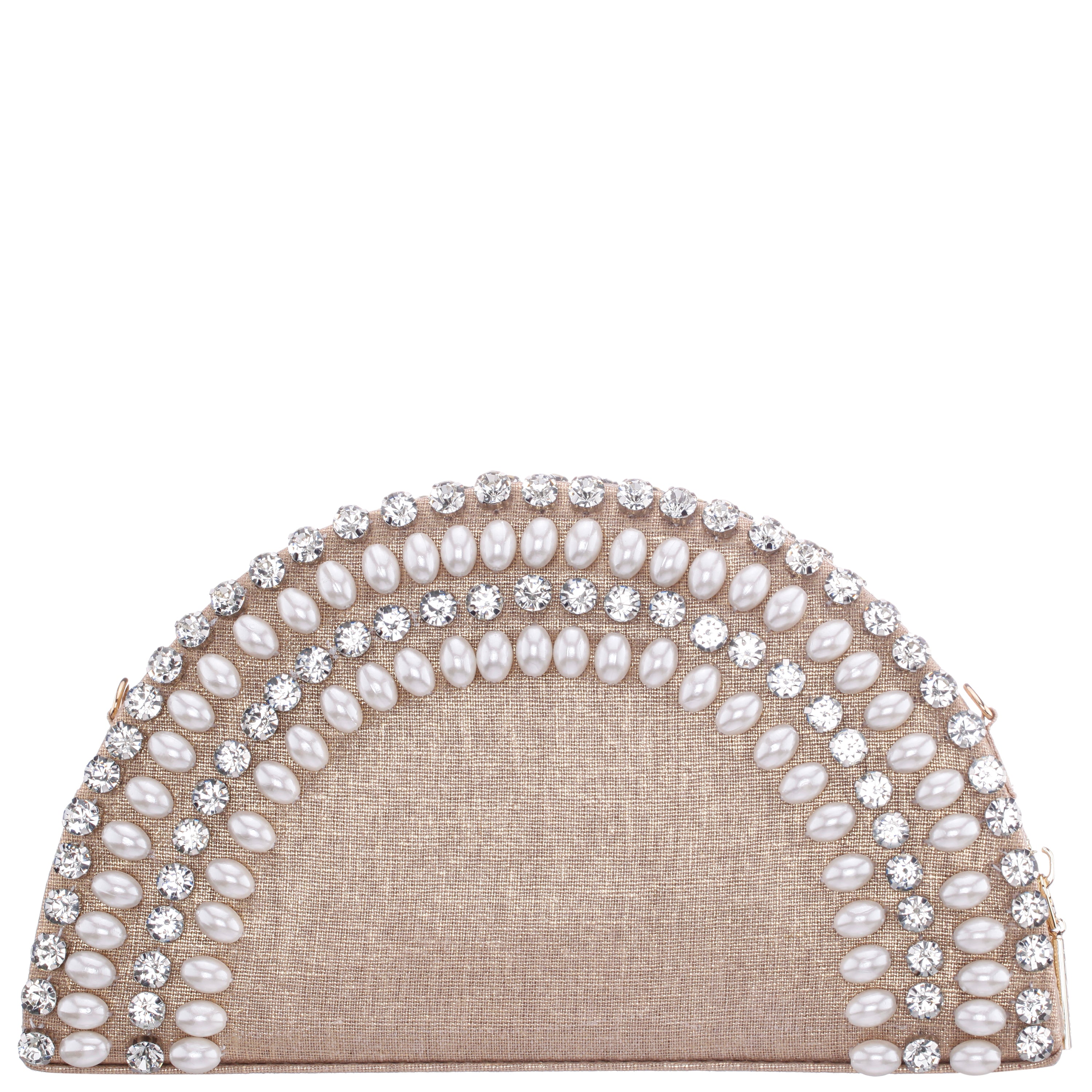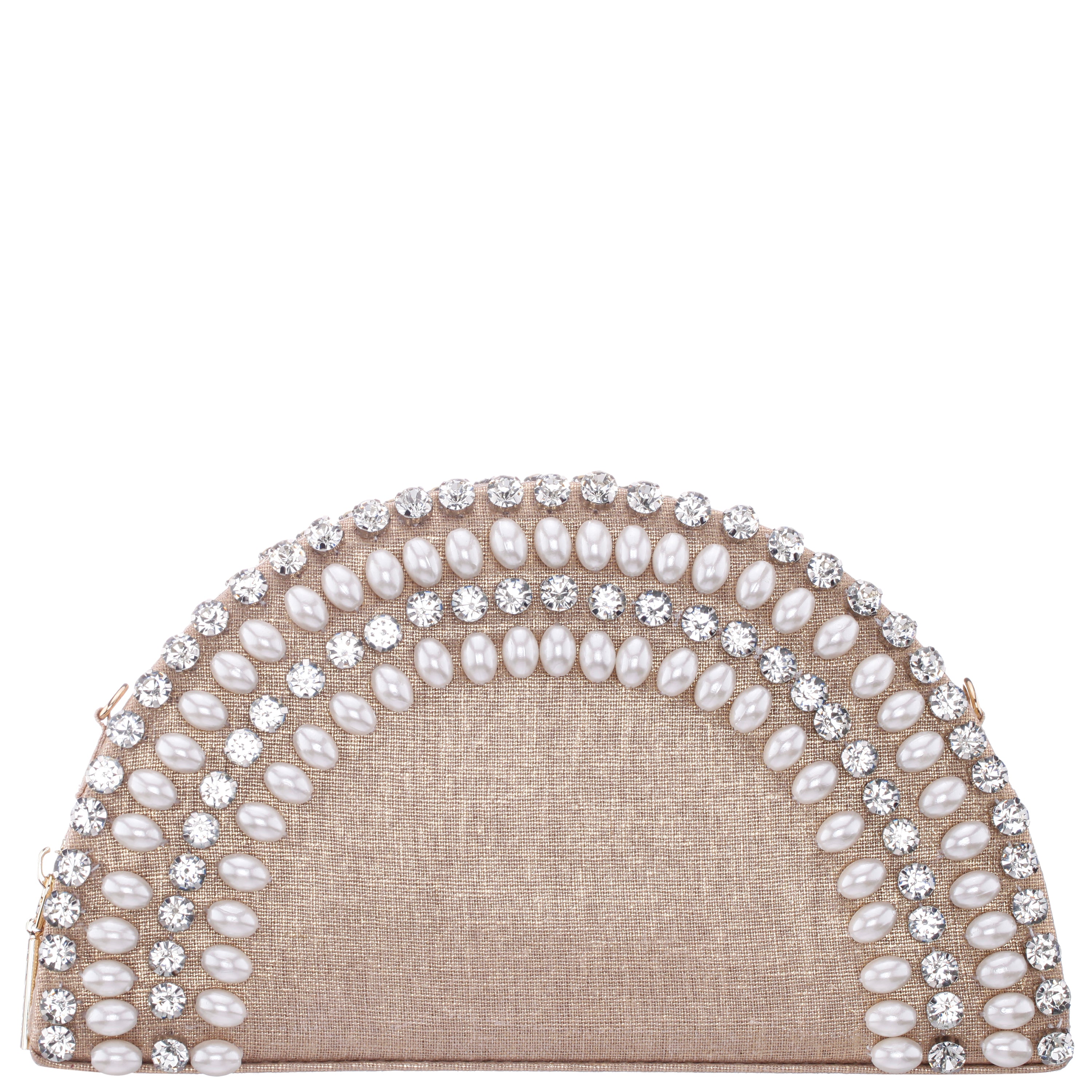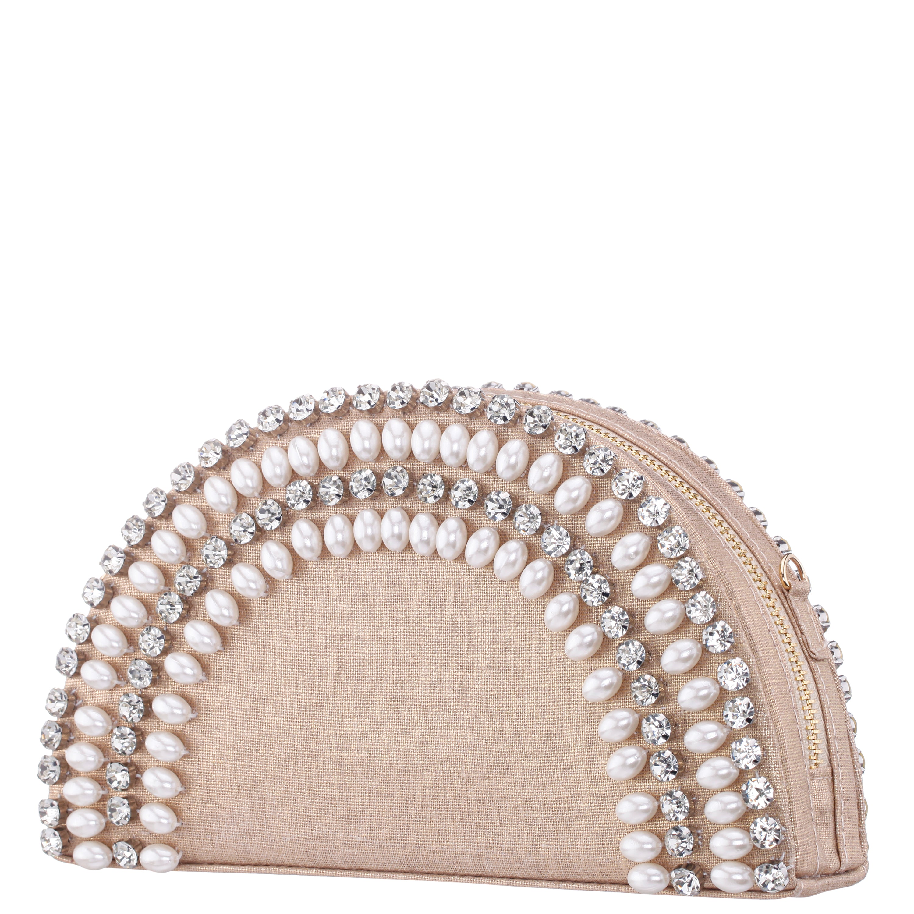 GOLD METALLIC FABRIC/GLASS CRYSTAL/PLASTIC PEARL ZIP CLUTCH
