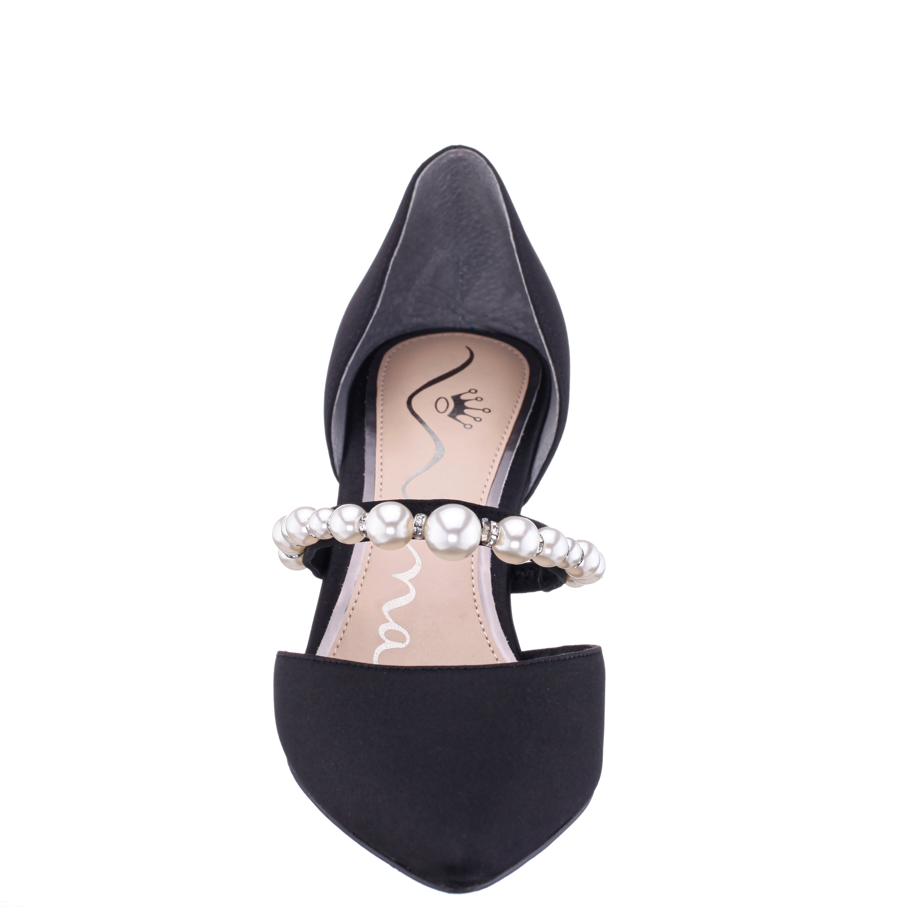 BLAIR Elastic Strap Style D'Orsay Pump Step into sophistication with the BLAIR by Nina Shoes. This elegant D'Orsay pump is designed to make you stand out with its sleek pointy toe style, defined by a single strap of glossy white pearls and crystals. The chic mid heel adds a touch of class to any outfit, making it perfect for both special occasions and everyday elegance. The elastic strap closure ensures a secure fit, while the lightly cushioned insole provides comfort for all-day wear.