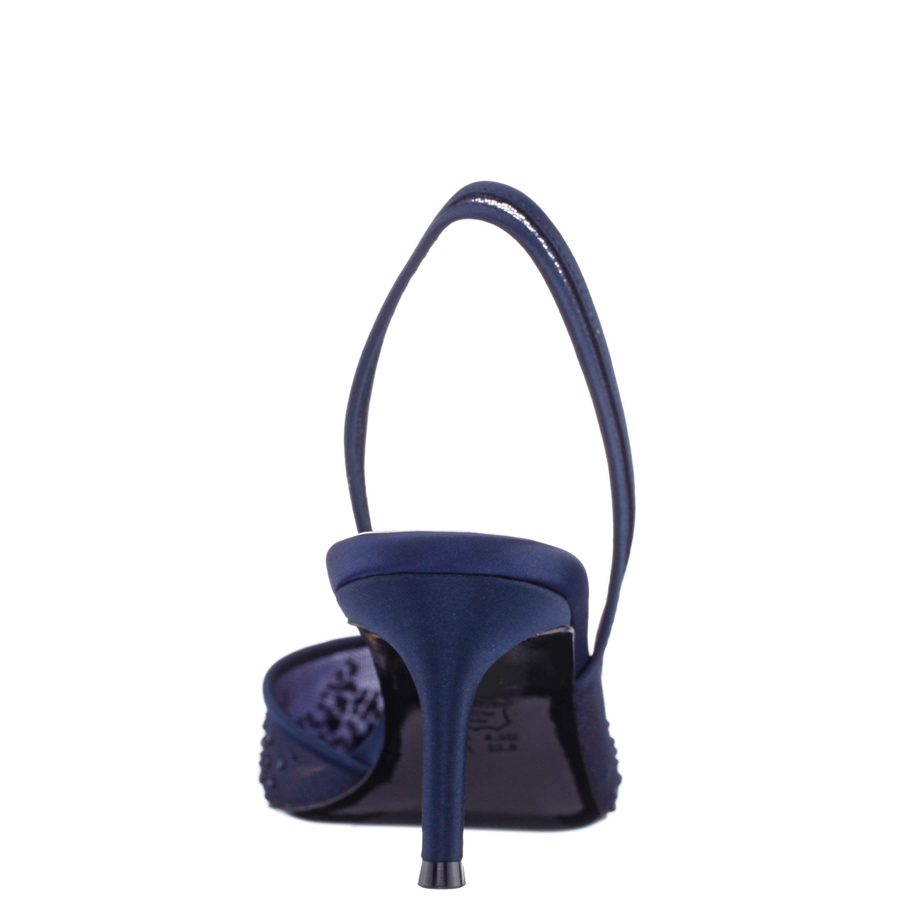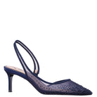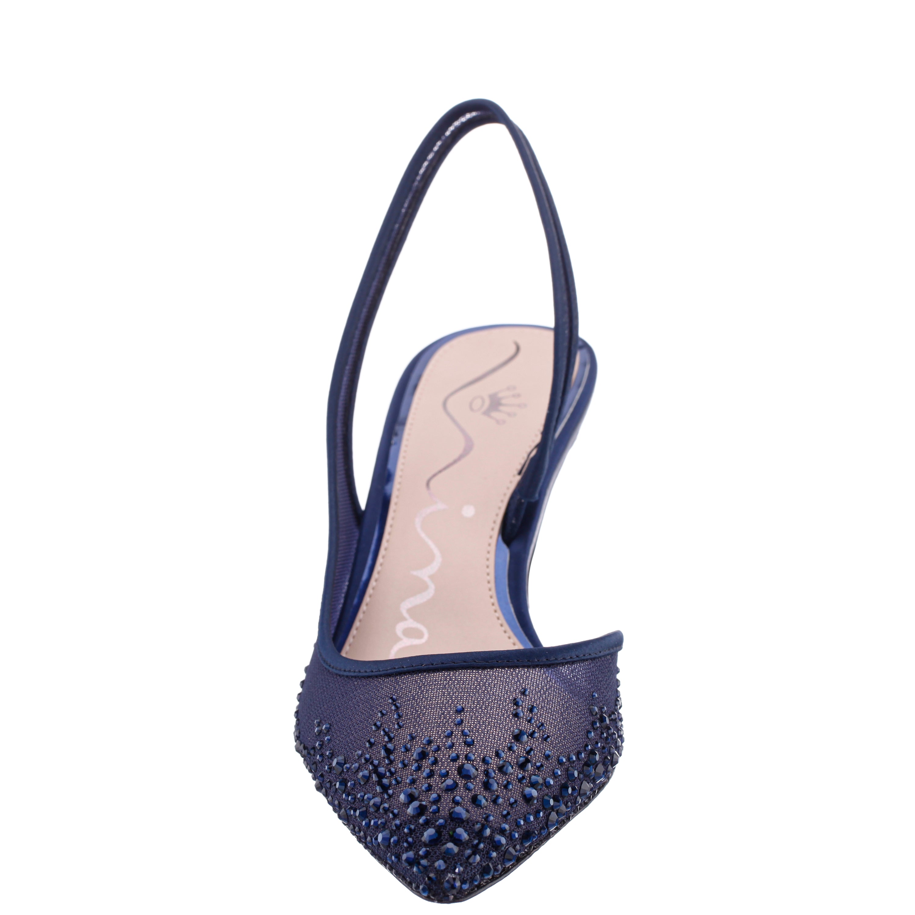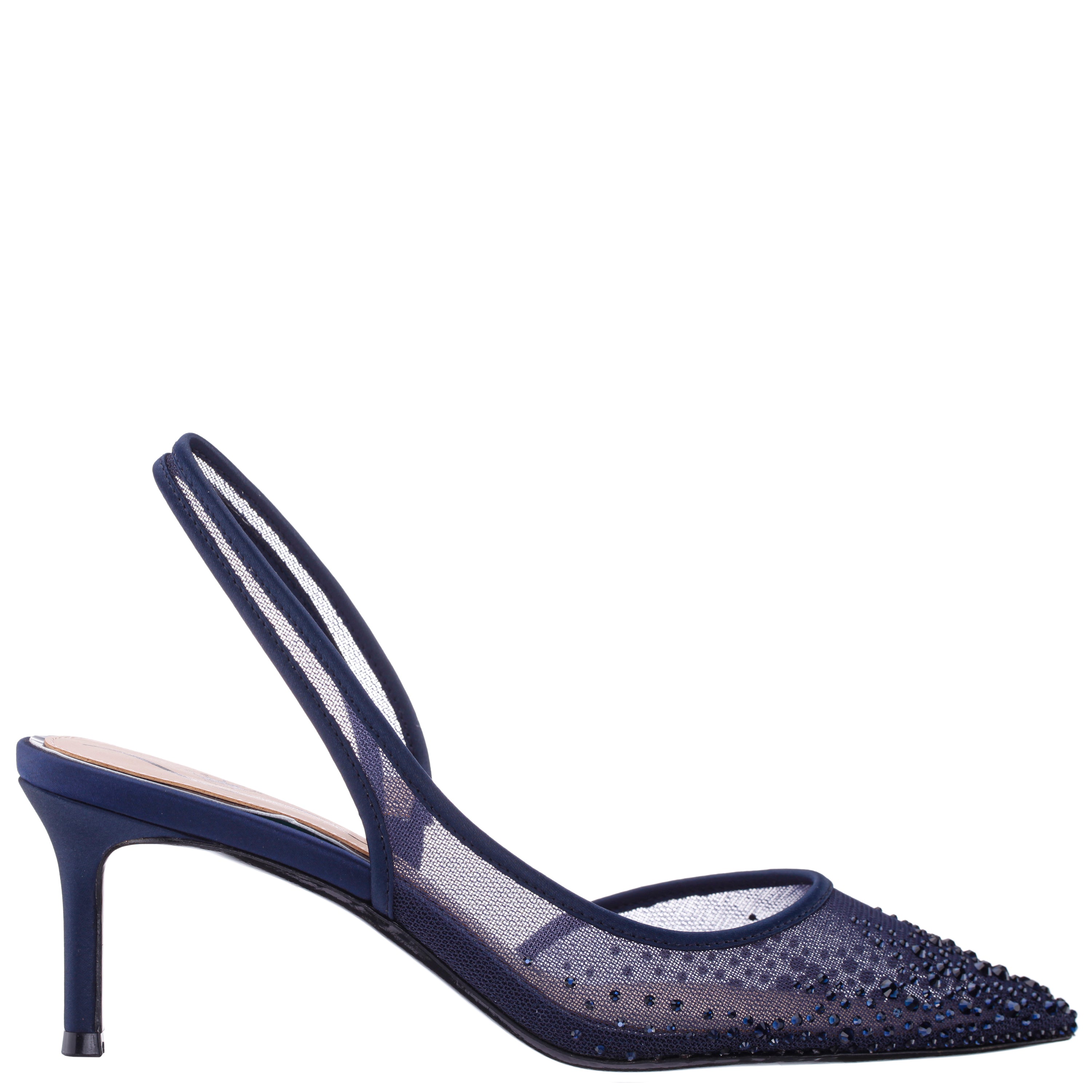 "Enchanting" is the word used to describe NAZARIA by Nina Shoes, a low-heeled, slingback evening pump. Faceted, tiny crystals scattered across the mesh pointy-toe create an exquisite special occasion style. Trimmed in matching satin binding, this is an extraordinarily elegant evening pump perfect for making a sophisticated statement.