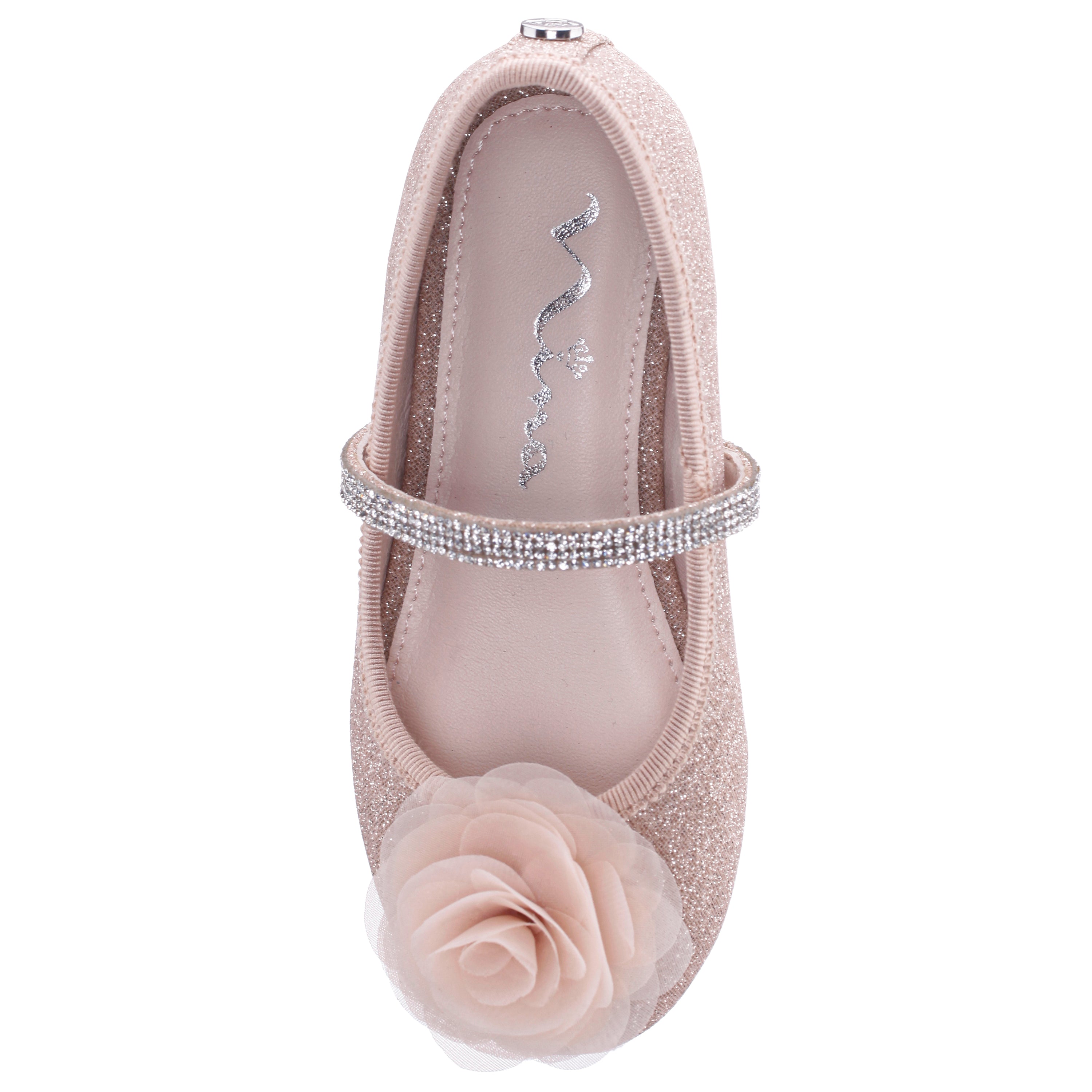 Delicate and graceful, JORY by Nina Shoes is a charming girls ballet flat designed to bring elegance to any occasion. Featuring a modern soft square toe, a sweet flower detail, and a shimmering crystal strap, this style adds a touch of whimsy and sparkle to her look. The secure elastic strap keeps the fit snug, while the cushioned memory foam insole and flexible non-slip sole provide all-day comfort and stability.