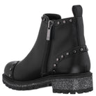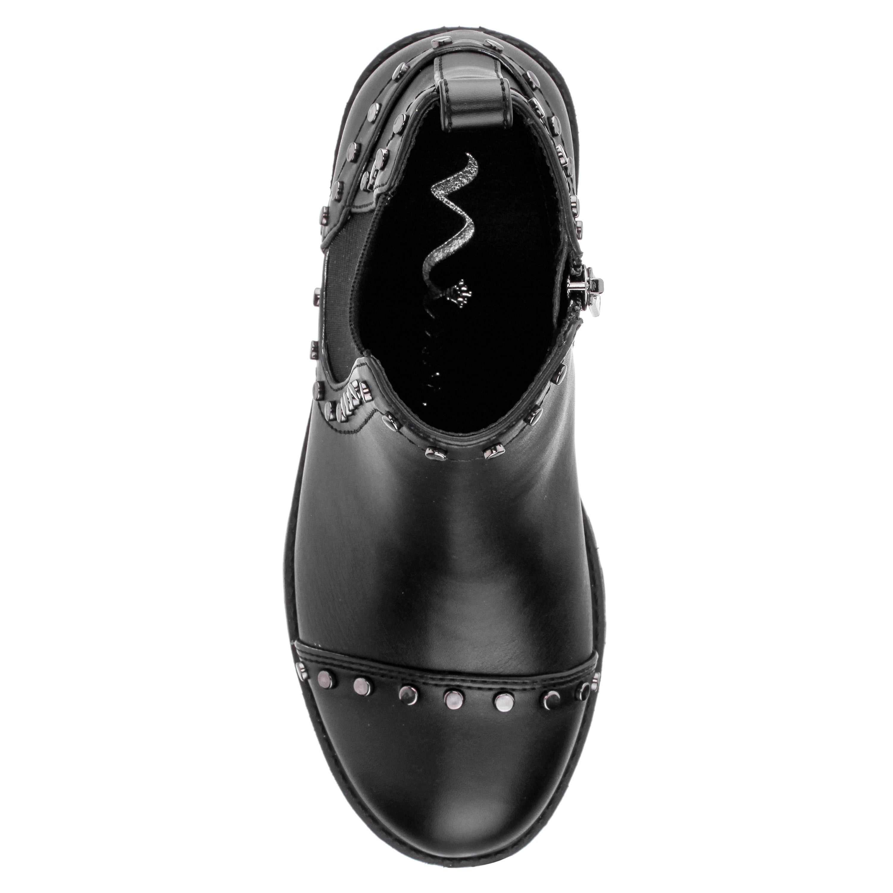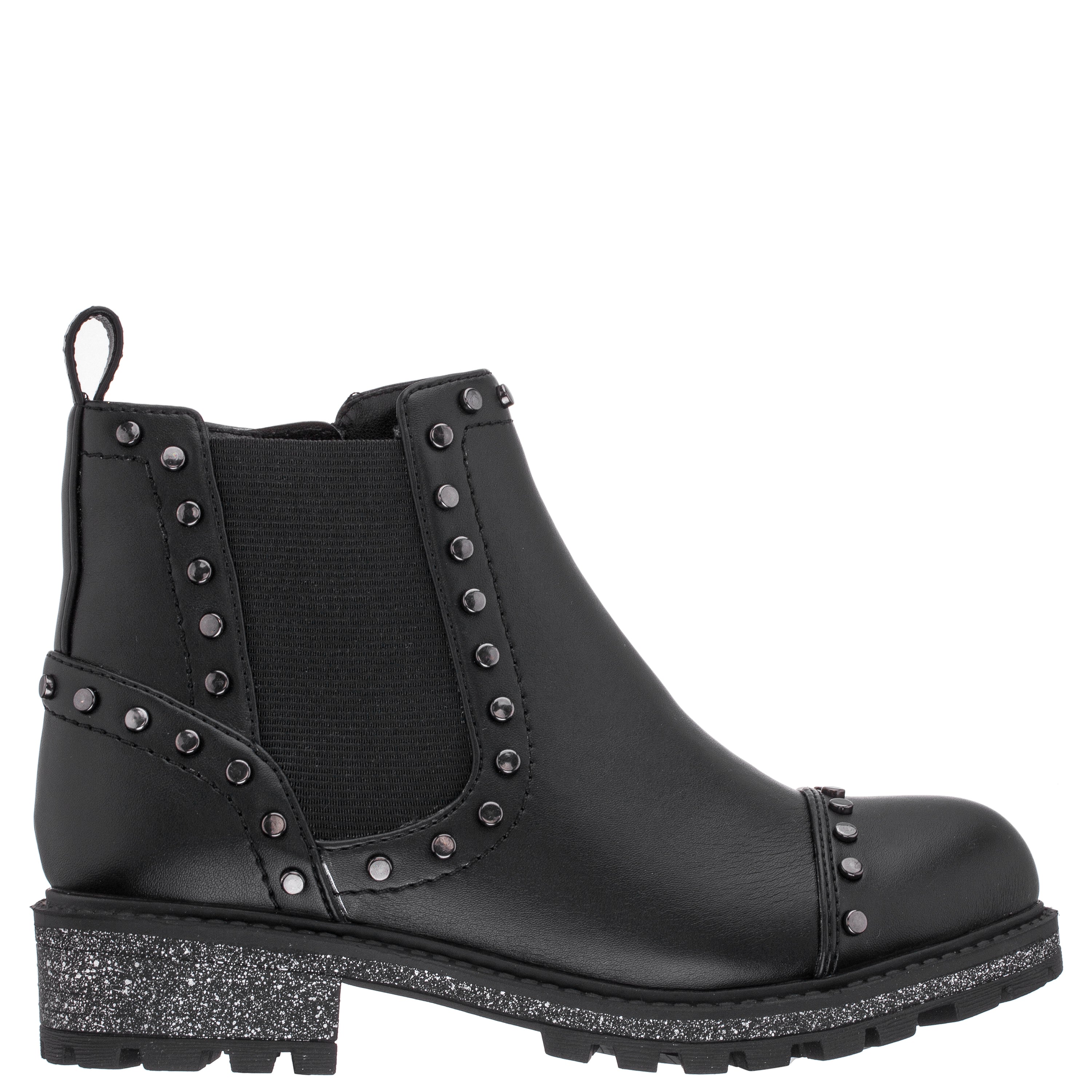 Our chelsea boot with stretch elastic gore, flat studding details, inside zipper and glitter outsole looks super fresh for fall! This stand out style will be the star of every outfit!