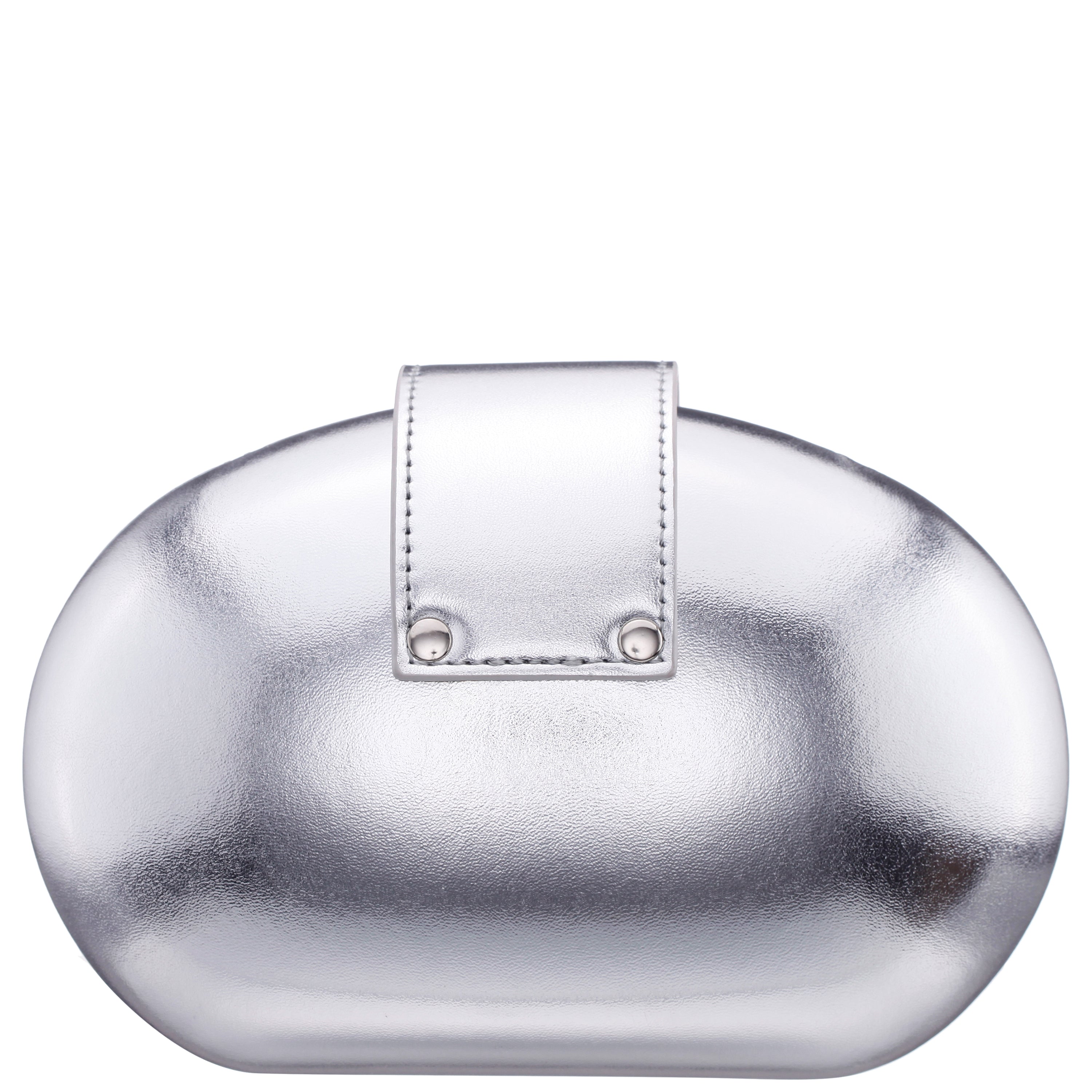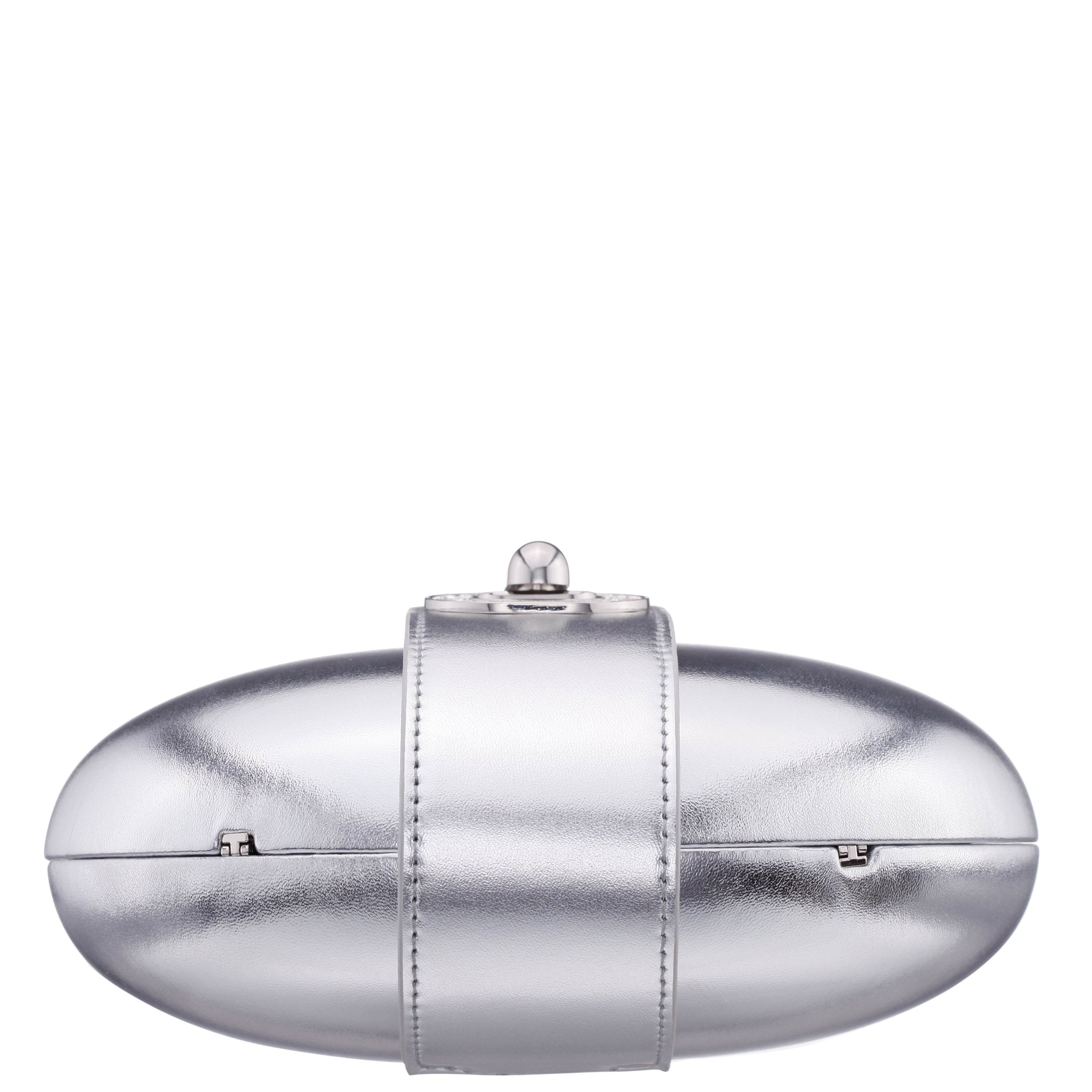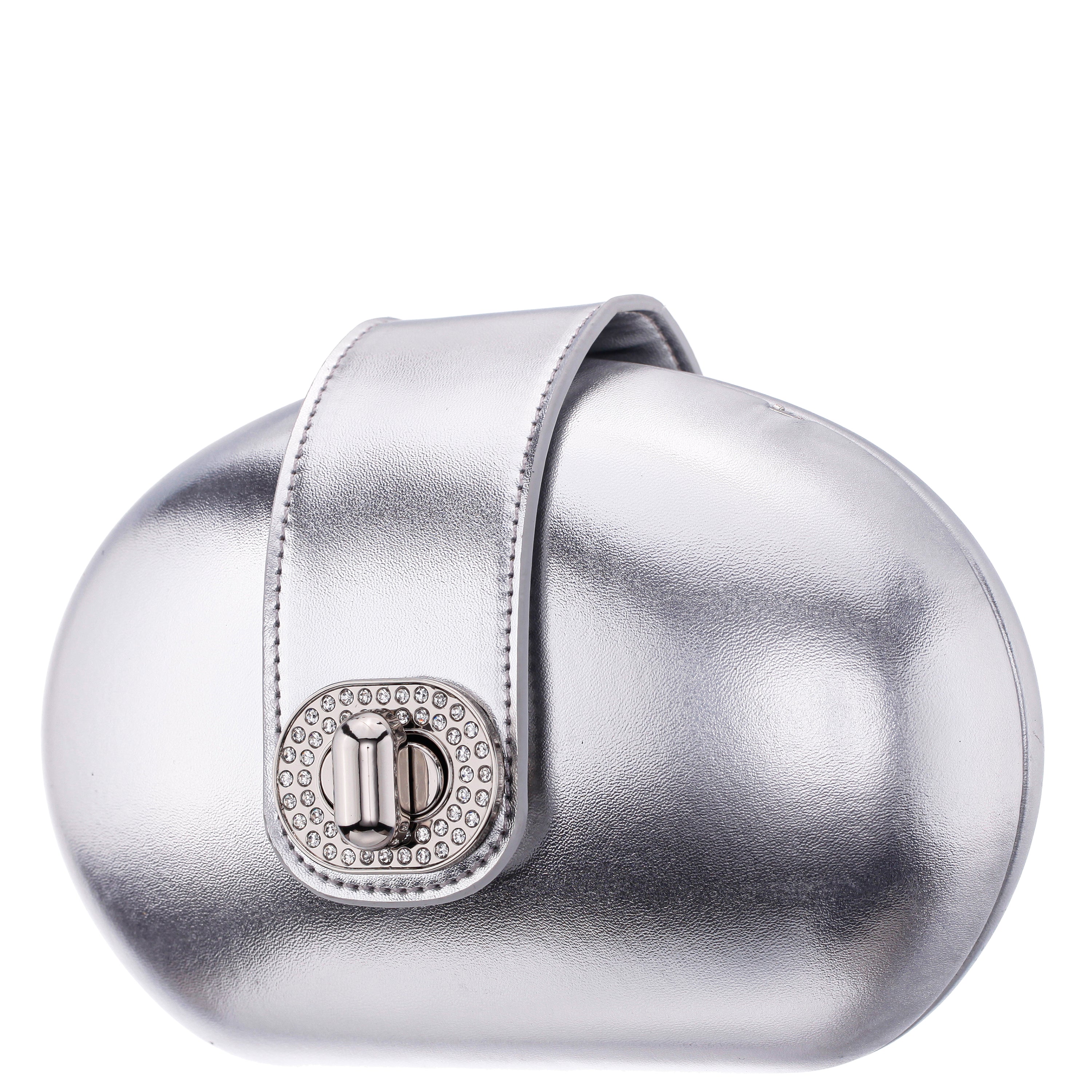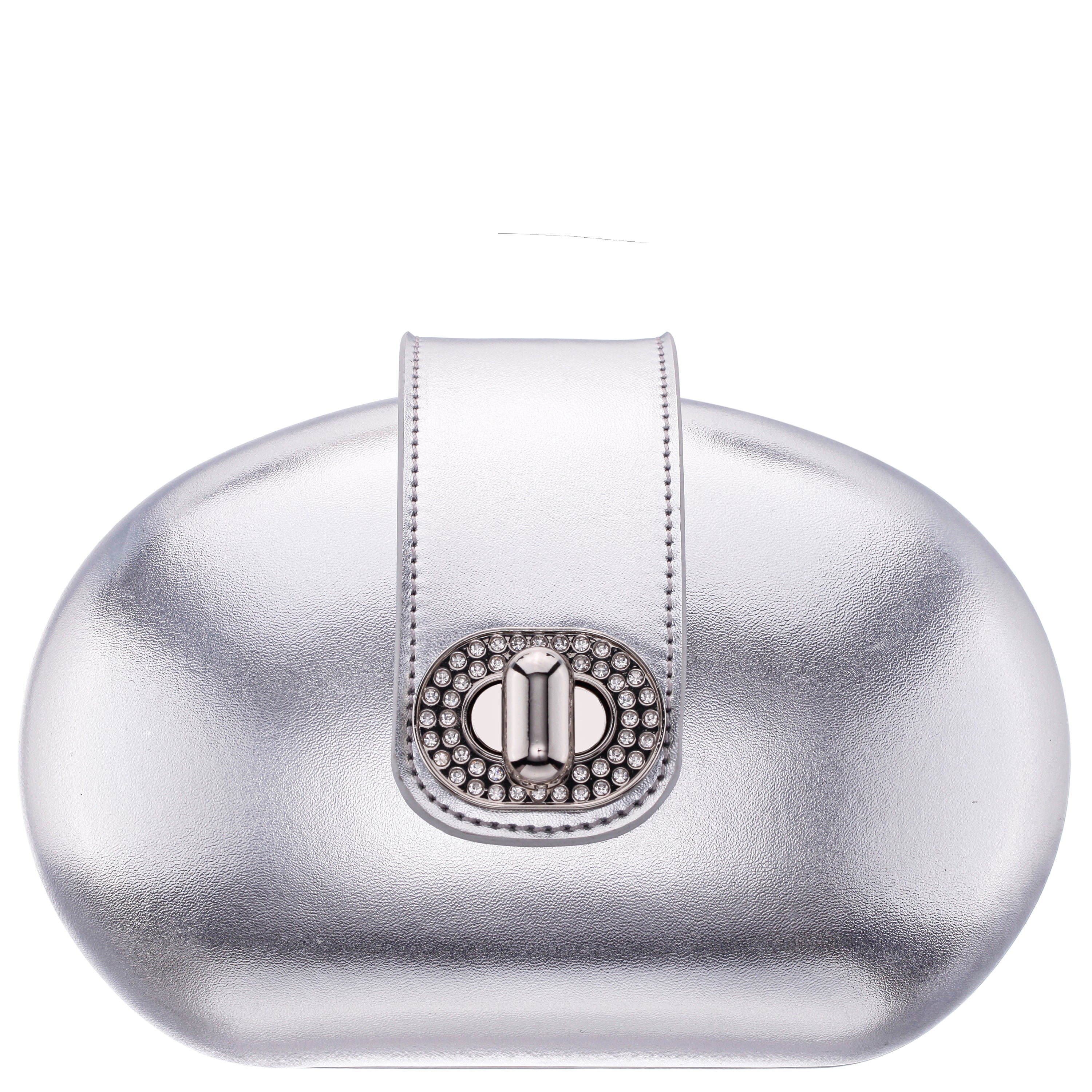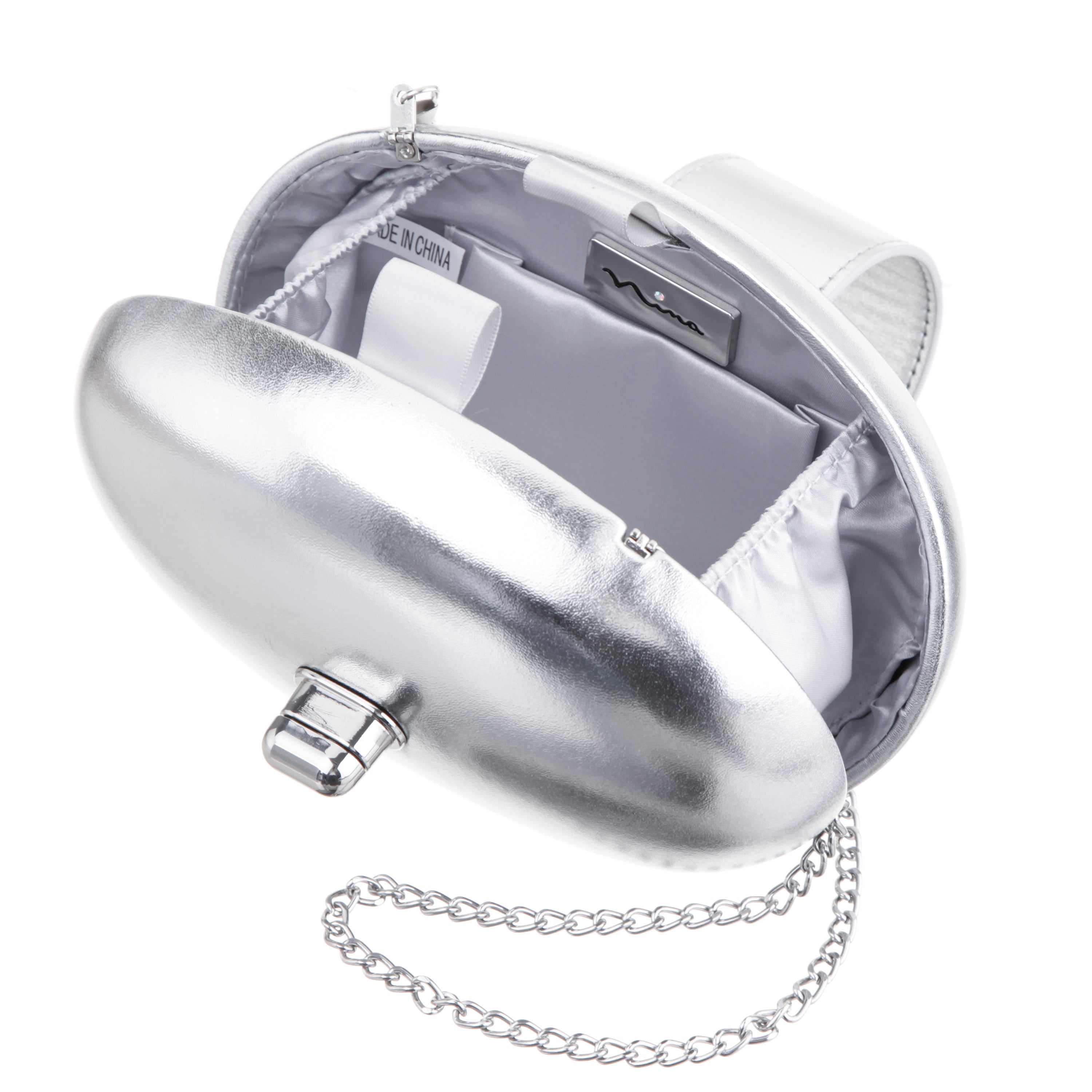 AGATHA by Nina is a modern classic with just the right dose of shine. This oval minaudiere is sculpted for elegance, featuring sleek lines, a smooth finish, and a dazzling crystal turnlock closure as its focal point. Crafted in high-shine patent or metallic foil PU, it reflects light beautifully and elevates any evening ensemble. With a structured shape and optional 18" chain strap, AGATHA transitions effortlessly from handheld sophistication to shoulder-slung chic.