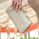 The ANEKA by Nina is the definition of radiant elegance, designed to catch the light—and every eye in the room. With its pleated shine exterior, this clutch gleams with texture and depth, giving a modern twist to timeless glamour. The long 44" drop-length Nina flat curb chain allows you to wear it as a crossbody or drape it gracefully over the shoulder. Inside, a matching pleated shine lining adds an extra dose of luxury, complemented by a back interior wall pocket to keep your essentials organized. A lift-lock closure completes the look with a vintage-inspired finish. With its blend of shimmer, structure, and grace, the ANEKA by Nina is made for making an entrance.