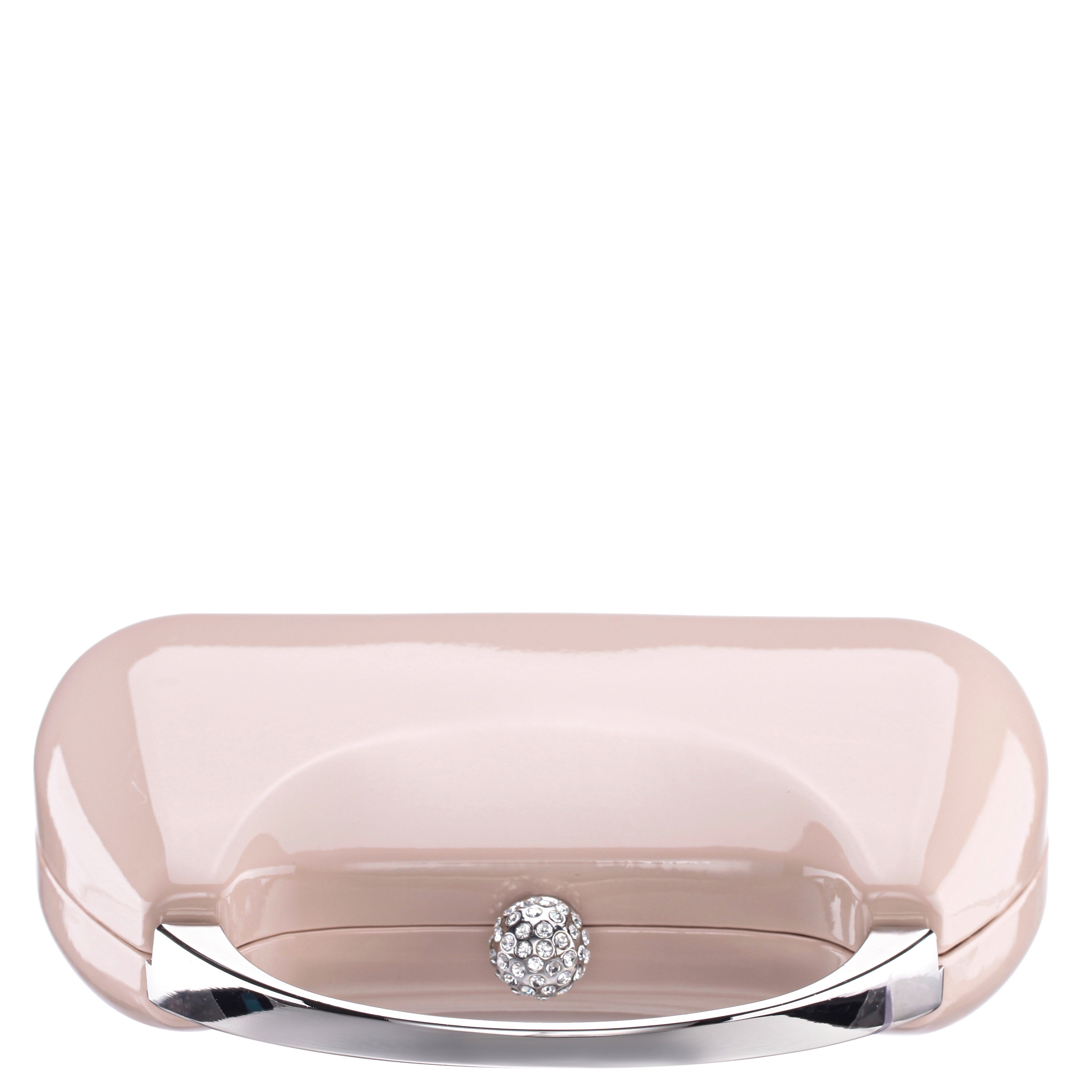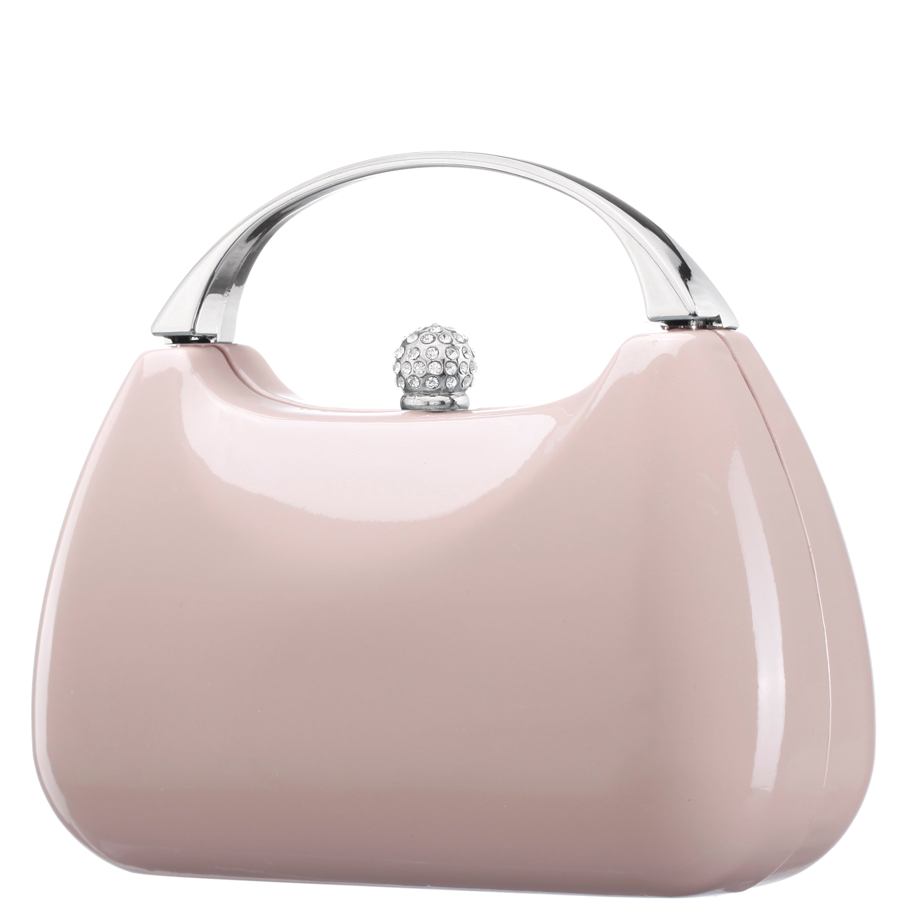BRANDO-B by Nina – Patent Minaudiere with Metal Handle The BRANDO-B is a structured patent minaudiere that delivers clean lines and modern polish. Designed to go from day to night, it features a glossy finish, a sleek metal top handle, and a secure lift-lock closure. Carry it by the handle for a refined look, or use the detachable 18" chain strap for hands-free wear. The satin-lined interior includes a back wall pocket—just enough room for your evening essentials.Key Features