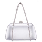 CAMARA by Nina – Crystal Cord Handle Minaudiere The CAMARA by Nina is a sleek and sophisticated evening minaudiere, designed to add statement sparkle to your night-out look. Its standout detail—a 4.75" crystal-embellished cord handle—delivers jewelry-like elegance with a bold twist, perfectly paired with a smooth, minimalist body. The secure lift-lock closure enhances its polished silhouette while keeping your essentials safe. Inside, you’ll find a satin-lined interior with a back wall pocket for compact organization. Wear it as a clutch or use the 18" flat curb chain strap for shoulder carry. Available in Bronze, Platino, Silver, Black, Ivory, and Navy, CAMARA is the ultimate mix of function, fashion, and shine.Key Features