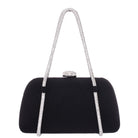 CAMARA by Nina – Crystal Cord Handle Minaudiere The CAMARA by Nina is a sleek and sophisticated evening minaudiere, designed to add statement sparkle to your night-out look. Its standout detail—a 4.75" crystal-embellished cord handle—delivers jewelry-like elegance with a bold twist, perfectly paired with a smooth, minimalist body. The secure lift-lock closure enhances its polished silhouette while keeping your essentials safe. Inside, you’ll find a satin-lined interior with a back wall pocket for compact organization. Wear it as a clutch or use the 18" flat curb chain strap for shoulder carry. Available in Bronze, Platino, Silver, Black, Ivory, and Navy, CAMARA is the ultimate mix of function, fashion, and shine.Key Features