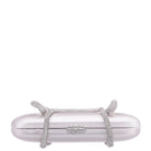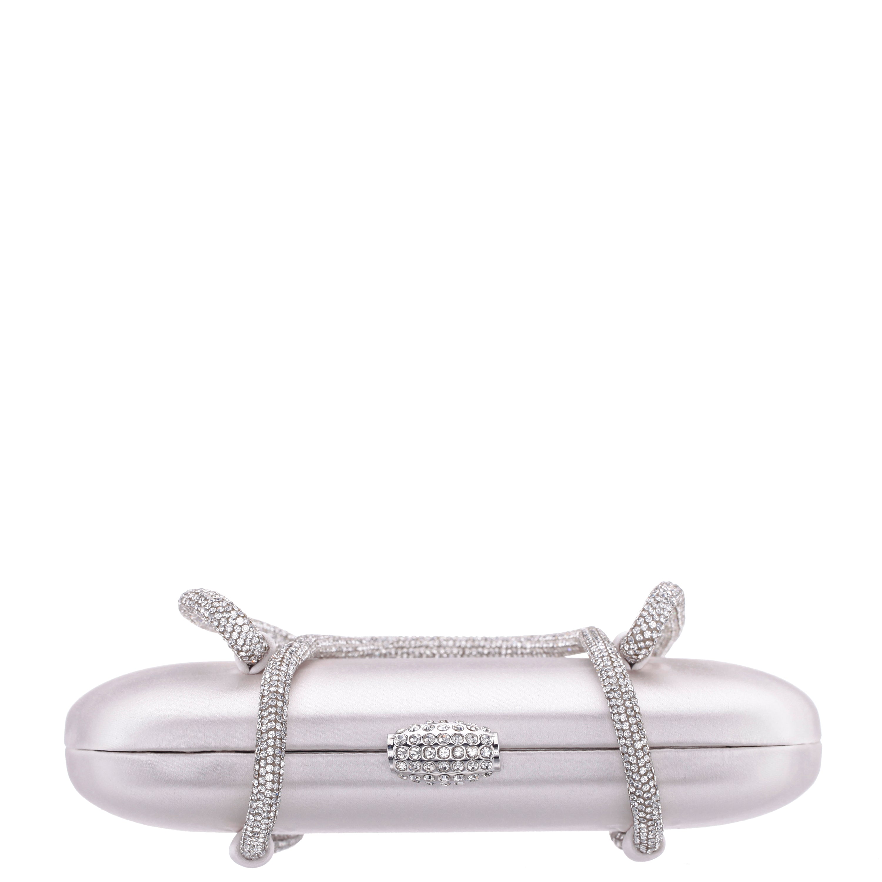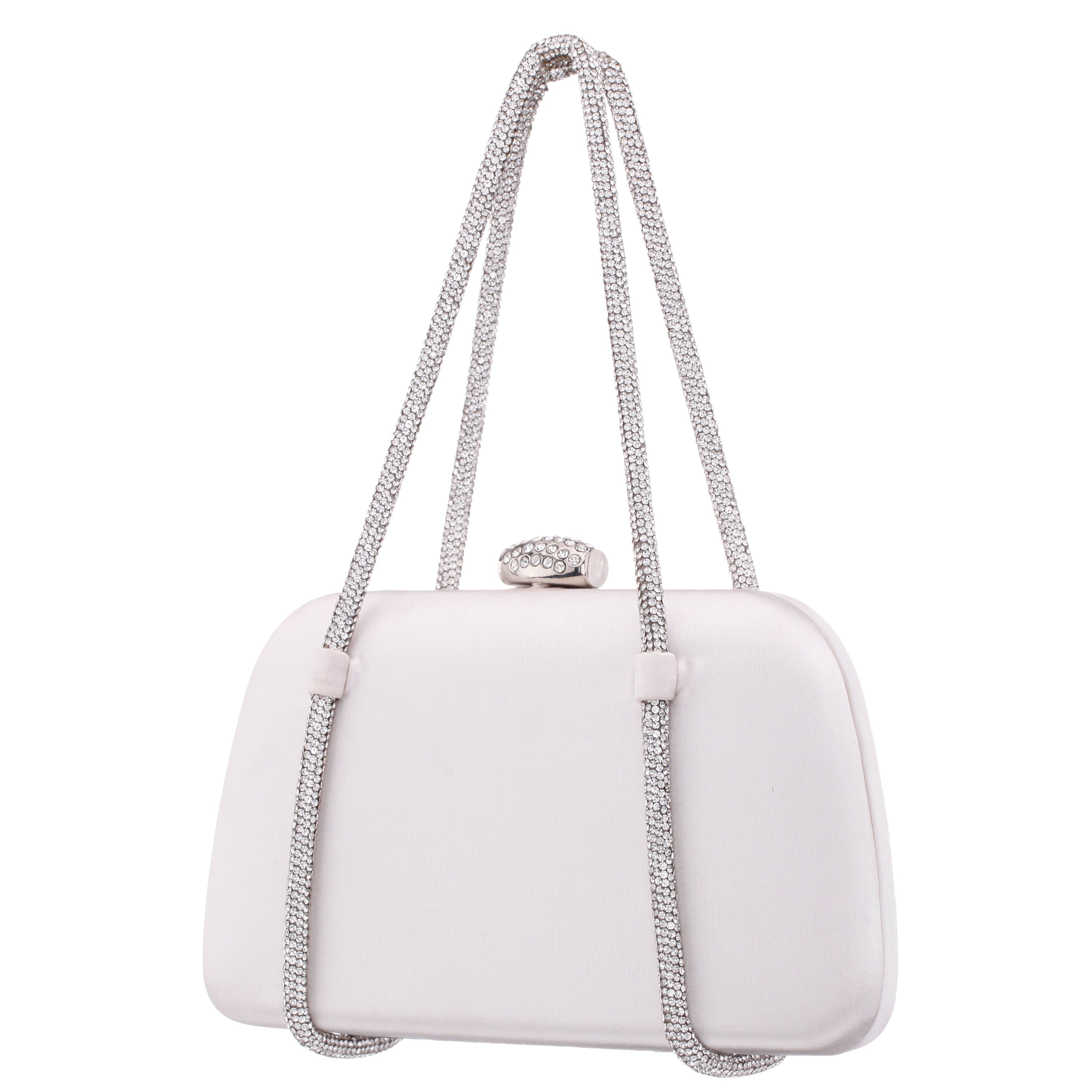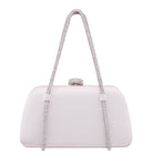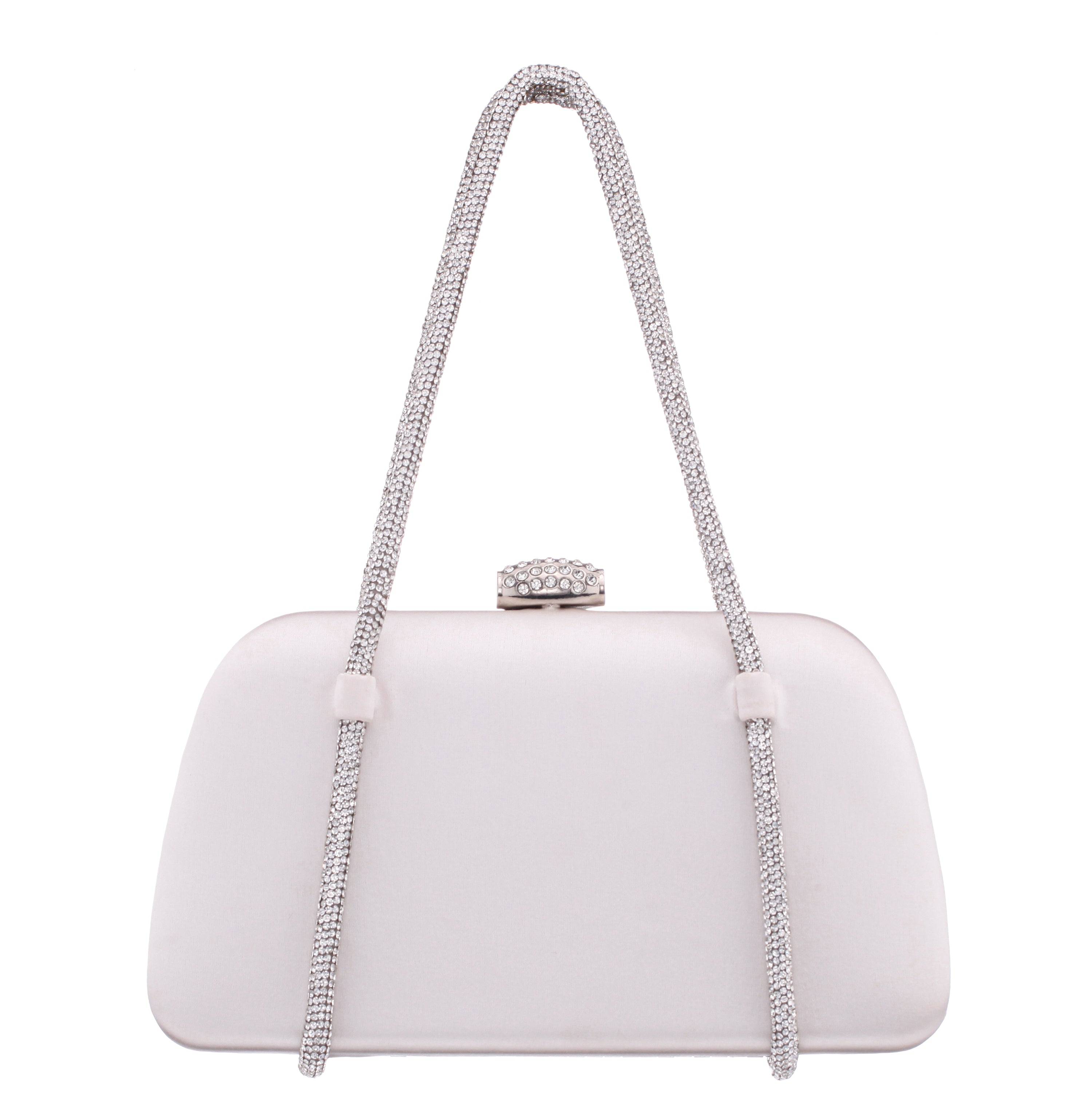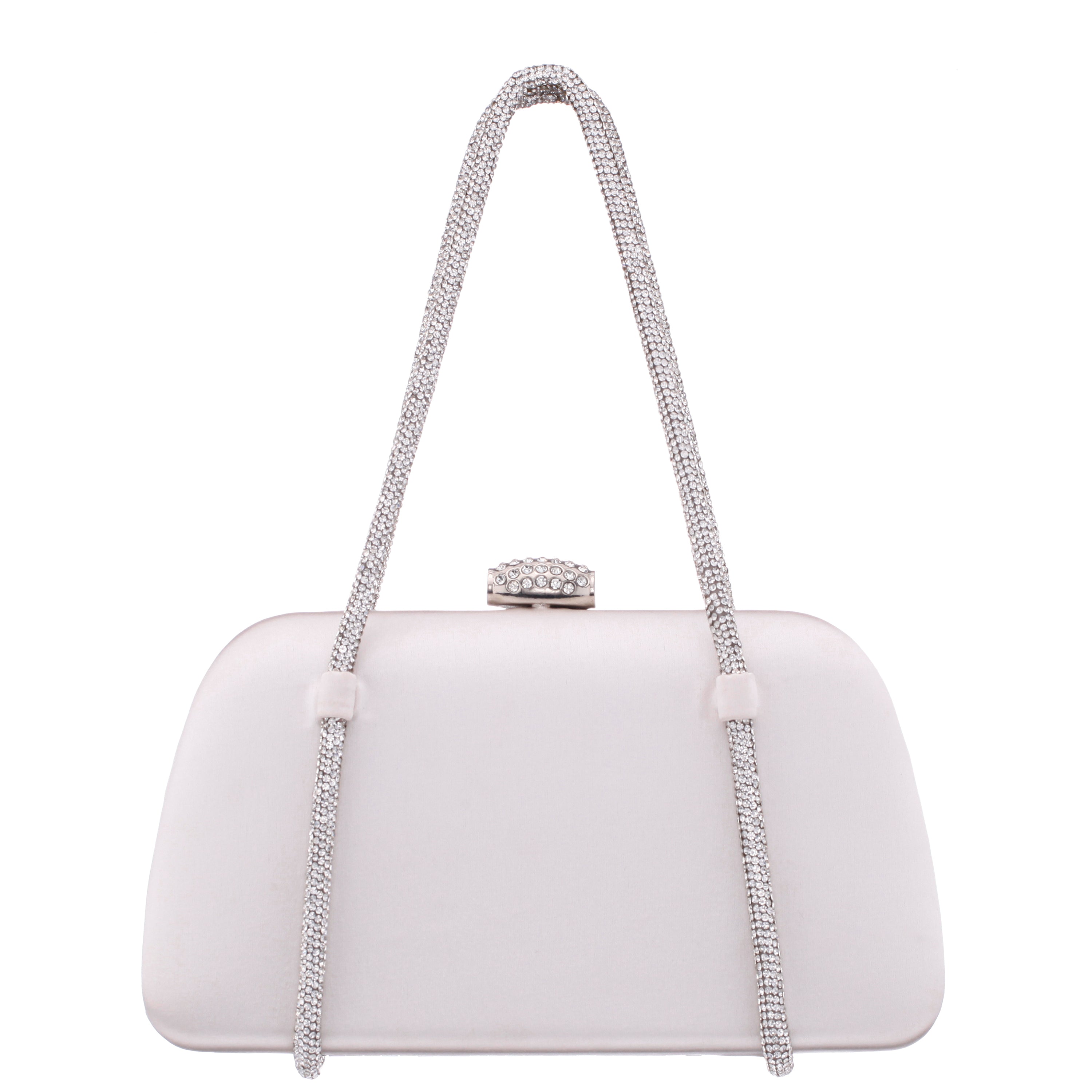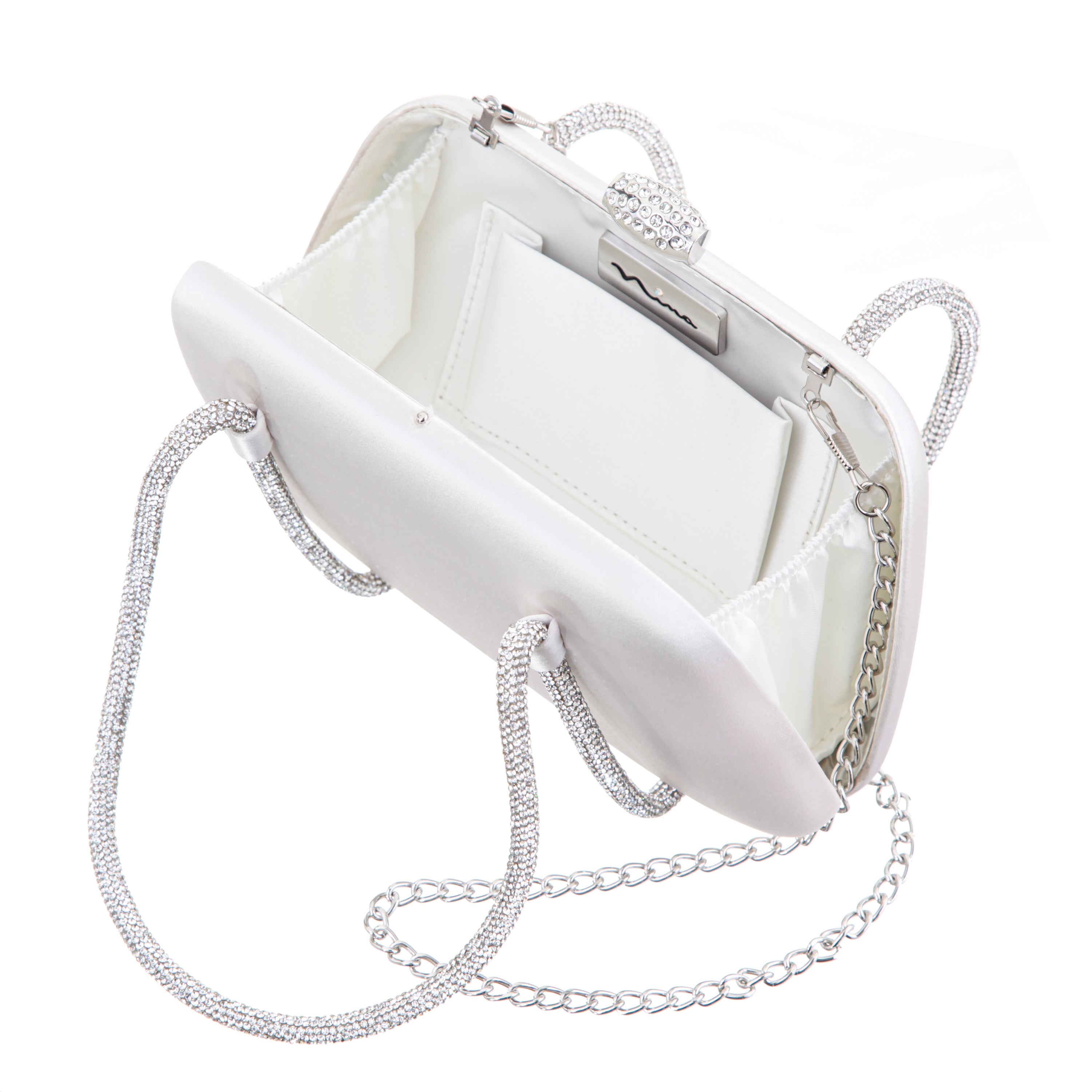 CAMARA by Nina – Crystal Cord Handle Minaudiere The CAMARA by Nina is a sleek and sophisticated evening minaudiere, designed to add statement sparkle to your night-out look. Its standout detail—a 4.75" crystal-embellished cord handle—delivers jewelry-like elegance with a bold twist, perfectly paired with a smooth, minimalist body. The secure lift-lock closure enhances its polished silhouette while keeping your essentials safe. Inside, you’ll find a satin-lined interior with a back wall pocket for compact organization. Wear it as a clutch or use the 18" flat curb chain strap for shoulder carry. Available in Bronze, Platino, Silver, Black, Ivory, and Navy, CAMARA is the ultimate mix of function, fashion, and shine.Key Features