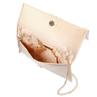 Draped chain over the front of an envelope clutch is the perfect balance between trendy and chic. Can fit all the essentials for a night out, and comes with drop in chain to go hands free