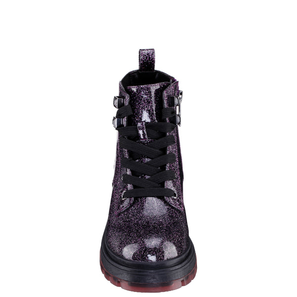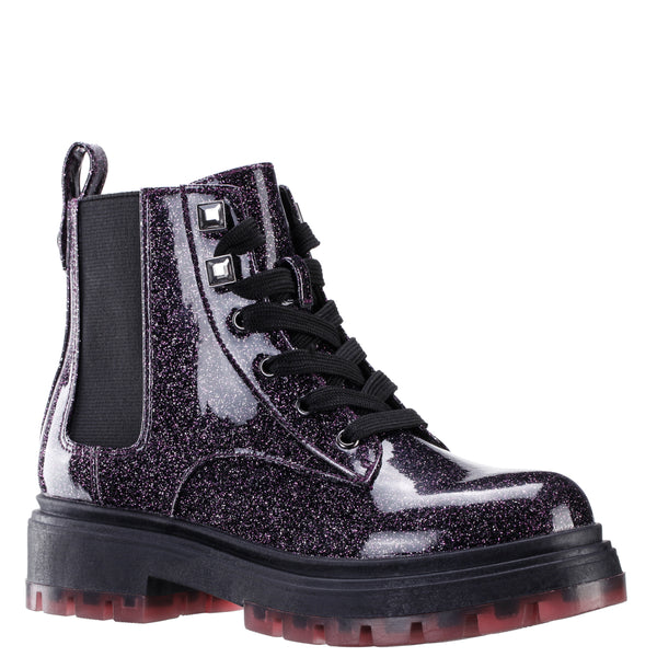These boots feature a glittery exterior that catches the light with every step, along with an elastic gore for easy wear, a rhinestone lace keeper for added sparkle, and a sturdy lug bottom outsole for traction and durability.