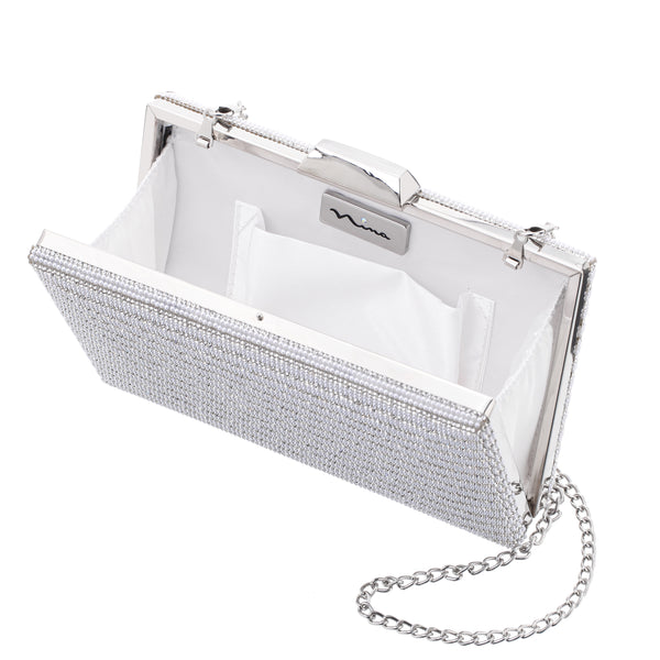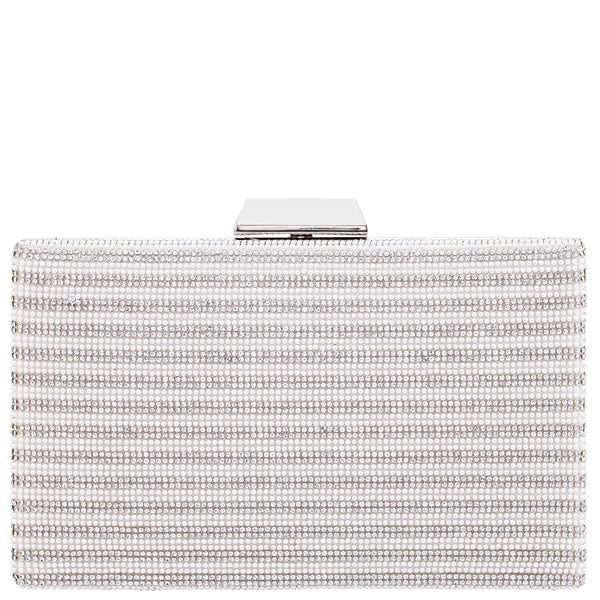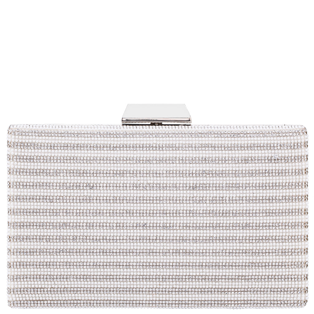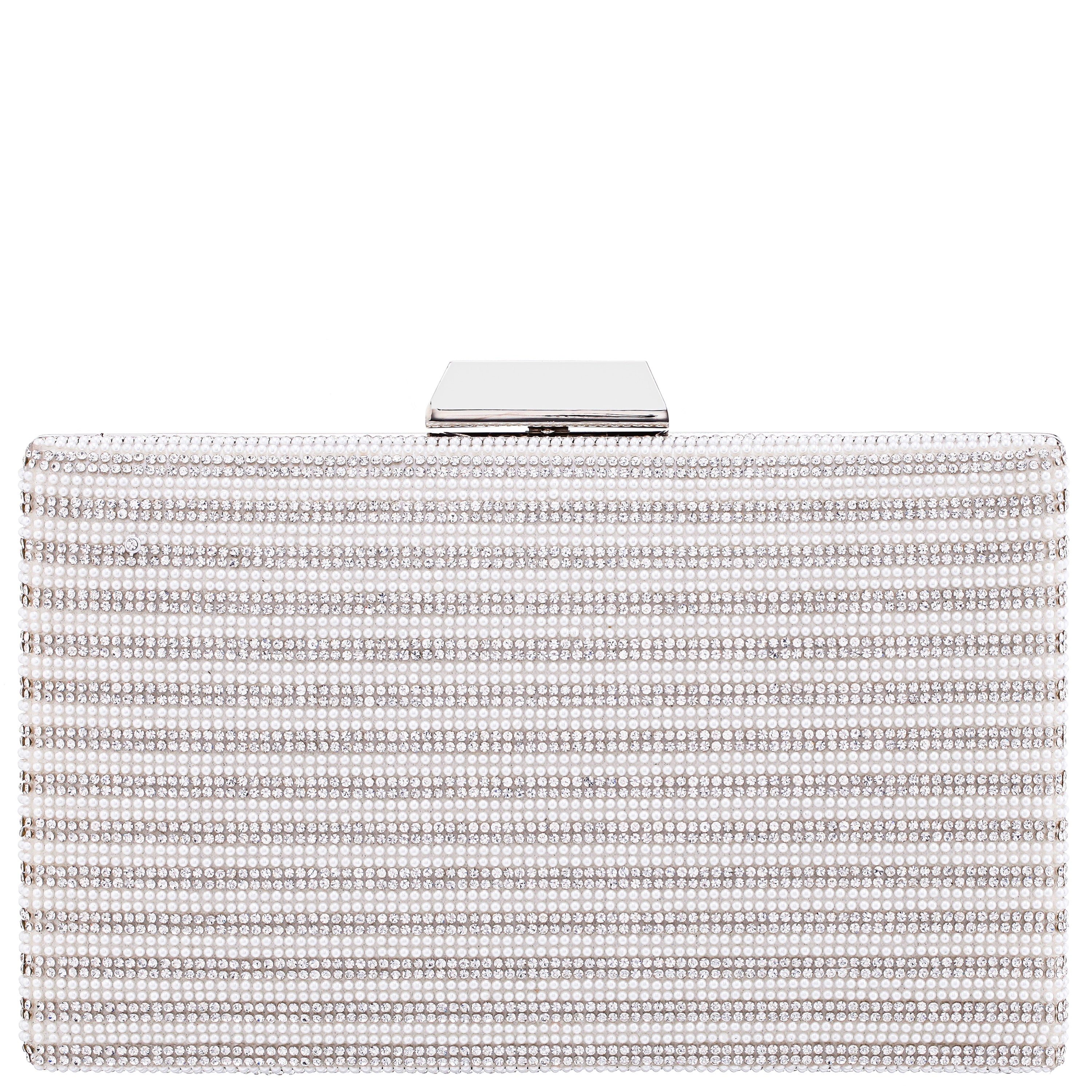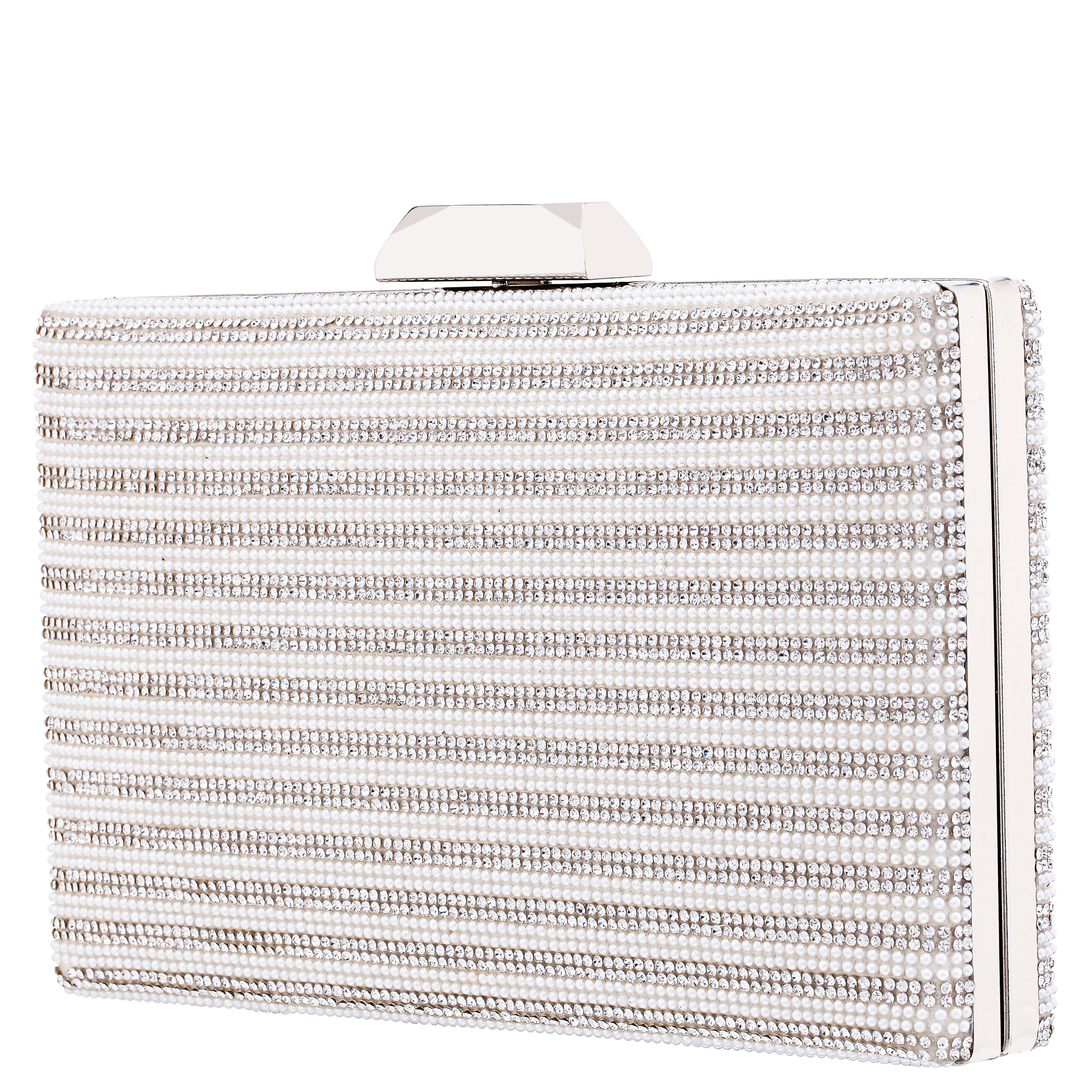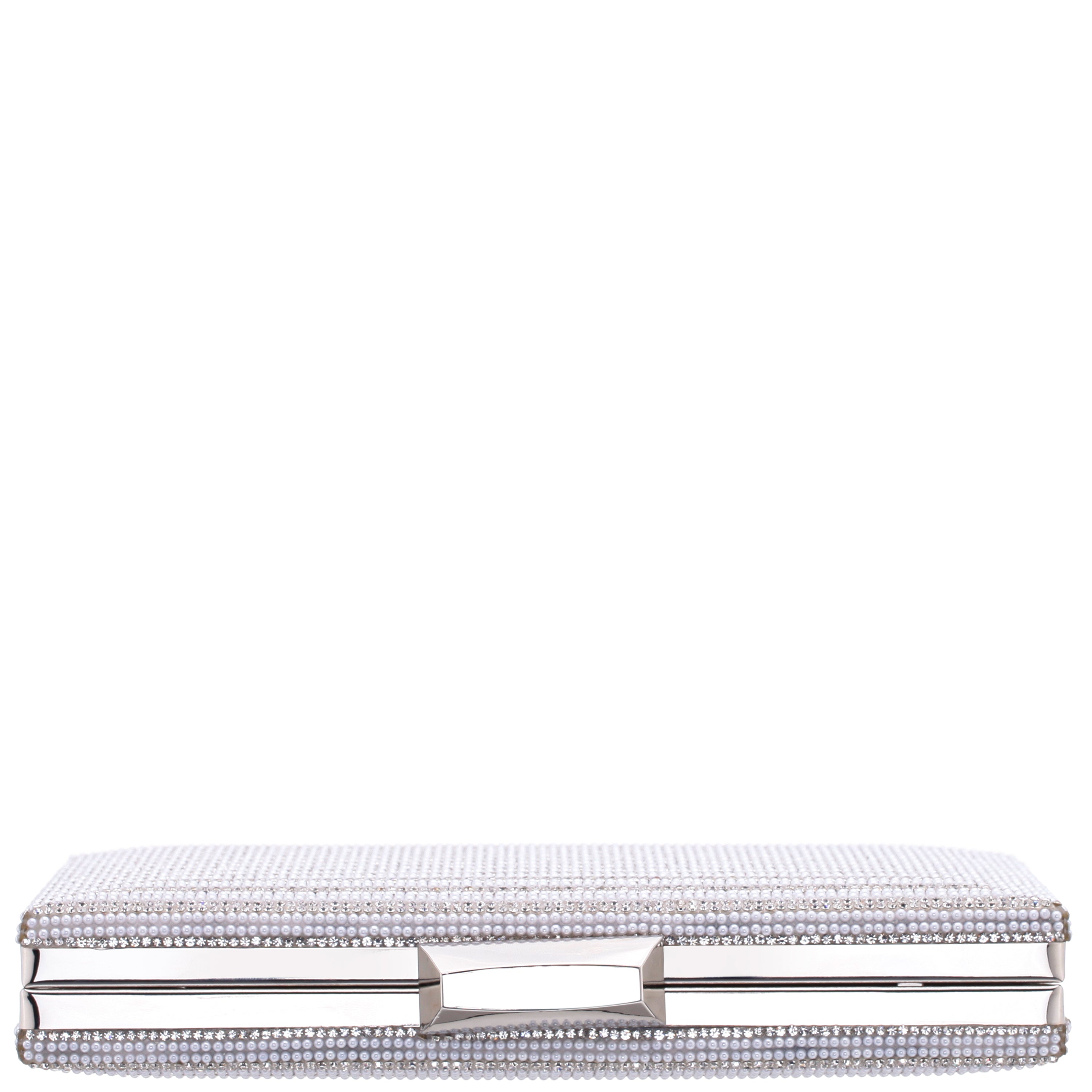 Tiny crystals and pearls catch the light on this stunning clutch outfitted with a removable drop-in chain strap.