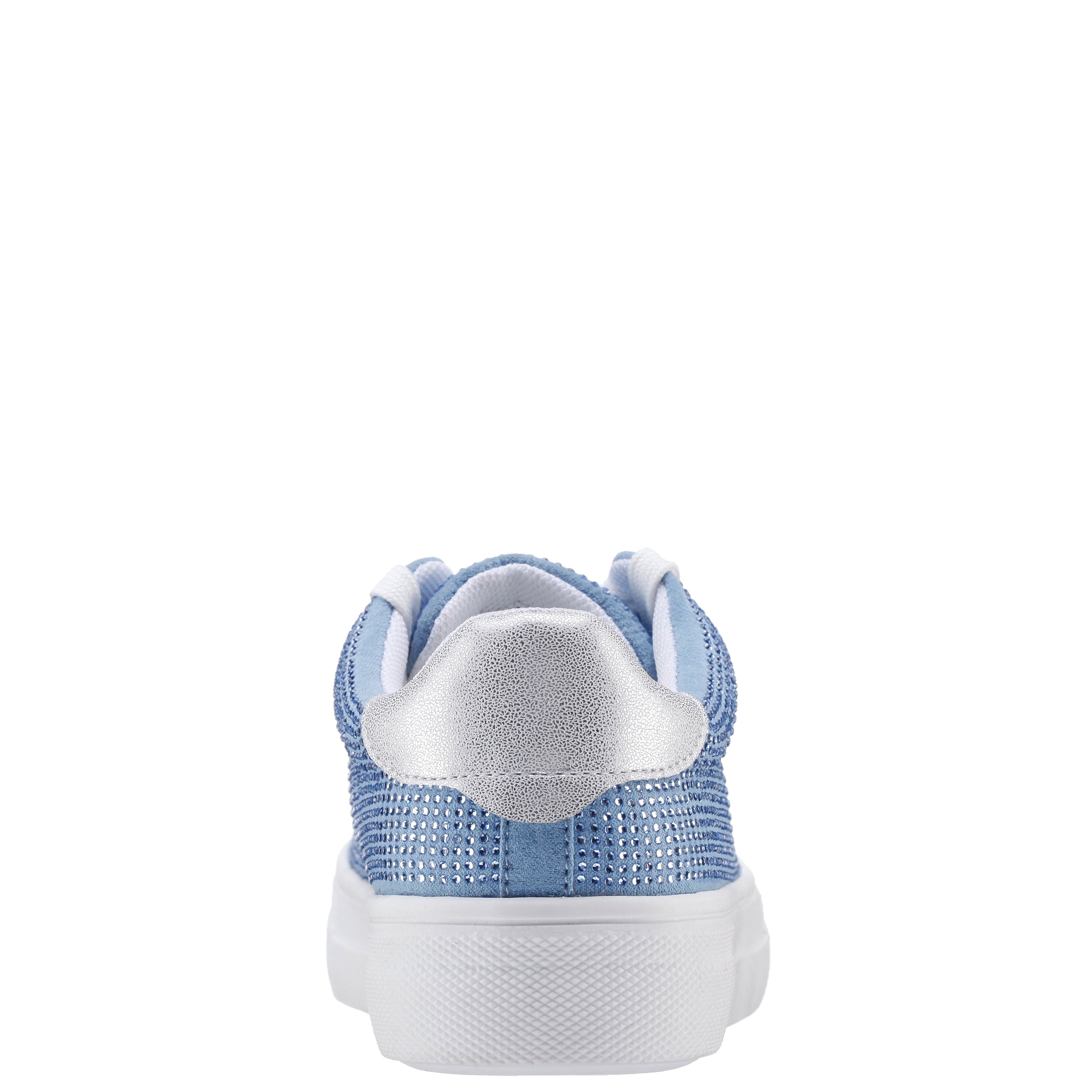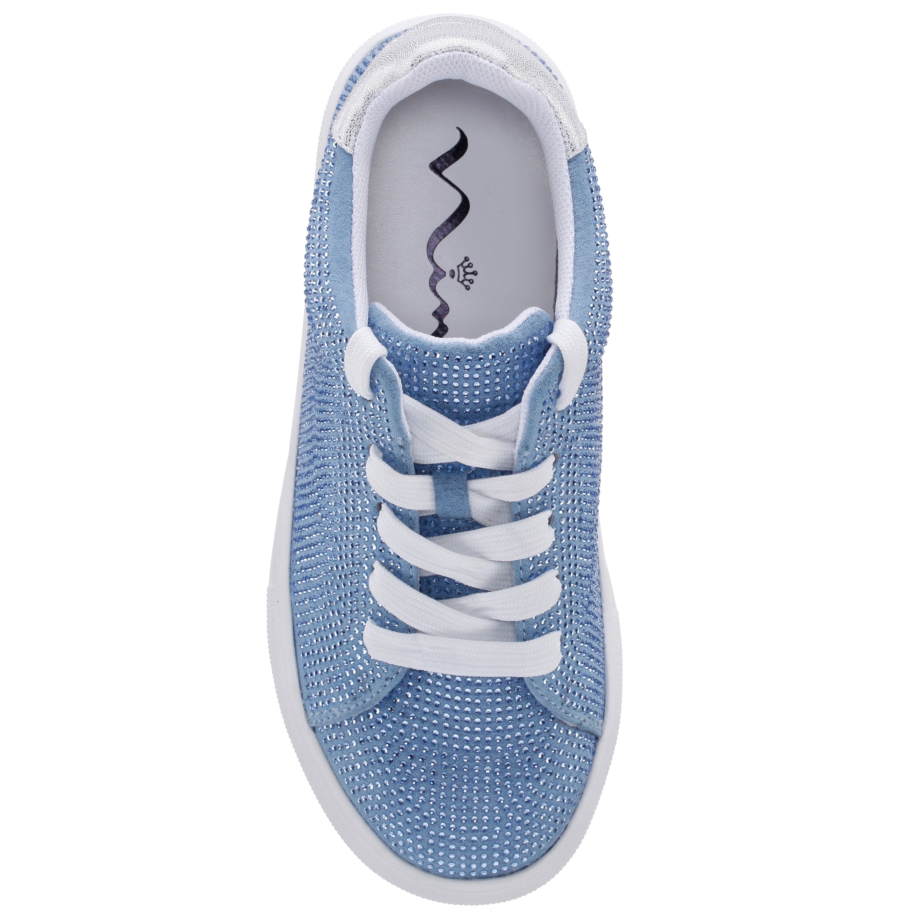 Let her sparkle with every step in GIGEE by Nina Shoes, a dazzling girls low top sneaker made to shine. Covered in shimmering rhinestone embellishments and set in soft microsuede, this standout style brings glam to everyday outfits. With classic lace-up styling, a padded collar, and a cushioned memory foam insole, GIGEE combines fashion and comfort in one easy-to-wear sneaker she'll love.