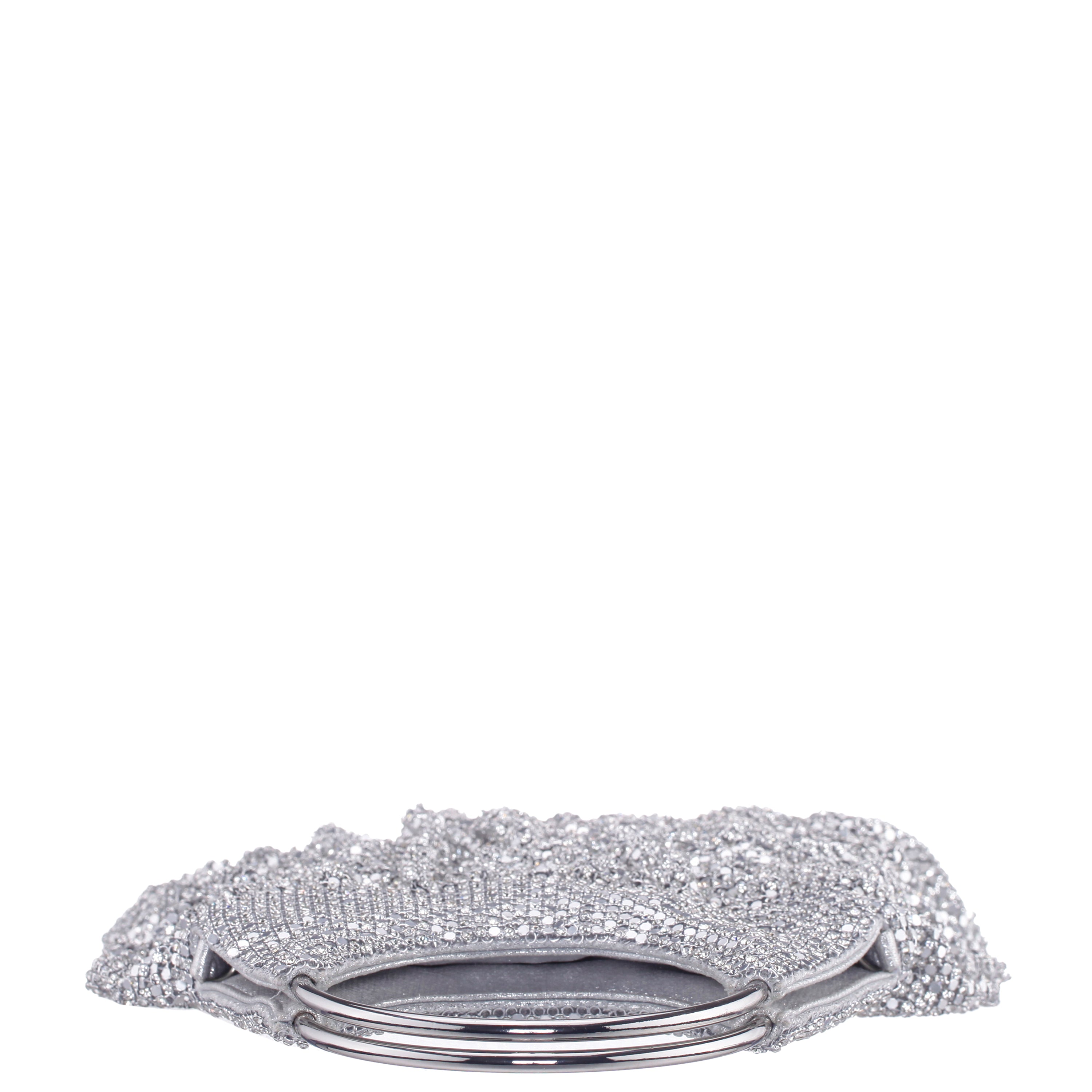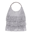 HIPPY by Nina is a playful showstopper designed to bring movement, sparkle, and a touch of retro flair to any evening look. This unique pouch bag features a dramatic three-tiered crystal mesh ruffle design, catching the light with every step. Crafted from aluminum mesh and glass crystal, it delivers both texture and shimmer in a compact yet standout silhouette. The 3.5" handle and 18" chain strap offer versatile styling options, while a magnetic snap closure keeps your essentials tucked away in style.
