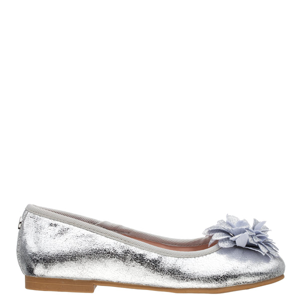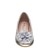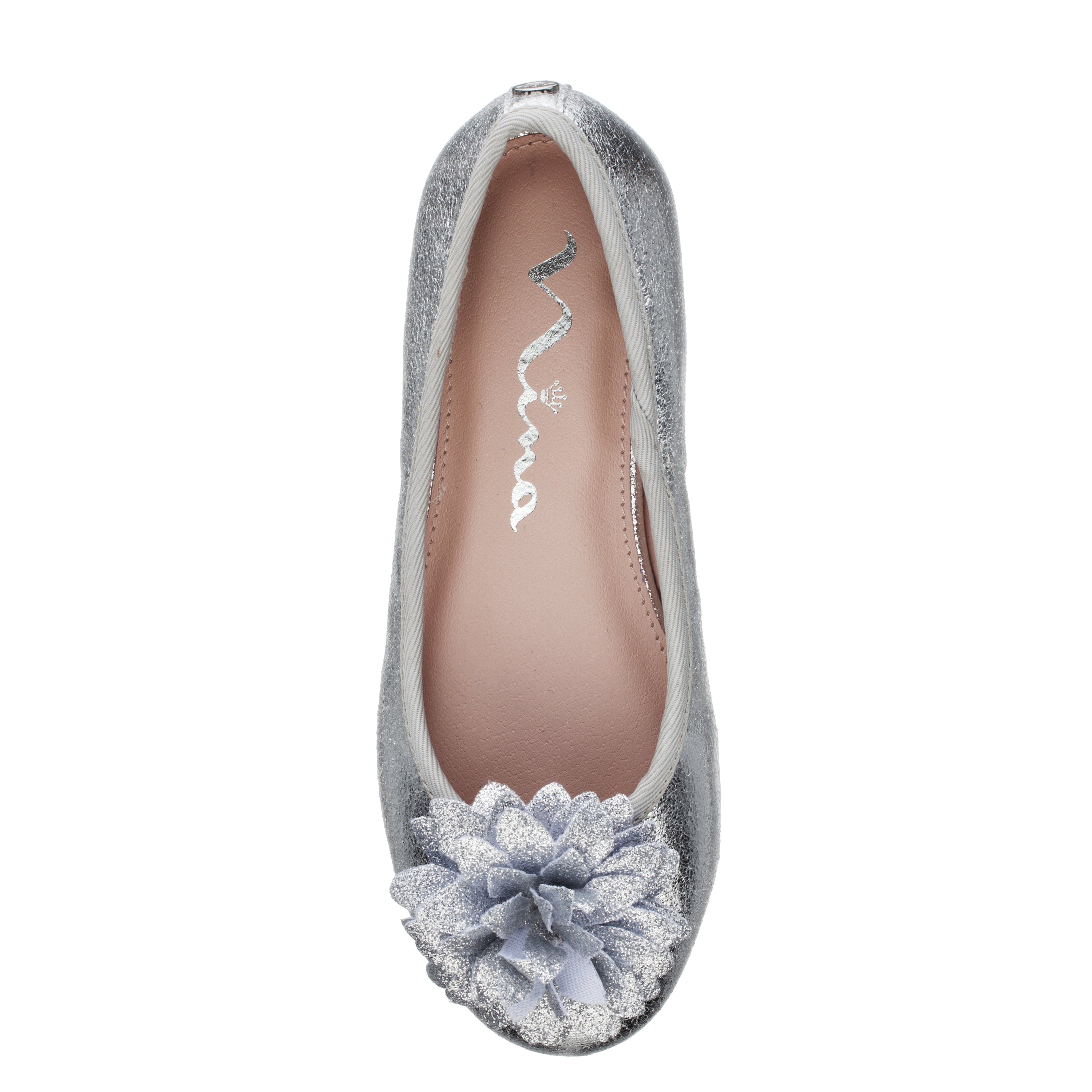 Add a touch of magic to every outfit with JEANESSE by Nina Shoes, a sweet and shimmering girls ballet flat made to shine. Featuring a radiant crackle metallic finish and a standout 3-D glitter flower, this special-occasion flat is the perfect pairing for all her spring dresses. With a soft memory foam insole and a flexible non-slip sole, JEANESSE keeps her comfortable and stylish from morning celebrations to evening twirls.