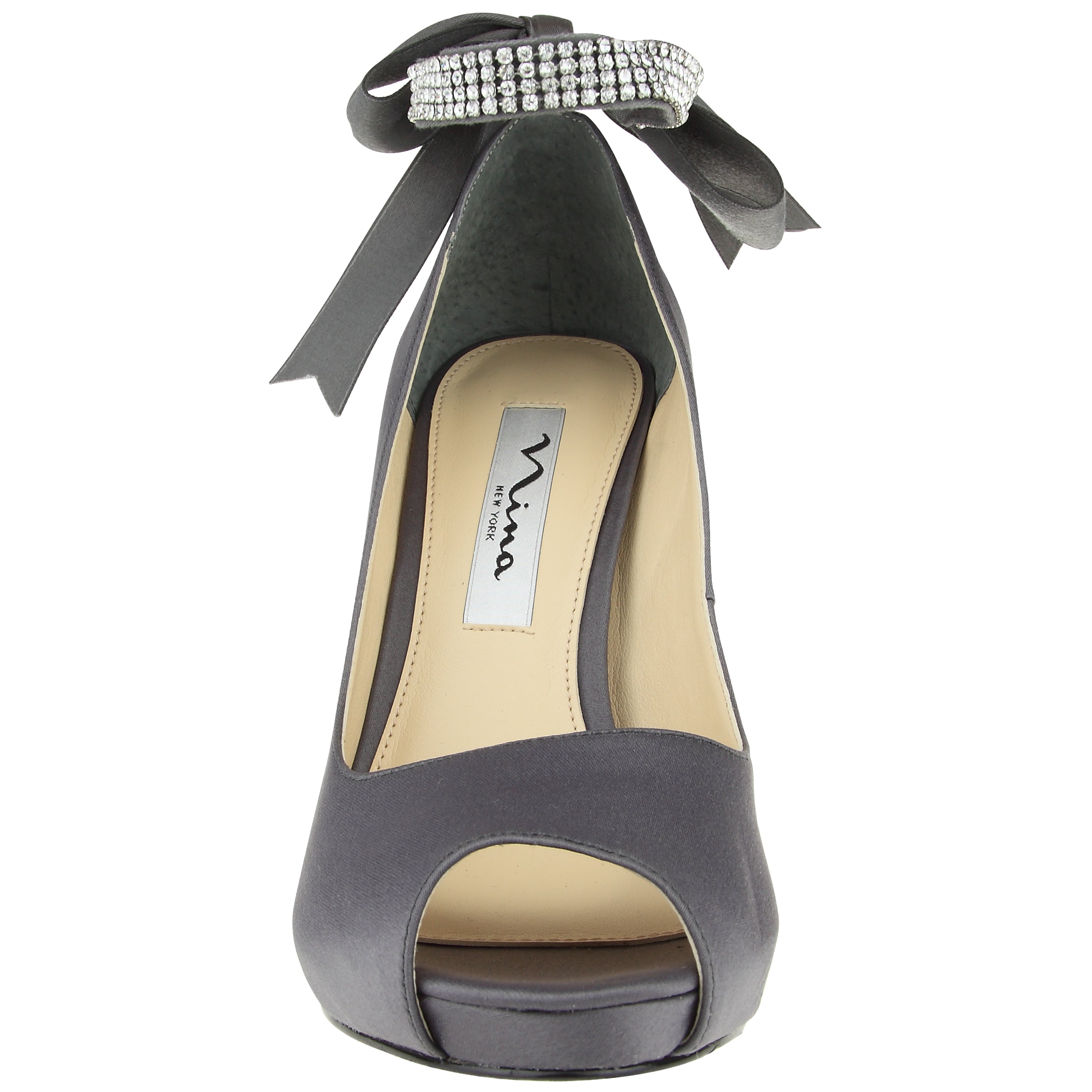 STEEL SATIN PEEP-TOE PUMP WITH RHINESTONE ADJUSTABLE ANKLE RIBBON