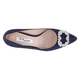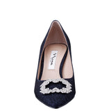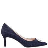 NAVY TEXTURED METALLIC MID-HEEL PUMPS WITH JEWELED BUCKLE