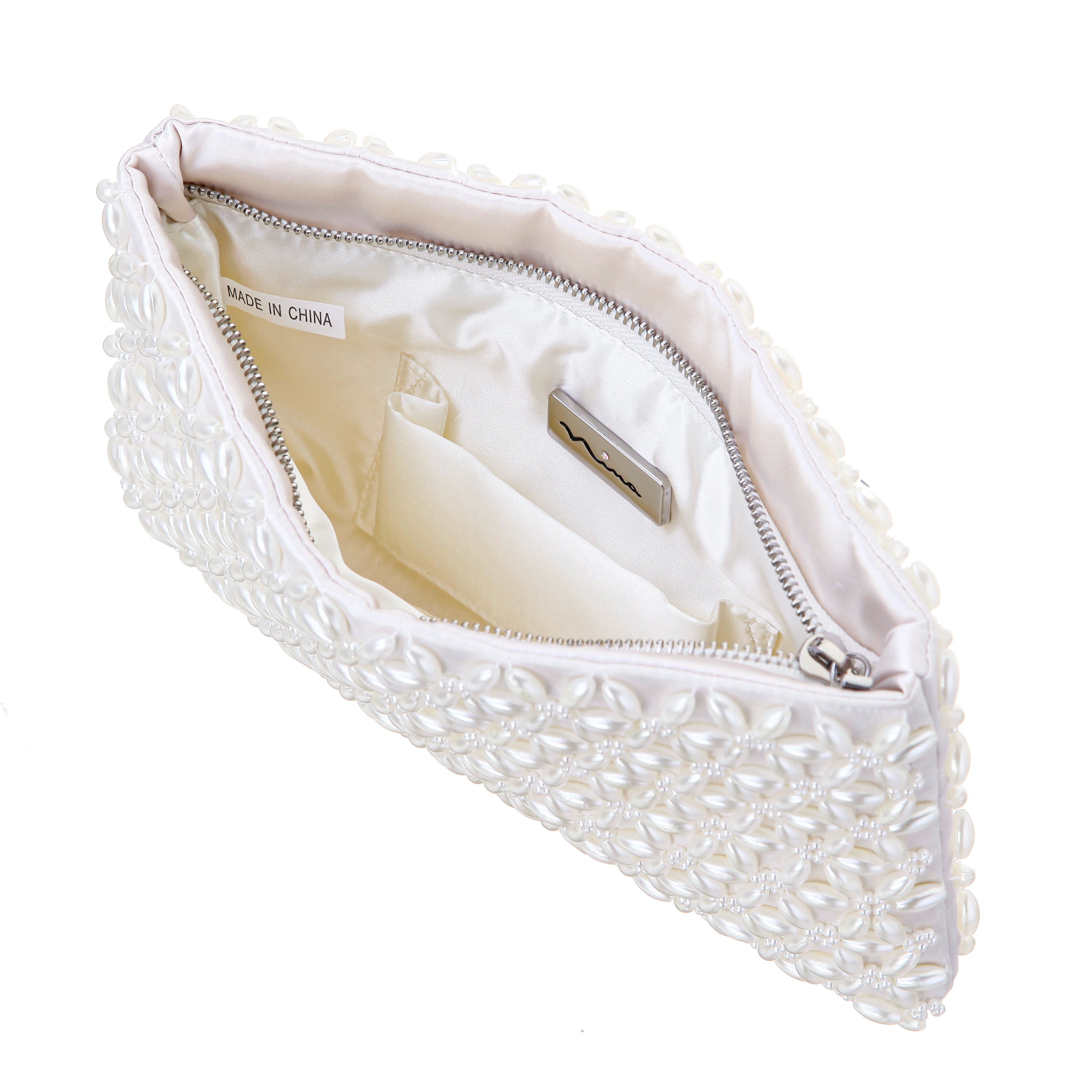 RIVERA is an elegant and romantic floral-beaded pearl clutch, designed to bring a touch of timeless beauty to any evening ensemble. Featuring delicately arranged plastic pearls in a floral pattern, this clutch exudes sophistication and charm, making it the perfect accessory for weddings, galas, and elegant soirées. The sleek top-zip silhouette offers a modern yet classic touch, while the satin synthetic fabric lining ensures a luxurious interior feel. Designed for versatility, RIVERA by Nina can be carried as a handheld clutch, or worn as a shoulder bag with its silver-tone hardware chain strap. With its refined floral beadwork and polished craftsmanship, this clutch is a statement piece for those who appreciate exquisite details and feminine elegance. For complementary styles, explore our satin shop or browse our newest arrivals.