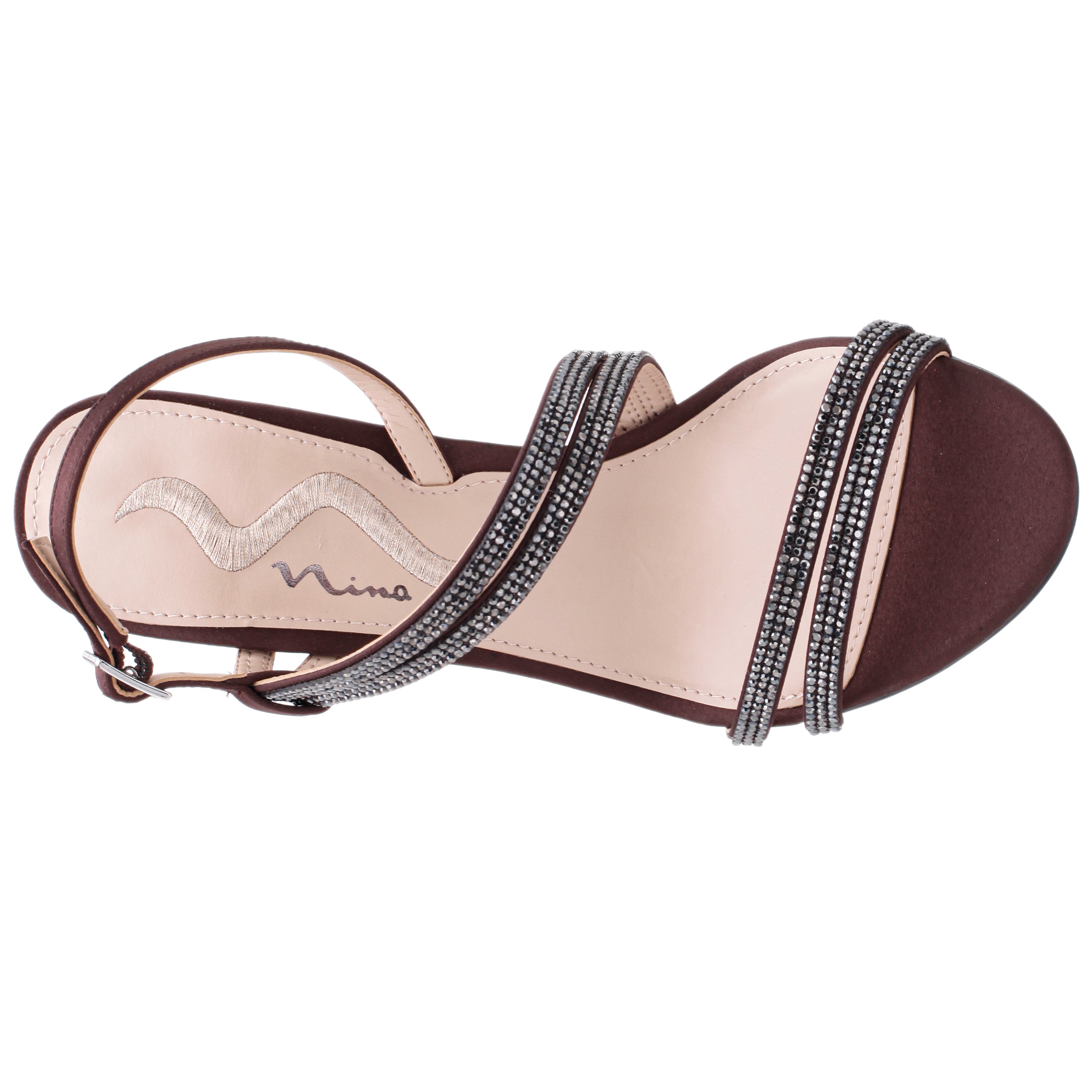 Sparkling crystals cover the straps and heel of this party-ready, high-heel sandal. Set on a block-heel, Sabetha by Nina is a must-have for any fashion shoe-wardrobe. From a LBD to jeans, this will be your 'go-to' sandal for all your looks.