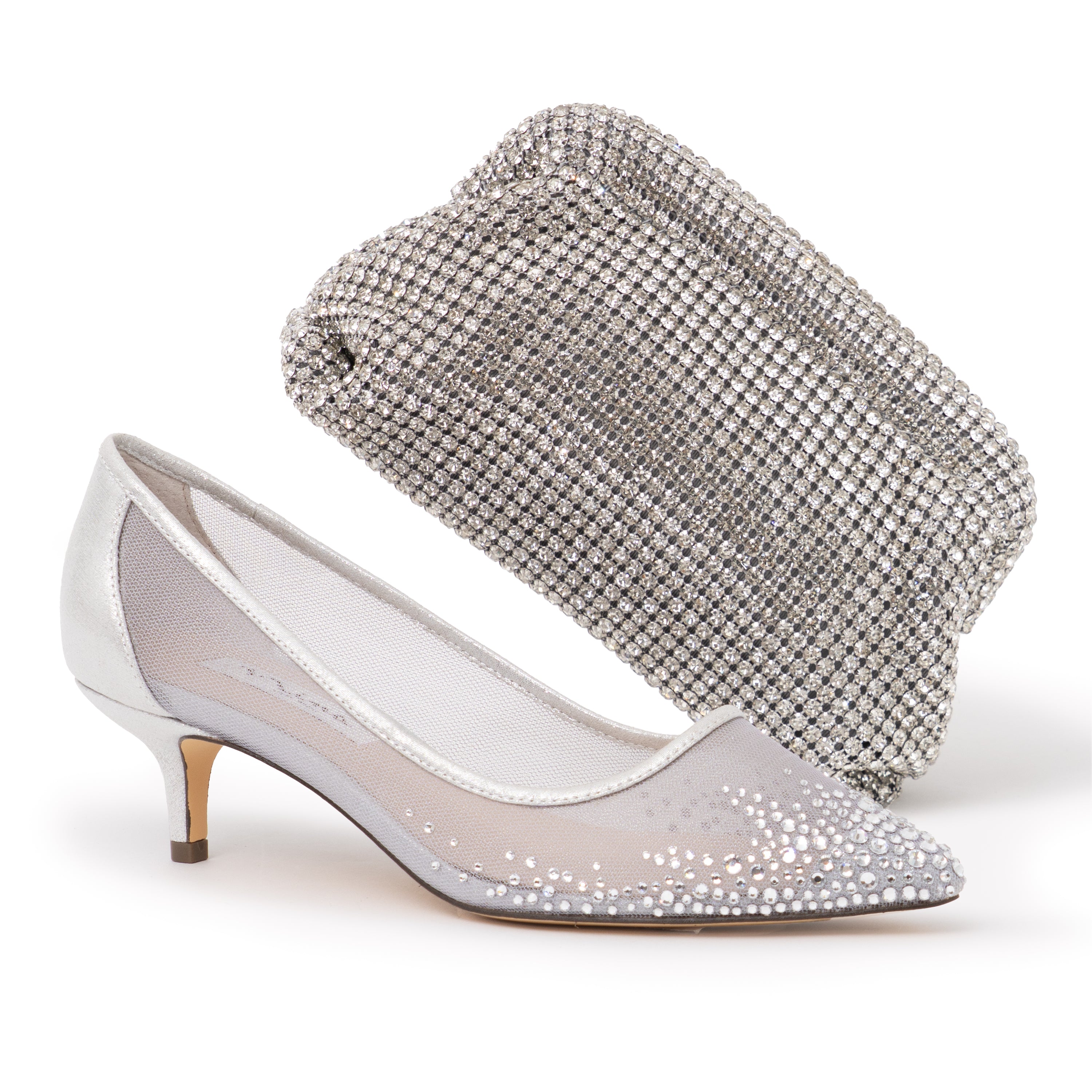 Tiny faceted crystals scattered across fine mesh, twinkle and shimmer on this elegant pump. Set on a low-heel, Sofie by Nina has a party-ready finish and a lady-like style.