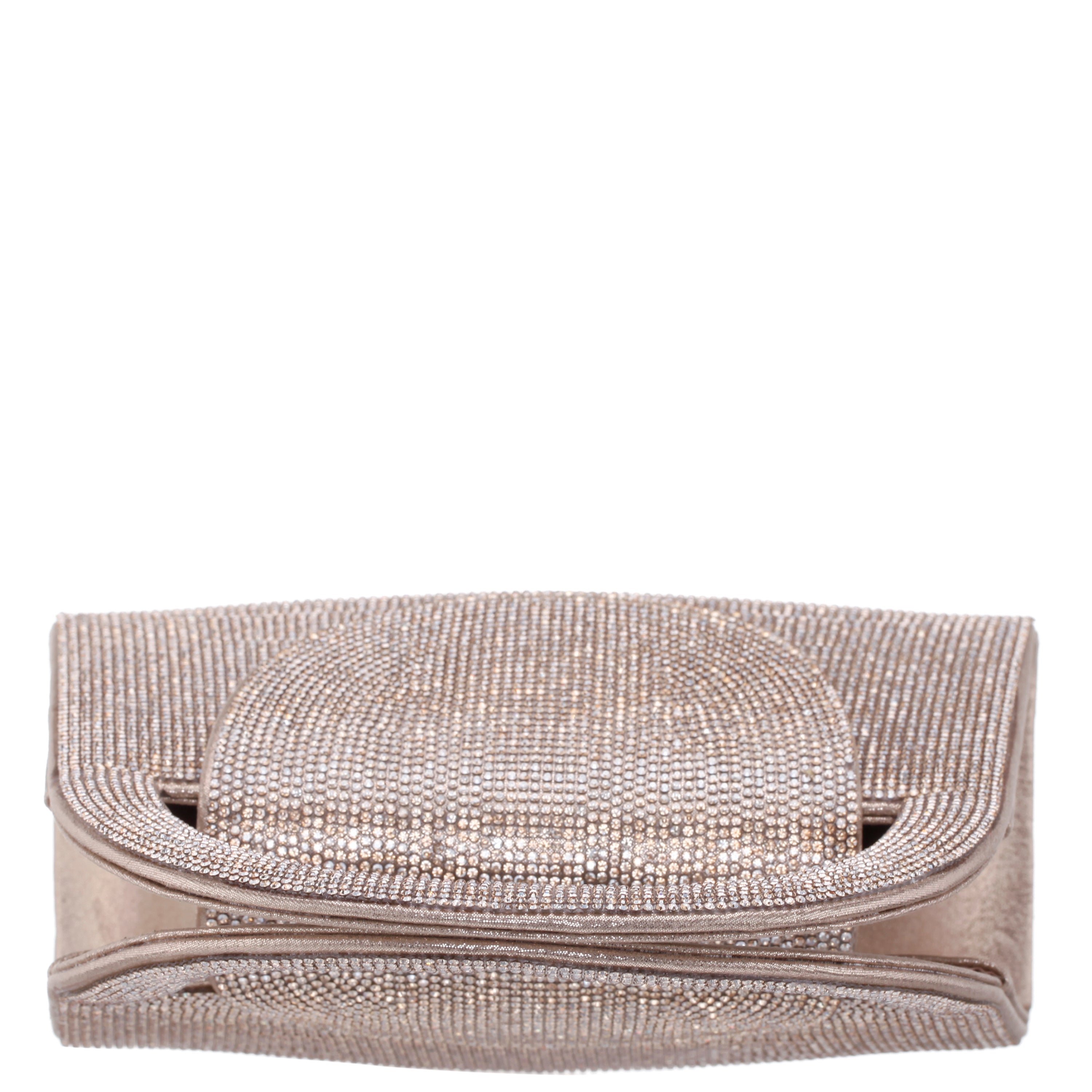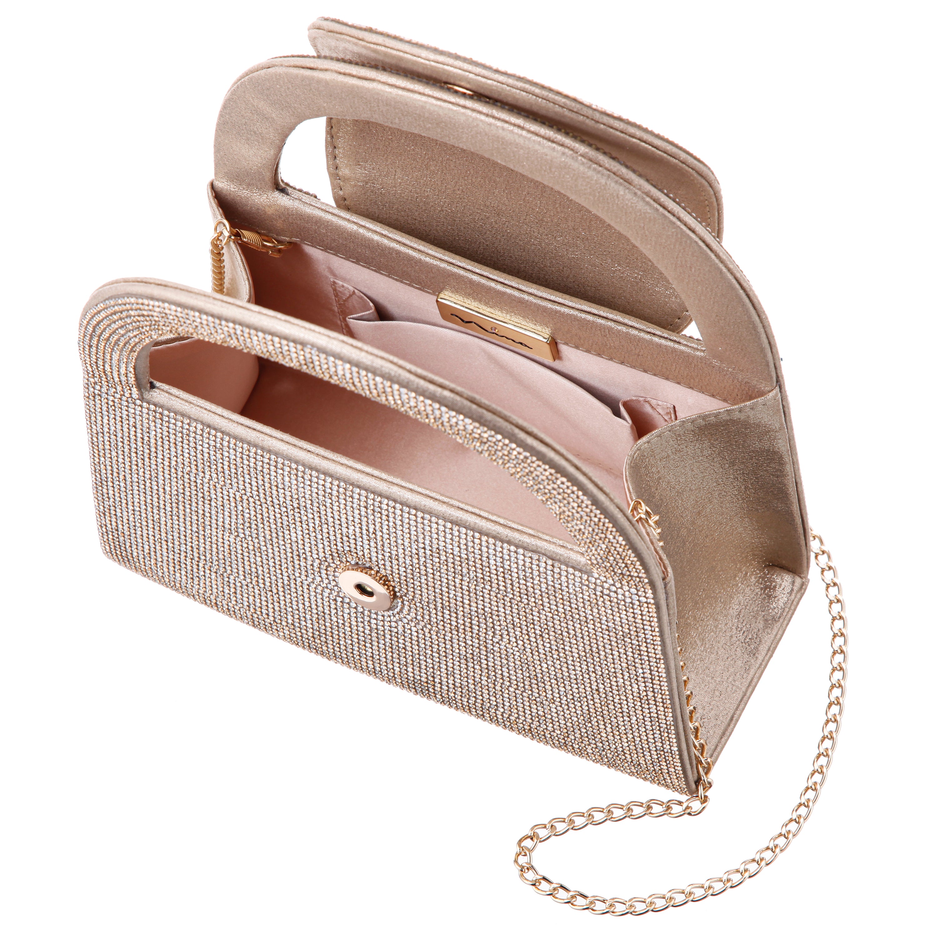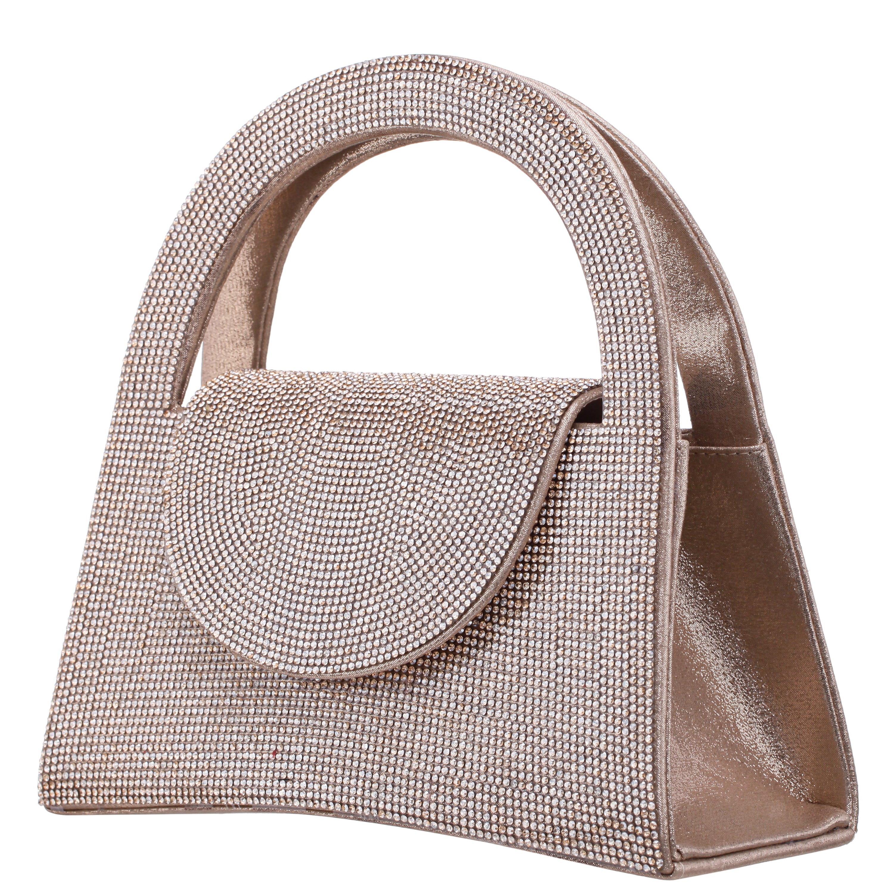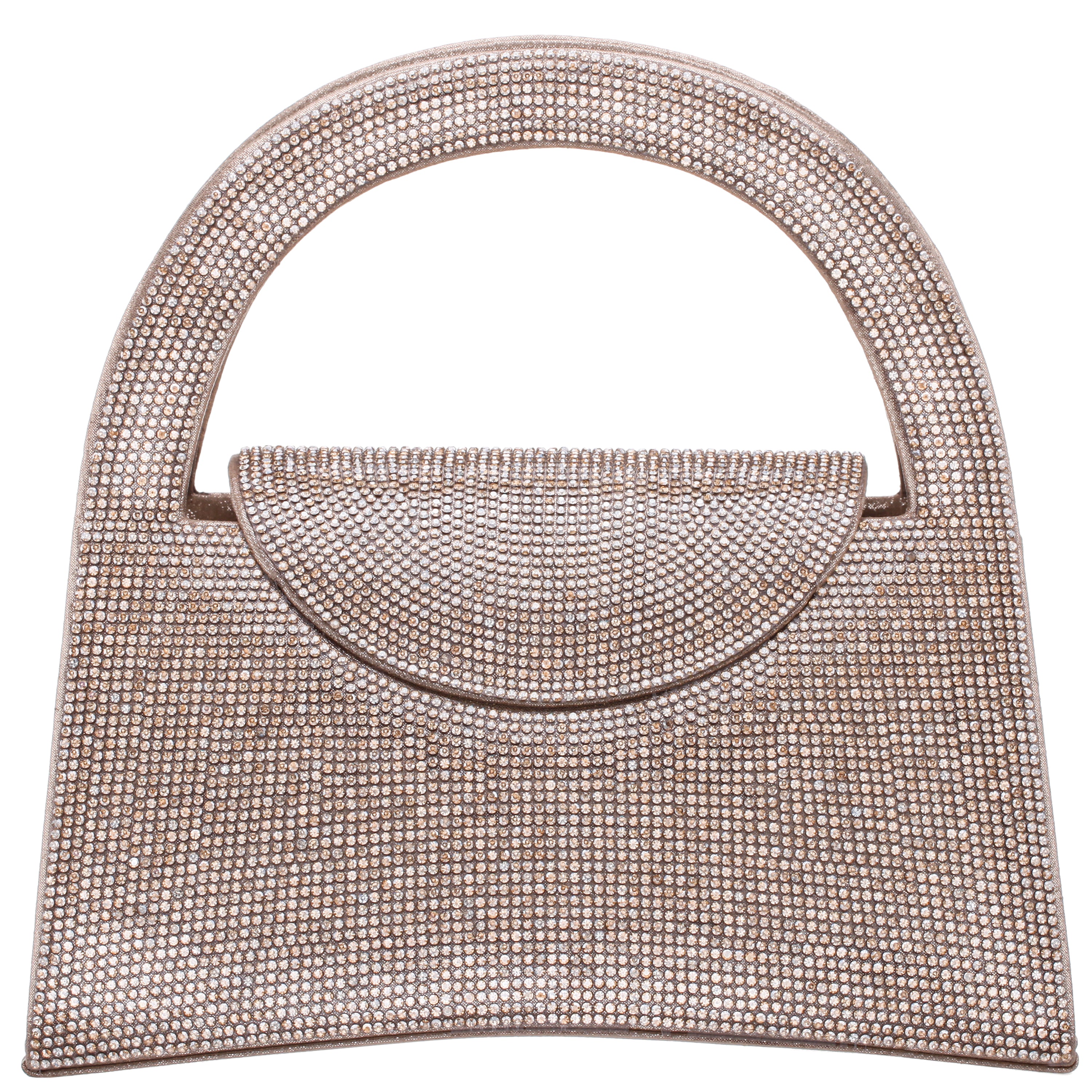 Dazzling crystals enliven this satchel evening bag crafted in a structured silhouette topped with cutout handles and outfitted with an optional chain strap.
