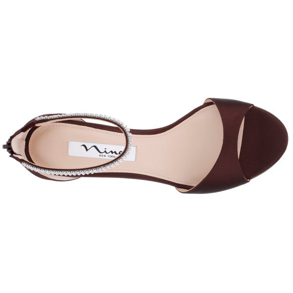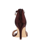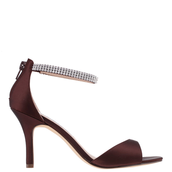 DARK CHOCOLATE SATIN WITH CRYSTAL ANKLE-BRACELET SANDALS AND ZIPPER ENTRY ON A MID-HEEL